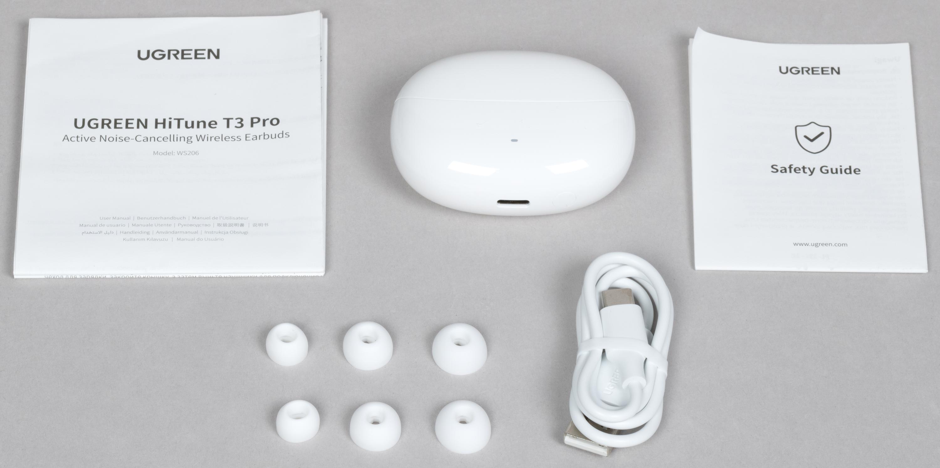 В комплект поставки входят наушники в кейсе, документация, кабель USB-A — USB-C для зарядки длиной 30 см, три пары сменных силиконовых насадок.