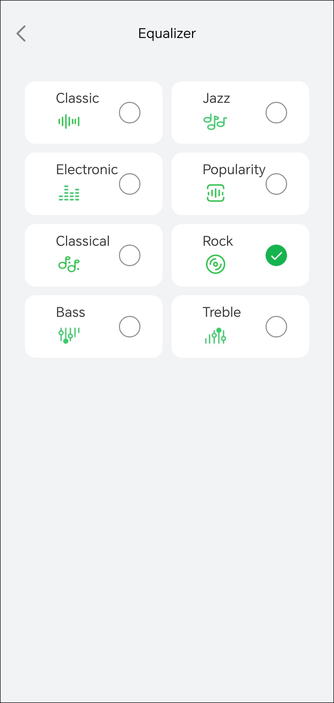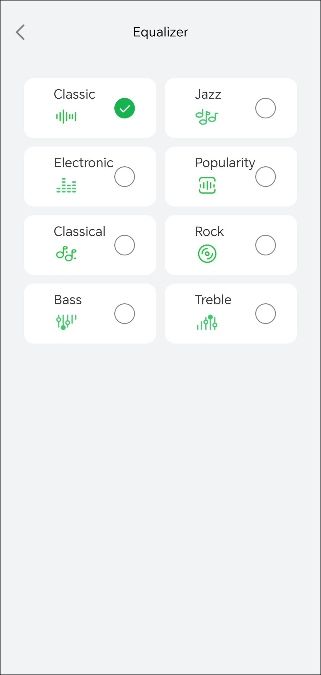 На главном экране можно увидеть уровень зарядки аккумулятора каждого из наушников, там же находится модуль управления системой шумоподавления. Изменения агрессивности его работы, как у Ugreen HiTune H6 Pro, тут не предусмотрено — «шумодав» можно только включить или выключить. Там же задействуется режим «звуковой прозрачности», в котором микрофоны гарнитуры транслируют окружающие звуки в динамики — пригодится, чтобы контролировать происходящее вокруг на прогулке или пробежке, например. Производитель вновь предлагает восемь пресетов встроенного эквалайзера, при этом возможности создавать свои не предусмотрено, что немножко жаль.