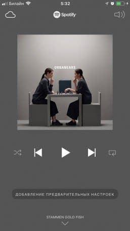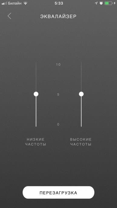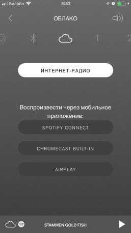 В приложении доступен выбор источников звука, медиаплеер, «подхватывающий» информацию о треке при воспроизведении через Wi-Fi или Bluetooth или управляющий Spotify-плейлистом, информация о колонке и качестве связи, а также простой двухполосный эквалайзер.