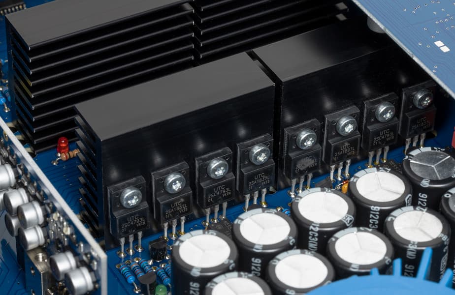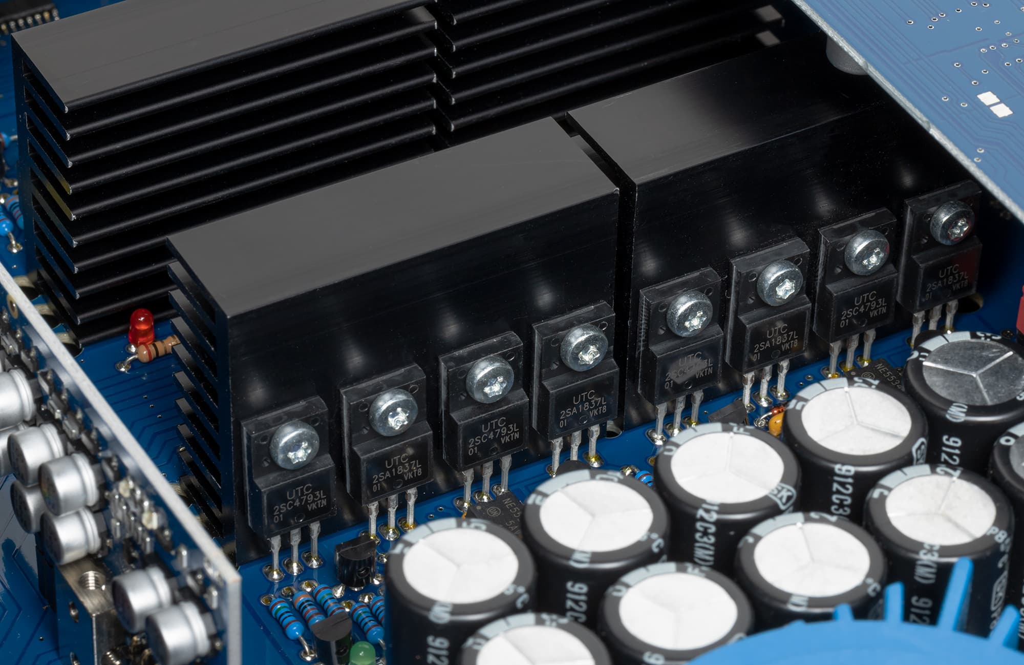 Практически по центру платы видна аналоговая часть прибора, представляющая собой полностью дискретную балансную схему на 16 транзисторах в канале.