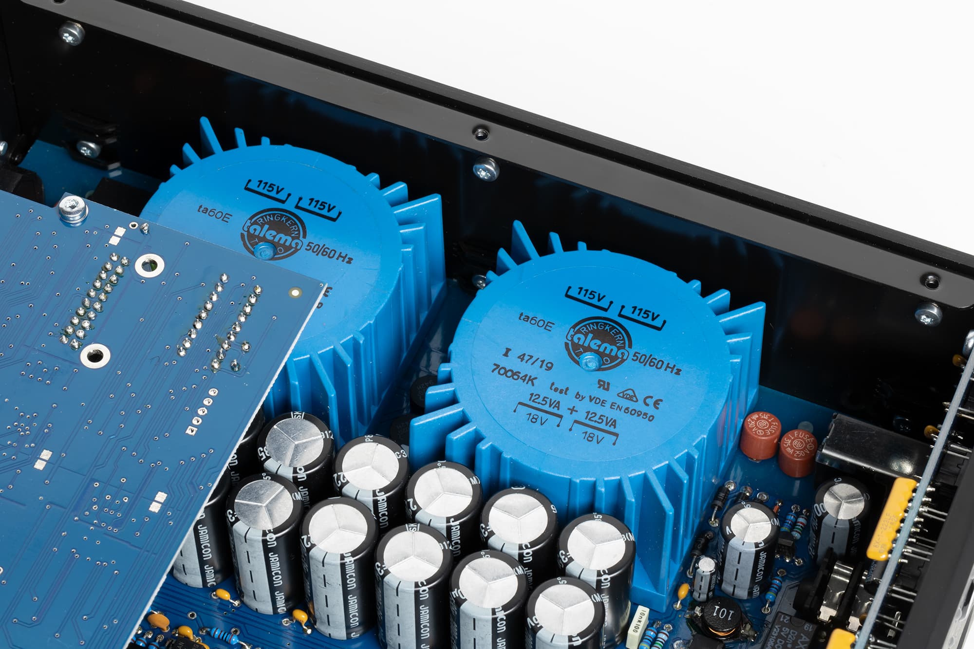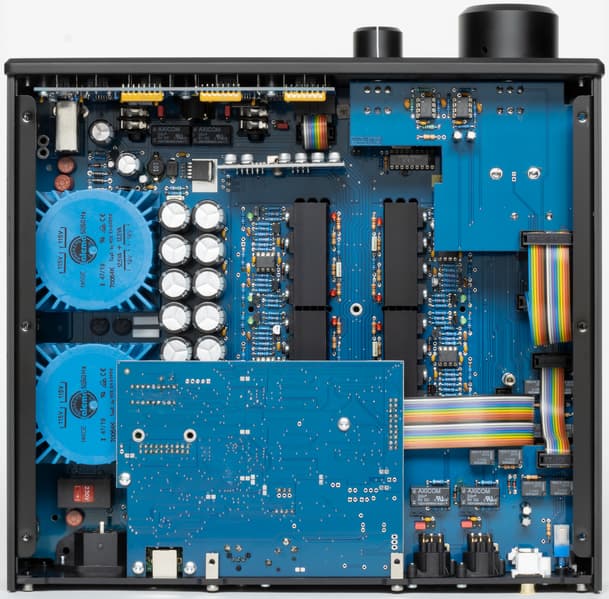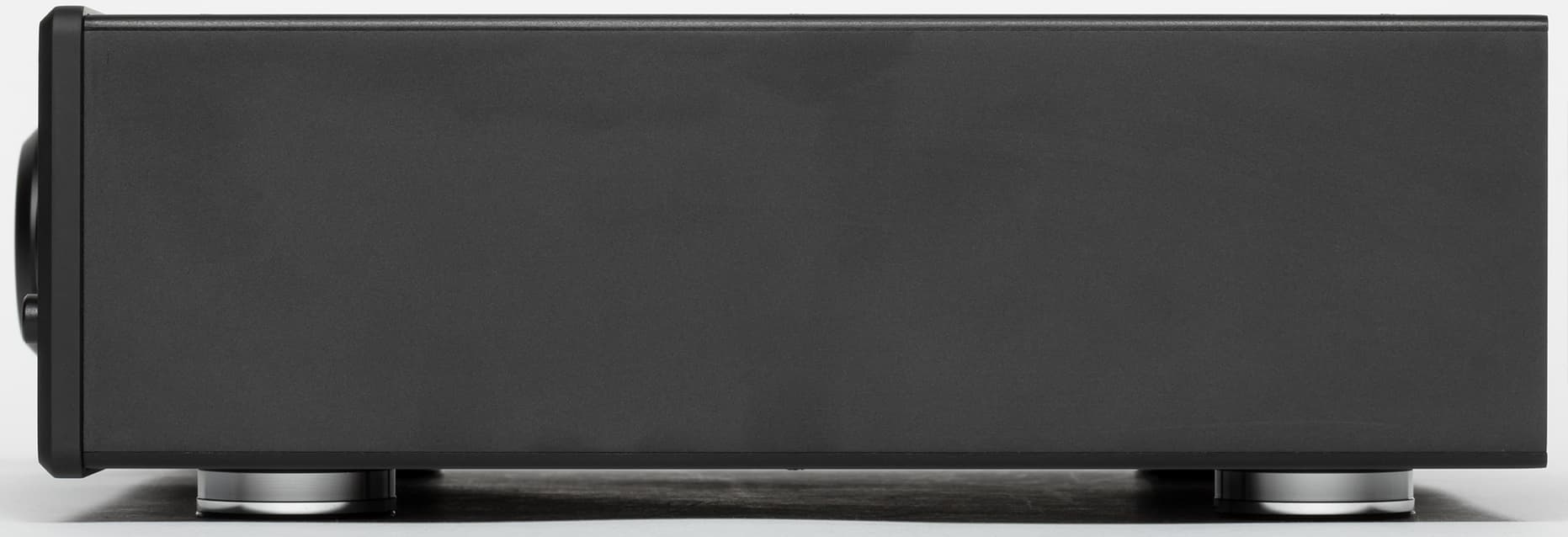 За регулировку громкости отвечает моторизованный потенциометр Alps RK27. Еще один такой же, но без мотора, производит изменение баланса. Работает потенциометр прекрасно, но для особо страждущих доступна модификация устройства под названием Violectric DHA V590 Pro, где громкость изменяется с помощью 256-ступенчатого набора сопротивлений с релейным переключением.