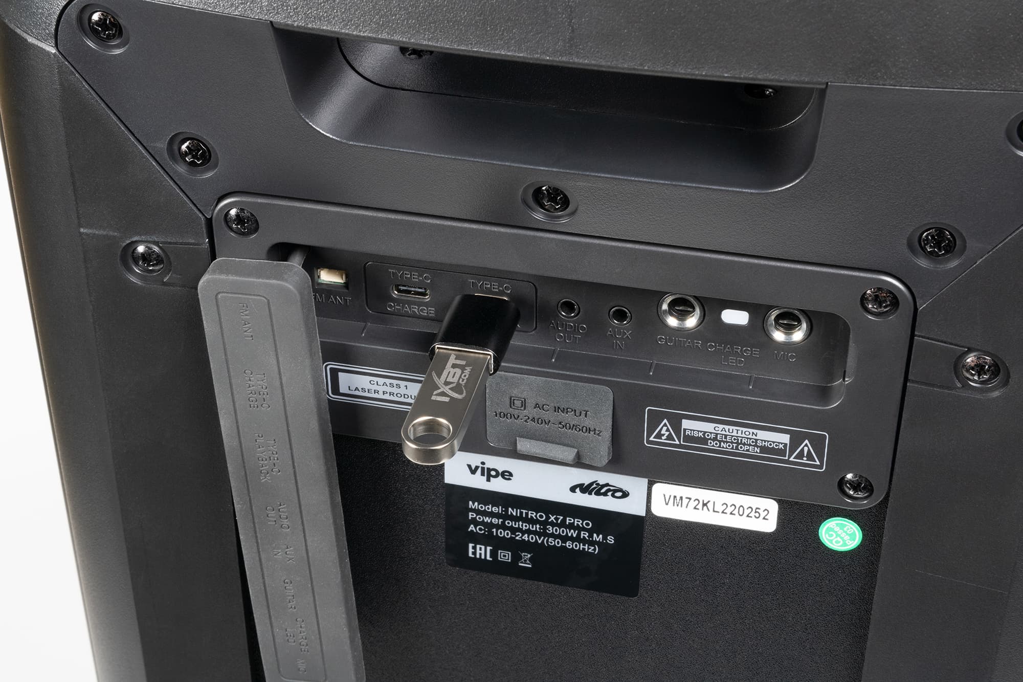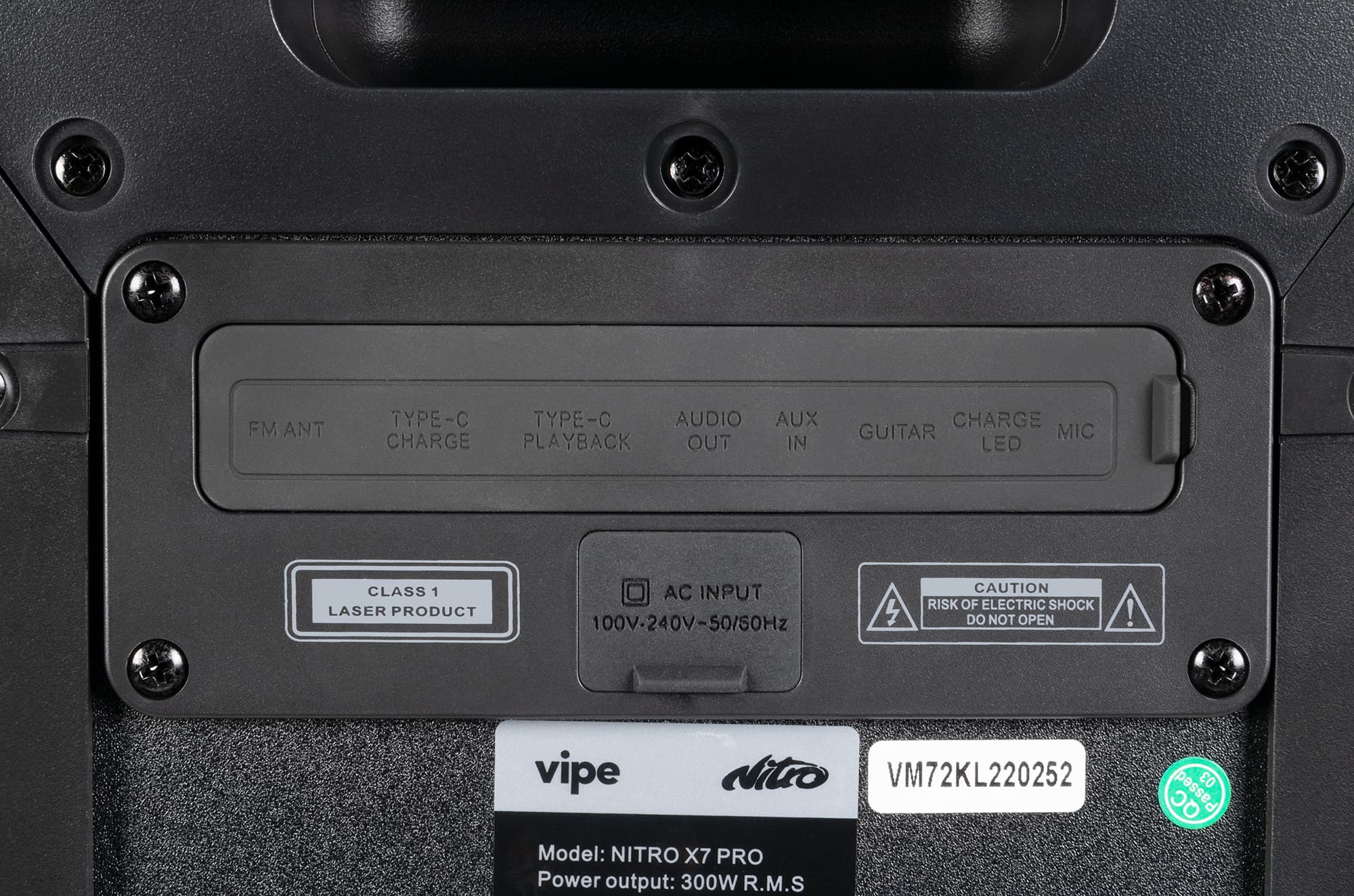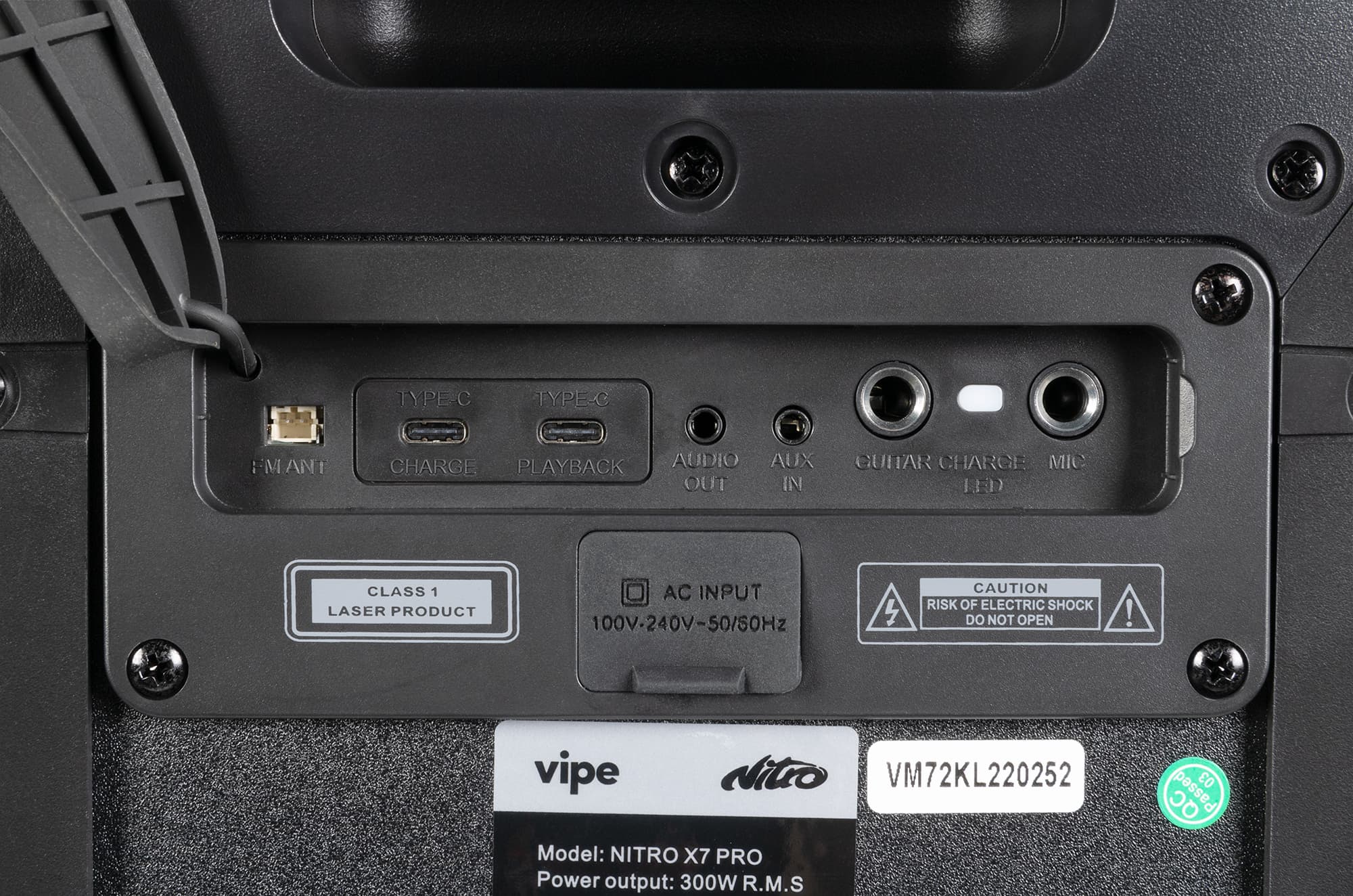 Масса музыкальной системы Vipe Nitro X7 Pro составляет внушительные 25 кг, а заявленная мощность — 300 Вт. За автономную работу в течение 10 часов отвечает свинцовый аккумулятор, предусмотрена возможность подключения гитары и микрофона, что потенциально делает Vipe Nitro X7 интересной для уличных музыкантов и просто любителей спеть пару песен где-нибудь на природе. Помимо этого есть, конечно, Bluetooth-подключение, FM-приемник, возможность воспроизведения аудиофайлов с USB-носителей.