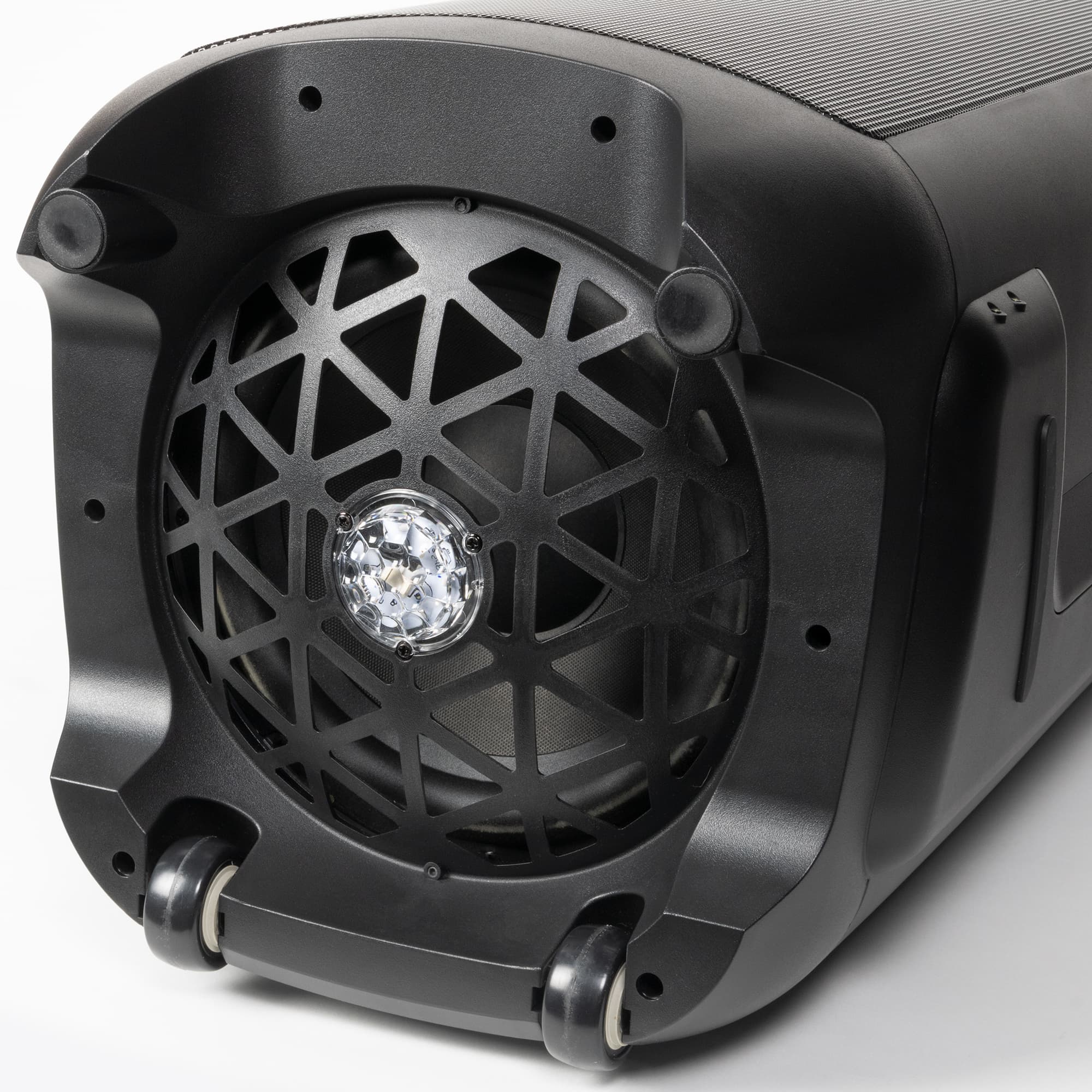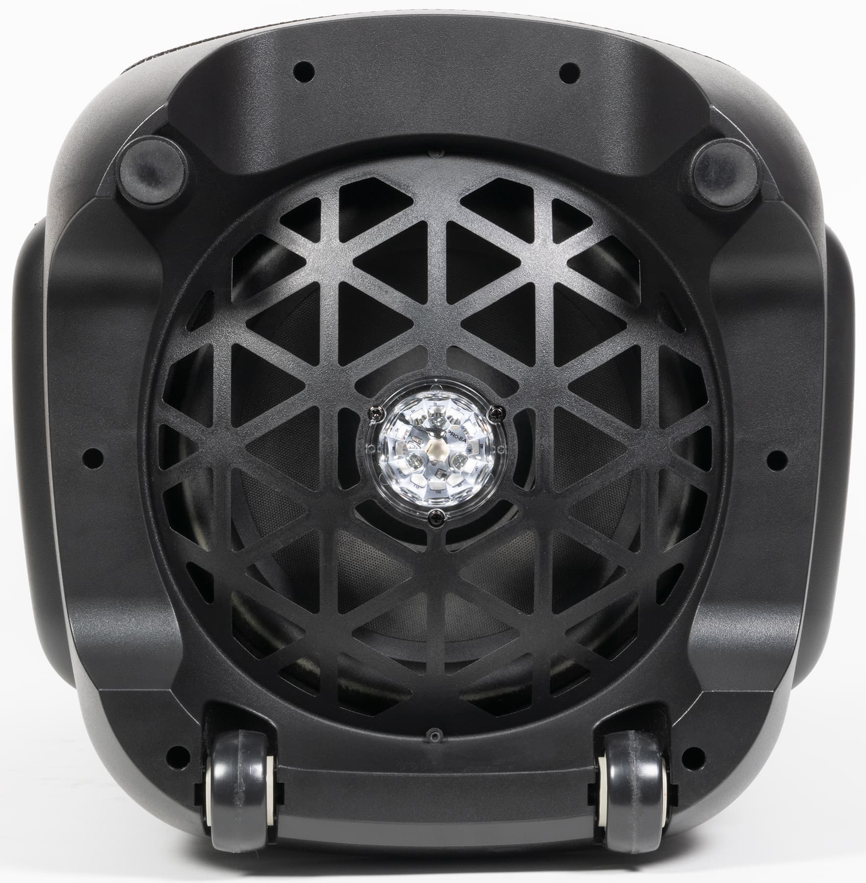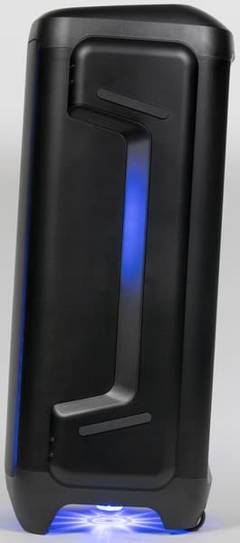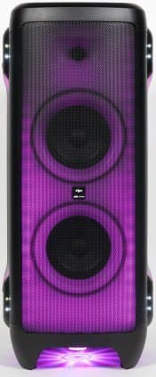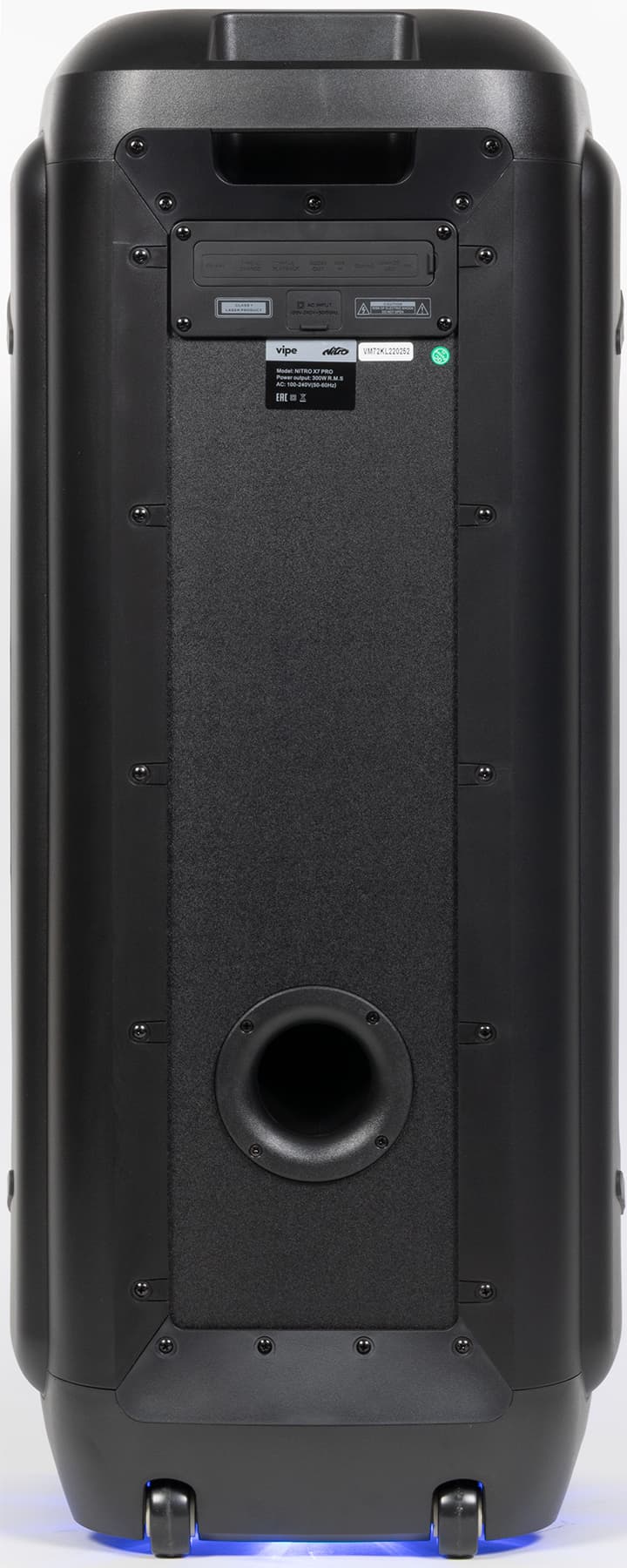 Выглядит Vipe Nitro X7 Pro очень эффектно — в этом ей точно не откажешь. Подсветка передней панели равномерная и занимает почти всю площадь, не занятую динамиками. Также подсвечиваются торец колонки и боковые грани. Размеры корпуса — 362×890×360 мм, внешний его слой выполнен из пластика, внутренний — из MDF. Масса получилась соответствующая — 25 кг. То есть колонка, конечно, автономная, да и в багажник влезет. Но называть Vipe Nitro X7 Pro портативной можно лишь условно, перемещать ее с места на место сложно. К счастью, таскать ее на себе не обязательно — для перемещения предусмотрены колесики, не хватает лишь выдвижной ручки как у чемоданов.