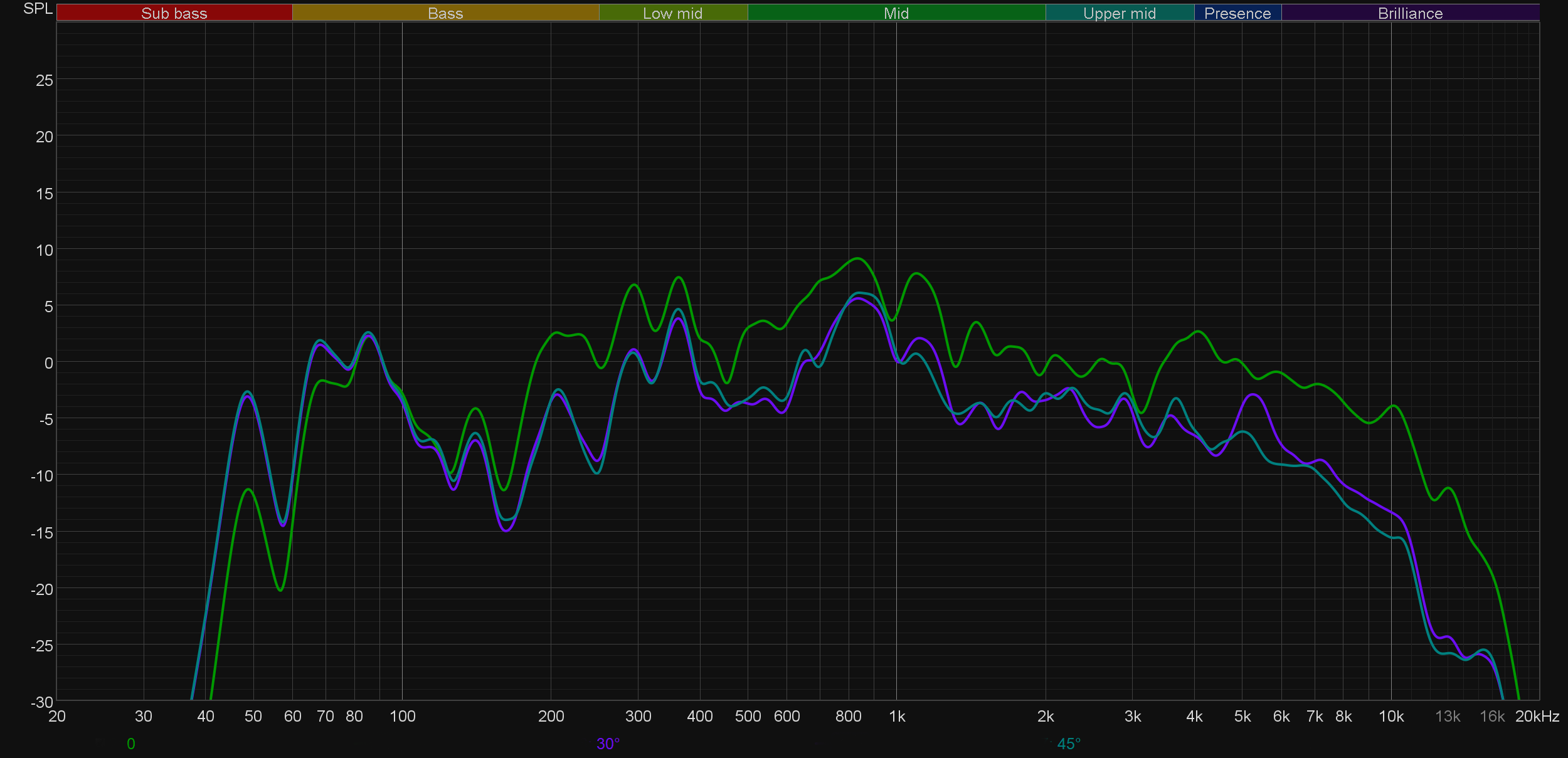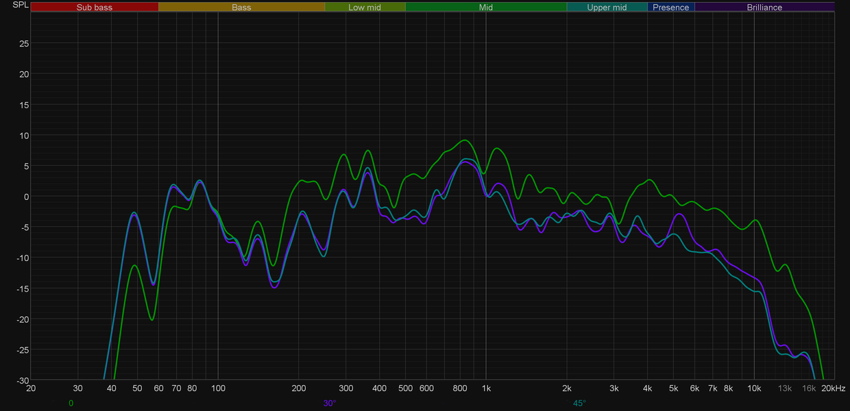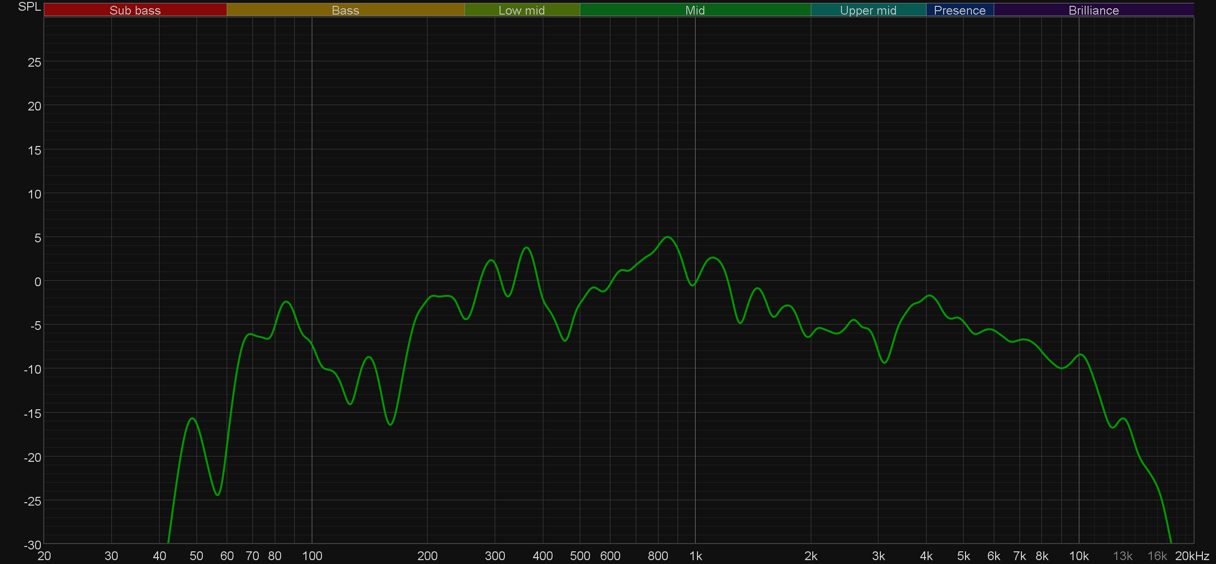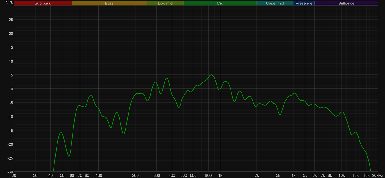 Традиционно проиллюстрируем сказанное с помощью графиков АЧХ, полученных при размещении измерительного микрофона на расстоянии 1 метр по нормали к плоскости ВЧ-динамика. Первым делом попробуем использовать проводное подключение и выберем пресет эквалайзера Flat, потенциально дающий самое «ровное» звучание.