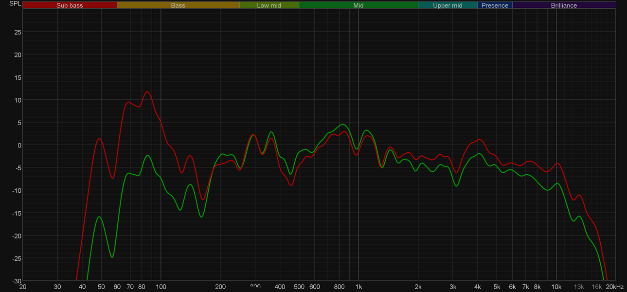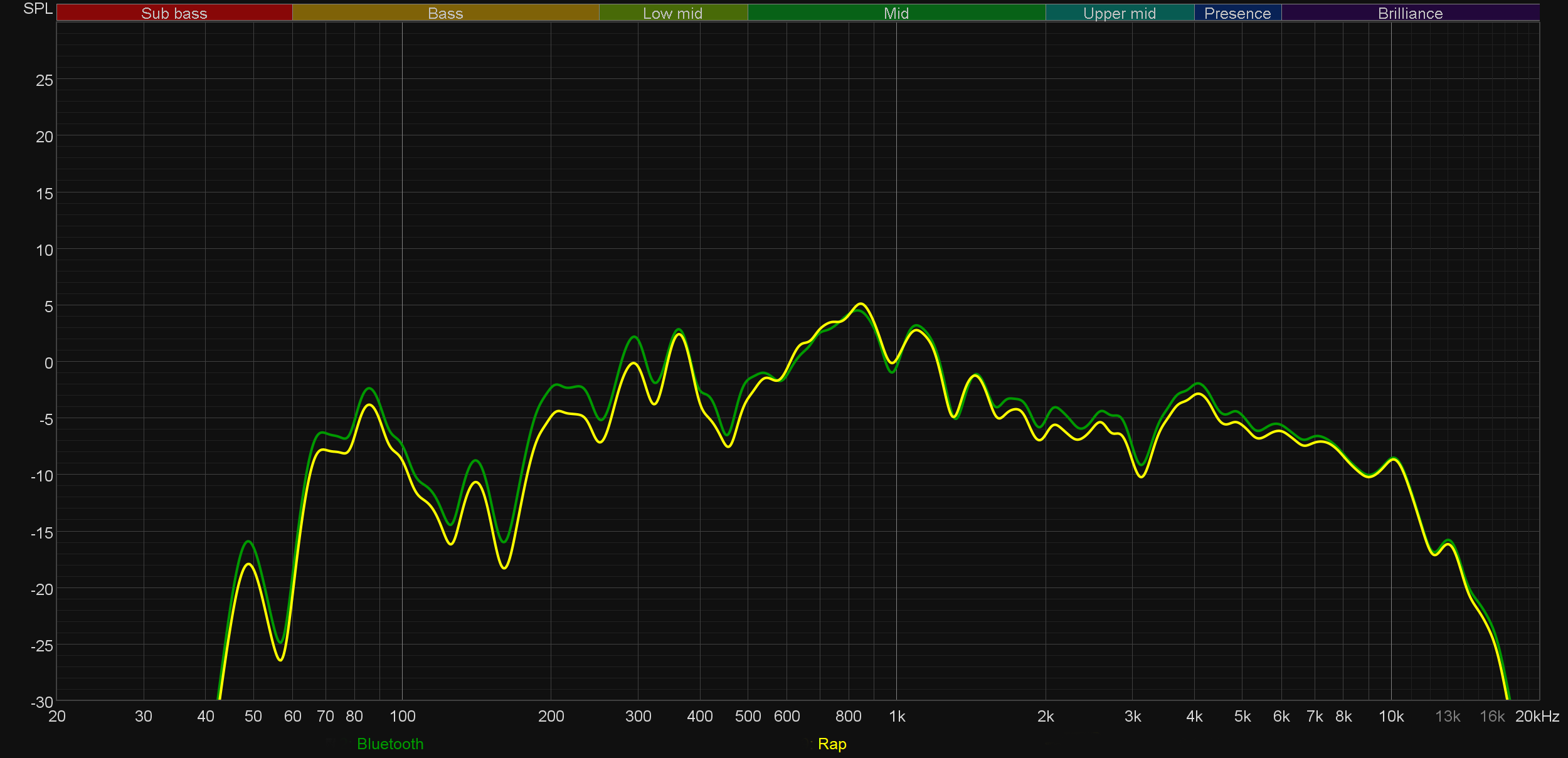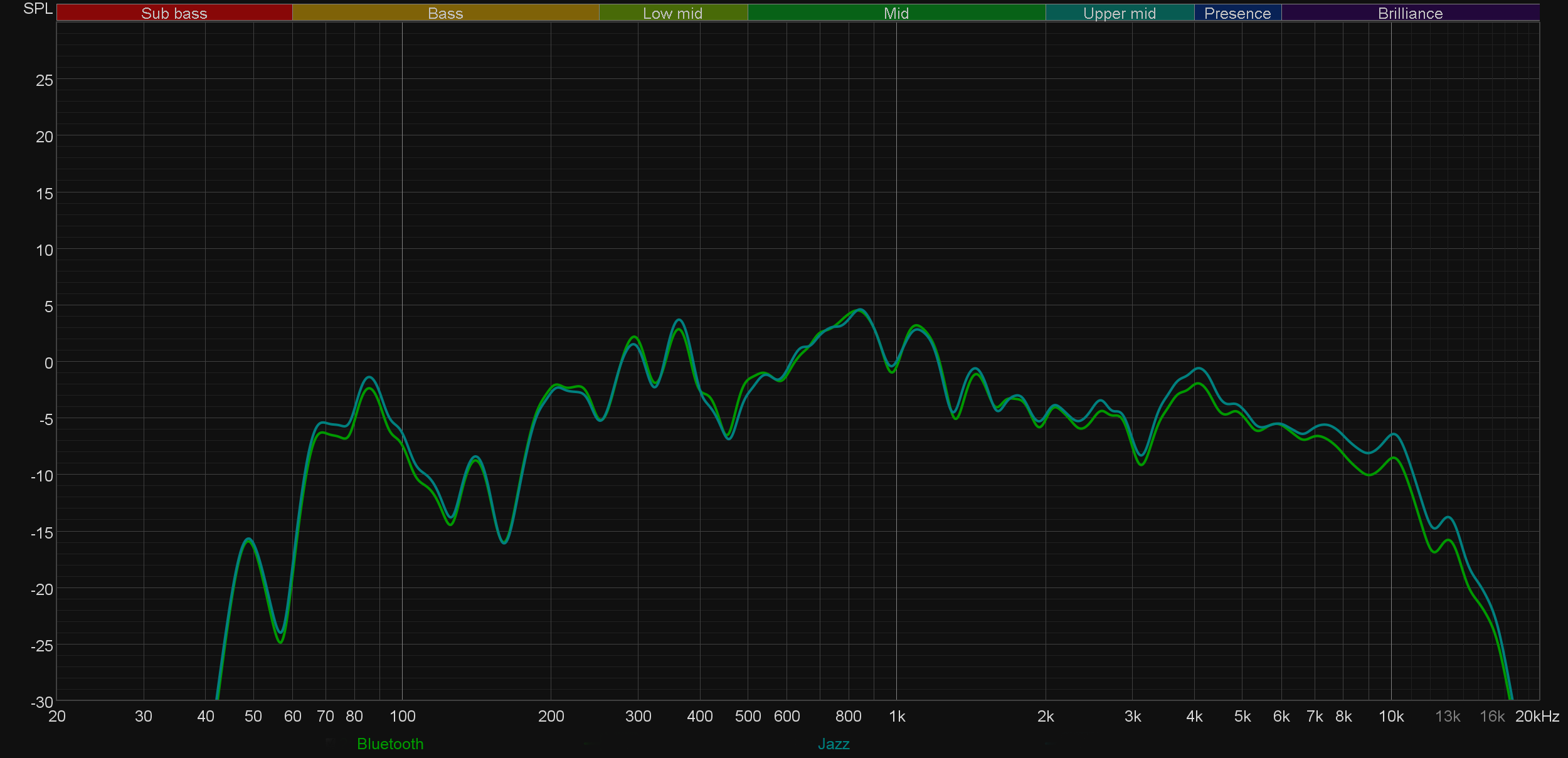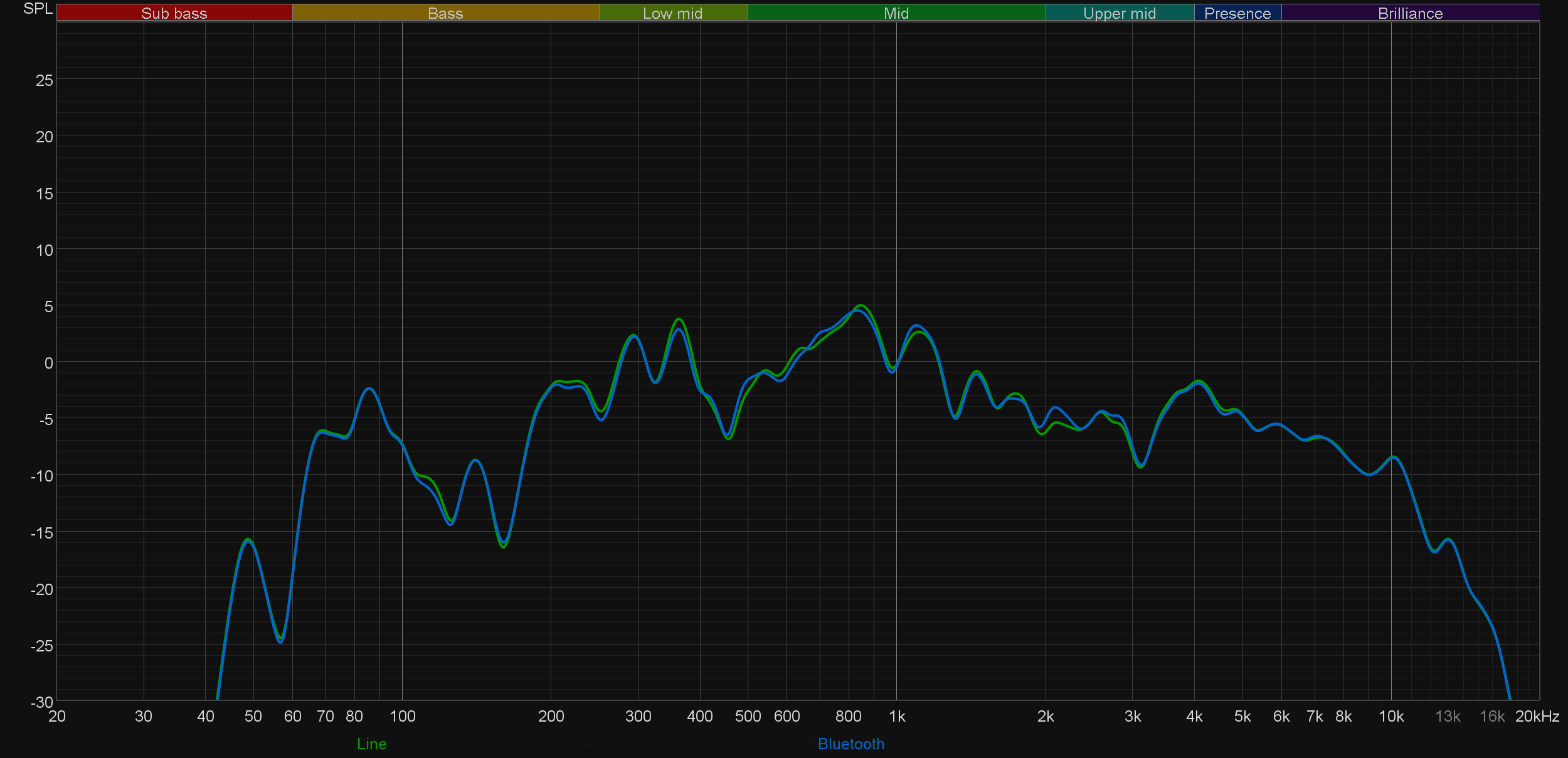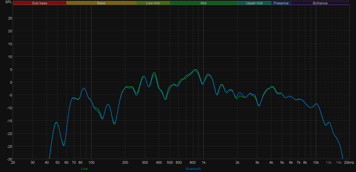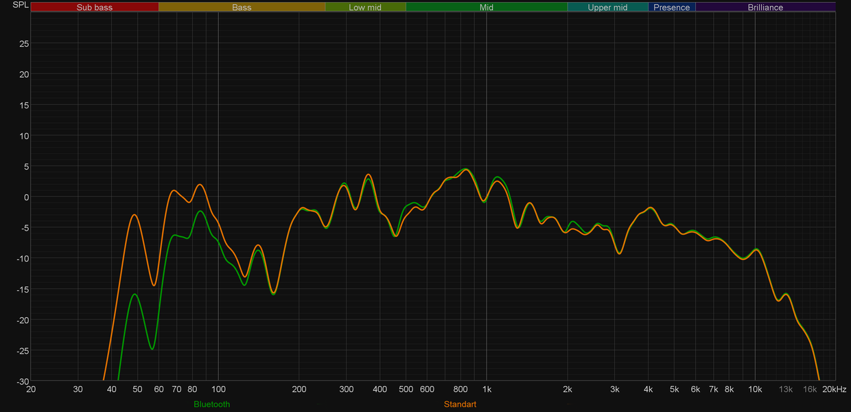 Всё, о чем мы говорили, прекрасно видно на графике. Акценты в районе 80 Гц и дальнейший провал ближе к нижней середине дают нам ощущение гулкости и «бубнения», середина далеко не самая «ровная»... всё вполне наглядно. На всякий случай сравним проводное и беспроводное подключения. Различия минимальны, смело останавливаемся на более удобном и часто используемом беспроводном.