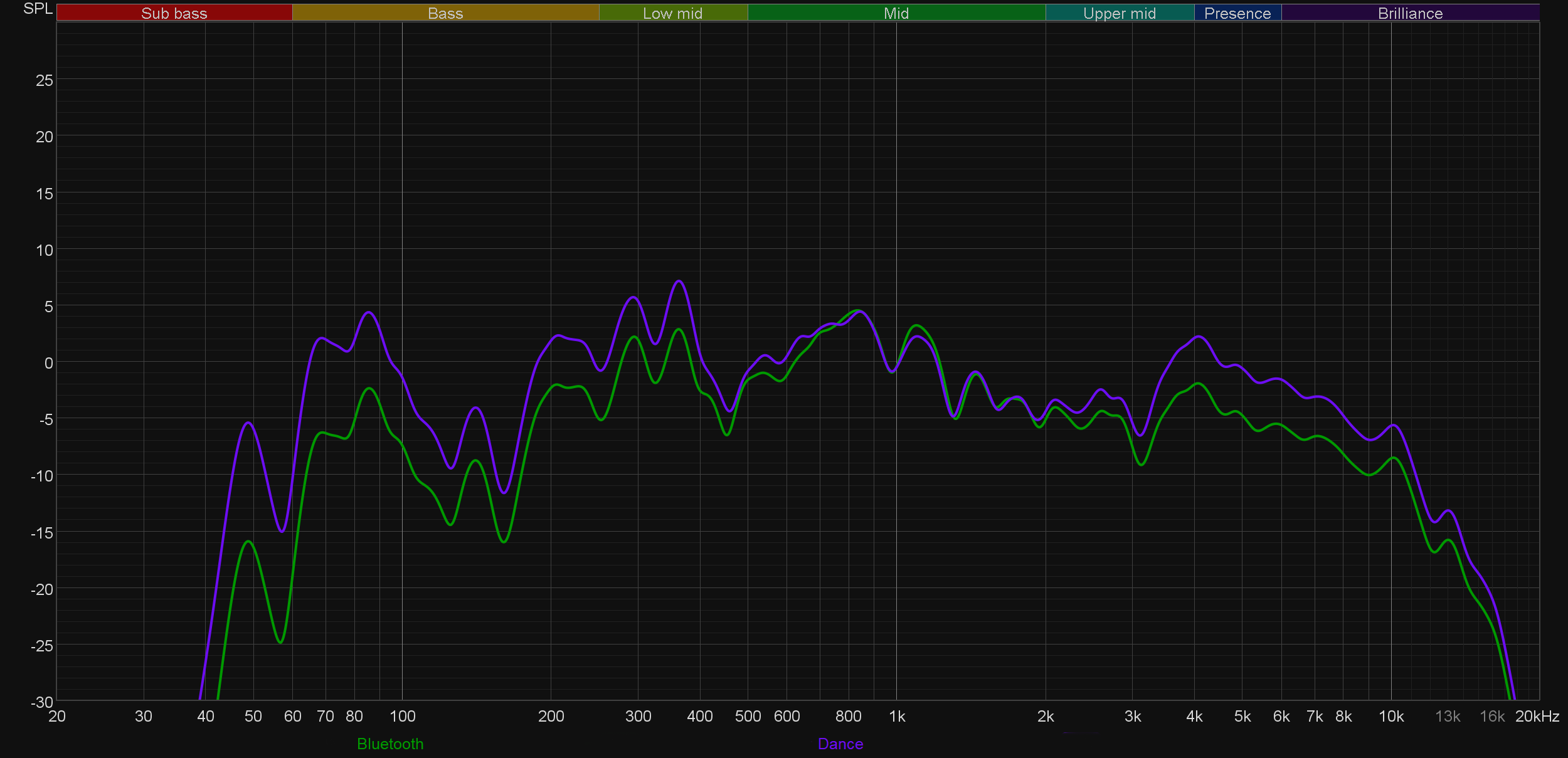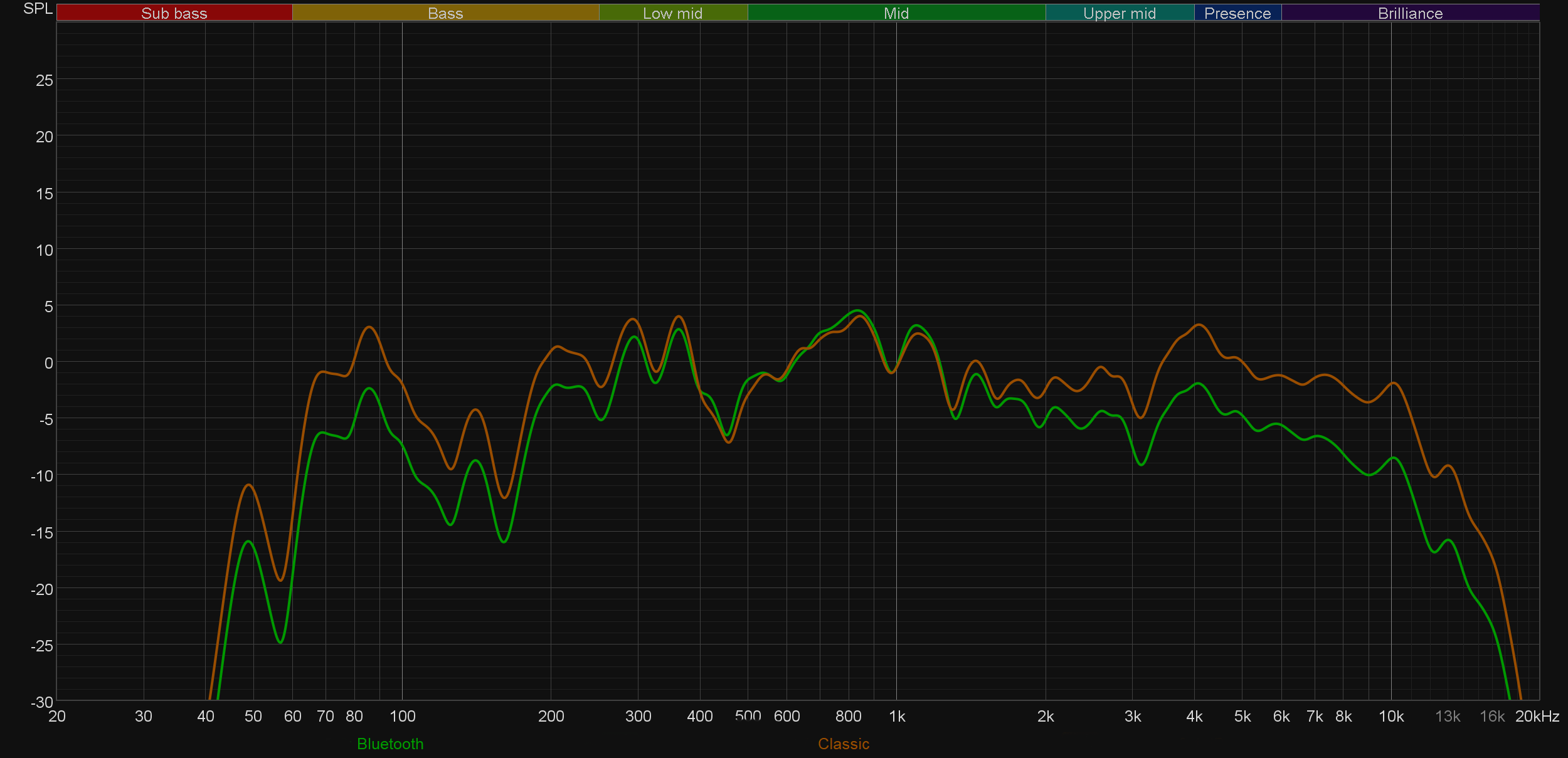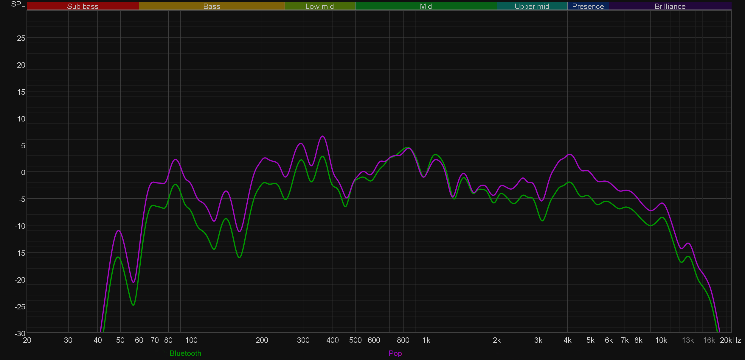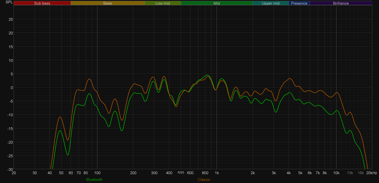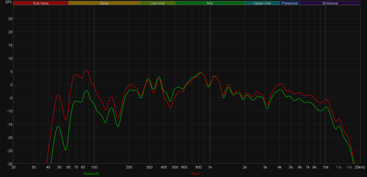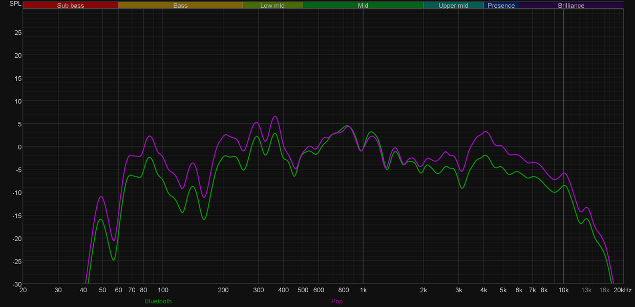 Всё, о чем мы говорили, прекрасно видно на графике. Акценты в районе 80 Гц и дальнейший провал ближе к нижней середине дают нам ощущение гулкости и «бубнения», середина далеко не самая «ровная»... всё вполне наглядно. На всякий случай сравним проводное и беспроводное подключения. Различия минимальны, смело останавливаемся на более удобном и часто используемом беспроводном.