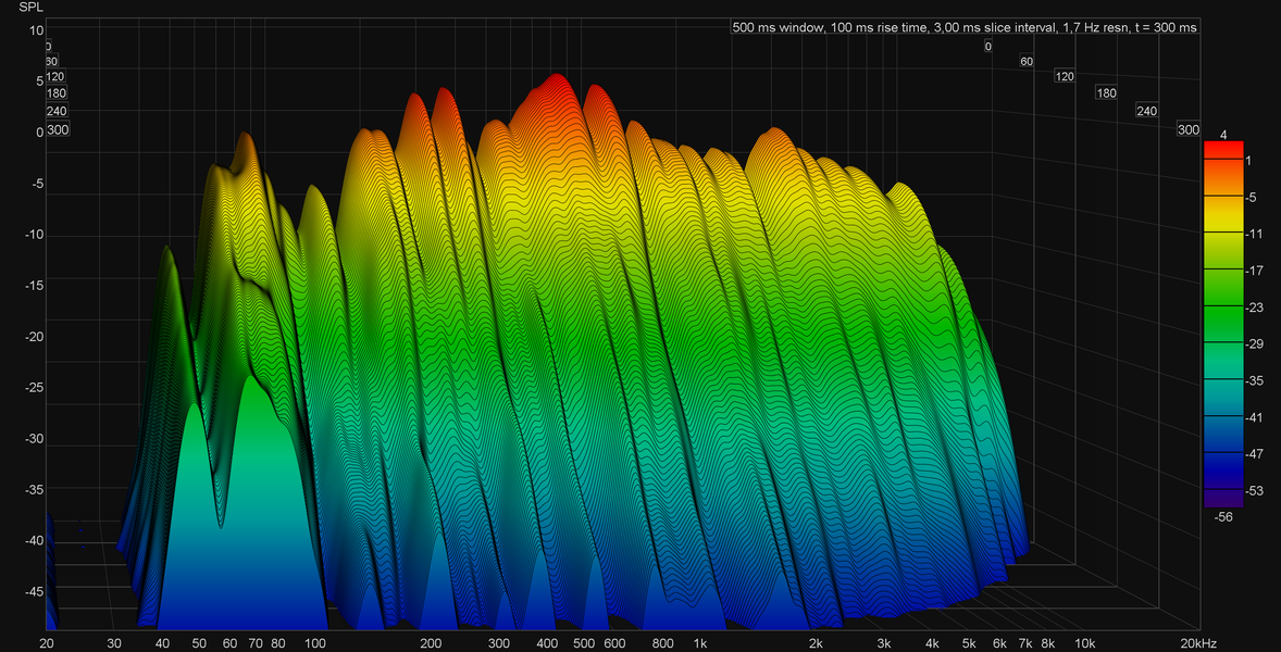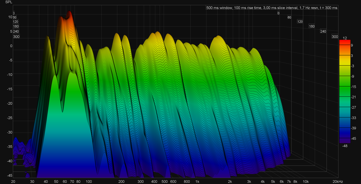 Гулкость баса хорошо видна на графике кумулятивного затухания спектра (он же «водопад» или waterfall), где явно видны пики от вибрации и внутренних резонансов корпуса, а также на частоте работы фазоинвертора — где-то в районе 70 Гц. При этом есть пики и на других частотах, также заметно влияющие на ощущение «гудения» колонки.