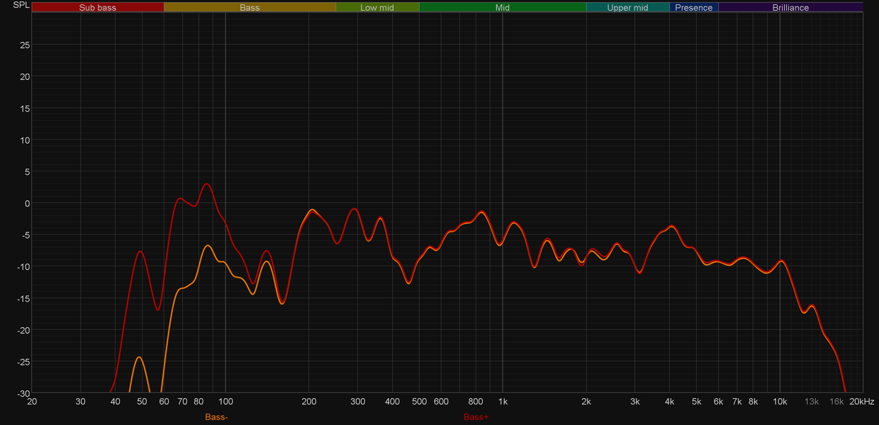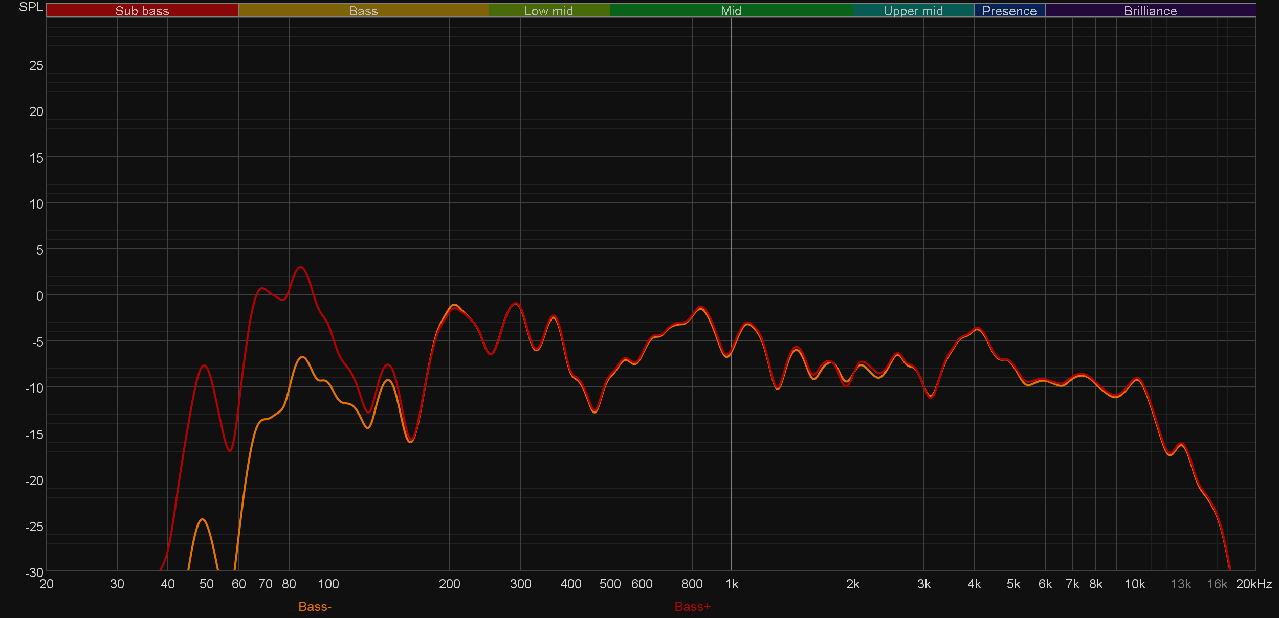 Встроенный регулятор НЧ работает в основном с частотами в районе 80 Гц, что наводит на подозрения о том, что изменяет он в основном громкость низкочастотного динамика.
