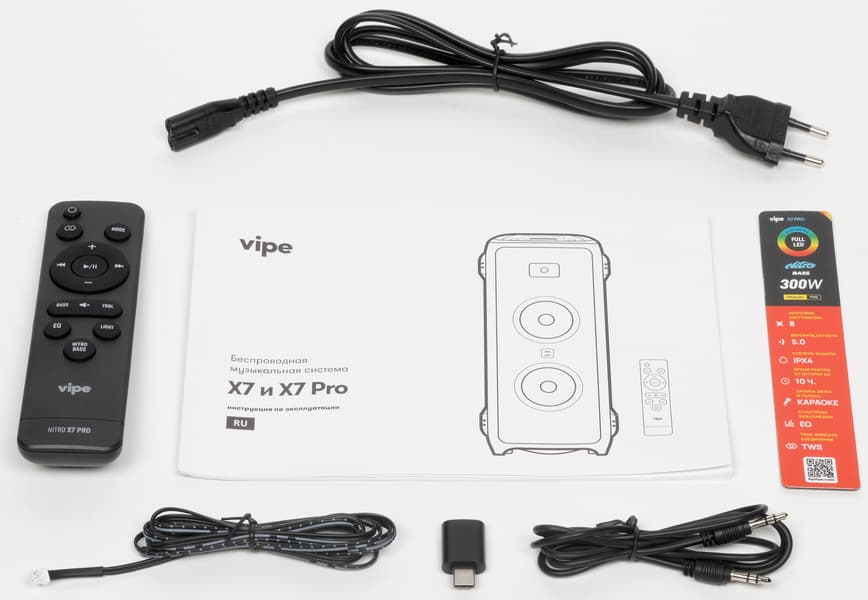 В комплект поставки помимо самой колонки входят руководство пользователя, пульт дистанционного управления, кабель питания, кабель-антенна, адаптер USB-A — USB-C, а также гибкий магнит с характеристиками устройства, с помощью QR-кода на котором можно перейти на сайт производителя Vipe Nitro X7 Pro. Наличие отдельного кабеля-антенны немного удивило, обычно в этом качестве используется кабель для проводного подключения к источнику звука — так оно намного проще: меньше разъемов, меньше проводов надо брать с собой... В целом, ничего страшного в отдельной антенне нет, но мы обещали небольшие странности — вот они и начались.