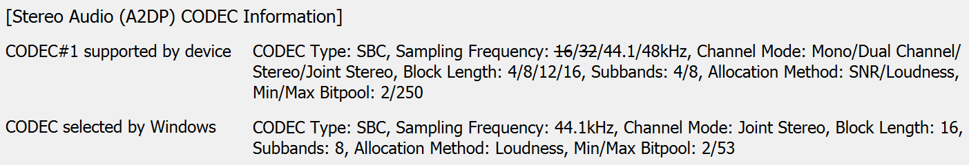 Мультипойнт не поддерживается, но в данном случае он не особо и нужен. Полный список поддерживаемых кодеков и их режимов традиционно был получен с помощью утилиты Bluetooth Tweaker. Кодеков всего один — базовый SBC. Честно говоря, это немного разочаровывает — учитывая стоимость устройства, количество динамиков и потенциально не самый плохой звук, было бы отлично увидеть в ней хотя бы несколько более «продвинутый» AAC. Но что есть — то есть, в конце концов, SBC не так плох, как о нем принято думать.