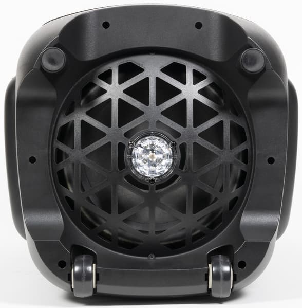 Низкочастотный динамик диаметром 10 дюймов направлен вниз и защищен крупной сеткой, по центру которой находится еще один элемент подсветки.