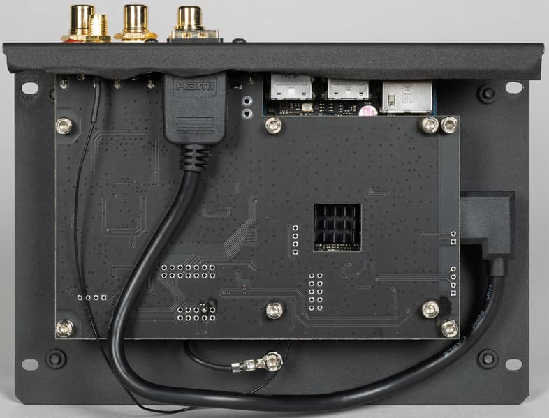 Непосредственно микрокомпьютер и аудиочасть представляют собой две отдельные платы, размещенные друг над другом и соединенные через шлейф. В расположенной сверху аудиоплате сделан квадратный вырез, служащий для отвода тепла от размещенного ниже радиатора охлаждения процессора. Решение, возможно, не самое элегантное, но вполне рабочее — с заметным нагревом устройства за все время его тестирования мы не столкнулись ни разу.