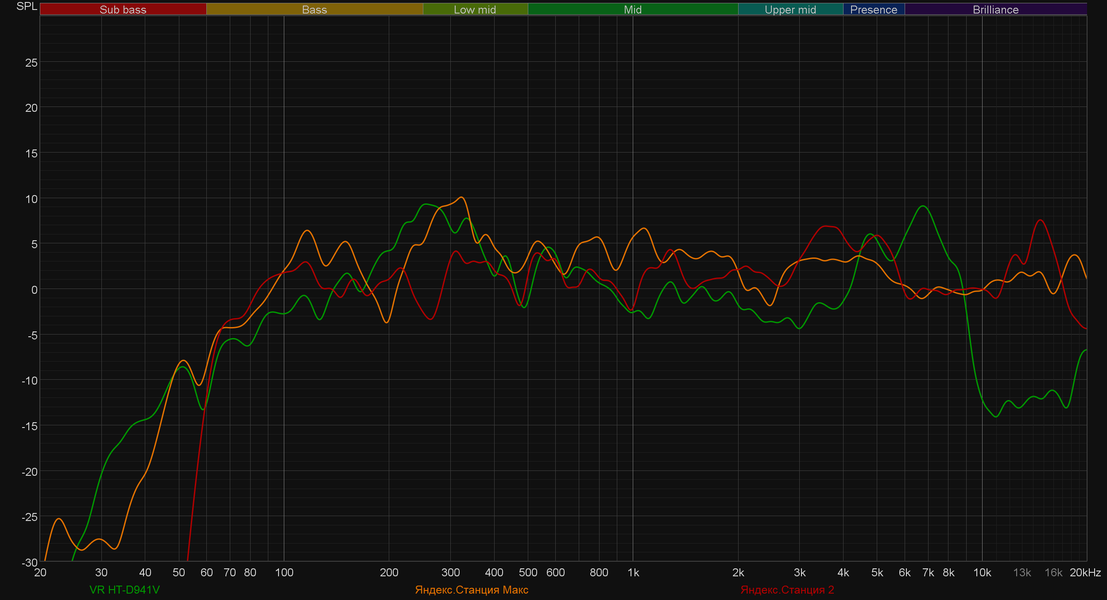 Невнятный бас без намека на нижнюю его составляющую, приводящий к гулкому звучанию «горб» в районе 200-300 Гц, провал в средних, ну и пик в ВЧ-диапазоне, благодаря которому в звучании появляются пресловутые «свист и песок», за которым следует провал после 10 кГц. Полный комплект всех известных дефектов звучания, такого мы давно не видели. А возможно, что и никогда. При этом заявленная мощность акустики — всего лишь 40 Вт, запас по громкости минимален. Звучит она не громче, некоторых из протестированных нами небольших «умных» колонок, например. И сильно отстает при этом по качеству звука. Возьмем для примера пару актуальных колонок от «Яндекса»: «Станцию Макс» и «Станцию 2».