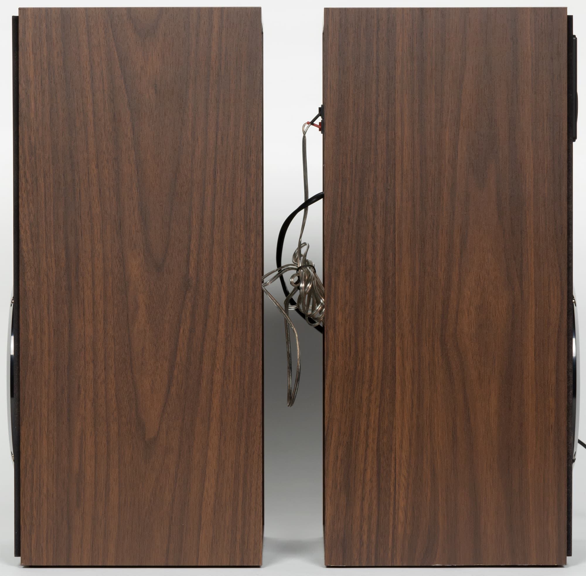 Судя по описанию на сайте, акустика производится в двух вариантах цветового исполнения: коричневом и черном. У нас на тестировании был первый. Выглядят колонки вроде бы и неплохо, но все же сразу дают понять — многого ждать тут нельзя. Дешевые материалы, аляповато нанесенные логотипы и иконки, дизайн панелей в духе «подвального Китая»… Хотя, тут дело вкуса, конечно — возможно, кому-то и понравится.