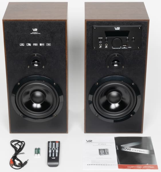 В комплект поставки входят колонки (активная и пассивная), кабель миниджек — 2×RCA, пульт дистанционного управления и две батарейки ААА к нему, а также документация.