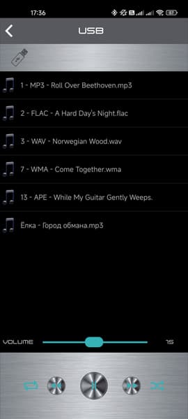 И, наконец, приложение Speaker Pro, найти которое можно в Google Play или App Store. Внешний его вид вызывает ощущение «сделанности на коленке», но работает ПО вполне корректно. На главной странице нас ожидает ряд иконок, ведущих на вкладки управления различными функциями. Первая позволяет транслировать треки с подключенного гаджета посредством Bluetooth. Далее мы видим страницу подключения различных устройств, ну и панель управления USB-плеером. На последней есть даже имена файлов, что более-менее компенсирует отсутствие подробных данных о воспроизводимом треке на передней панели.