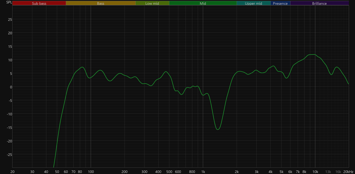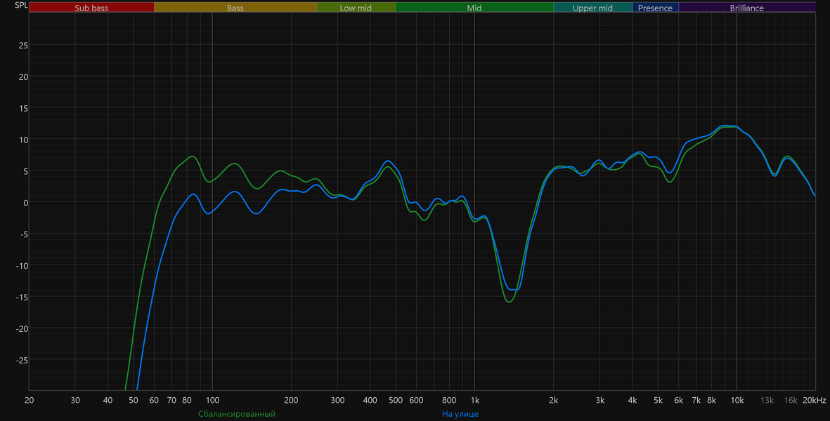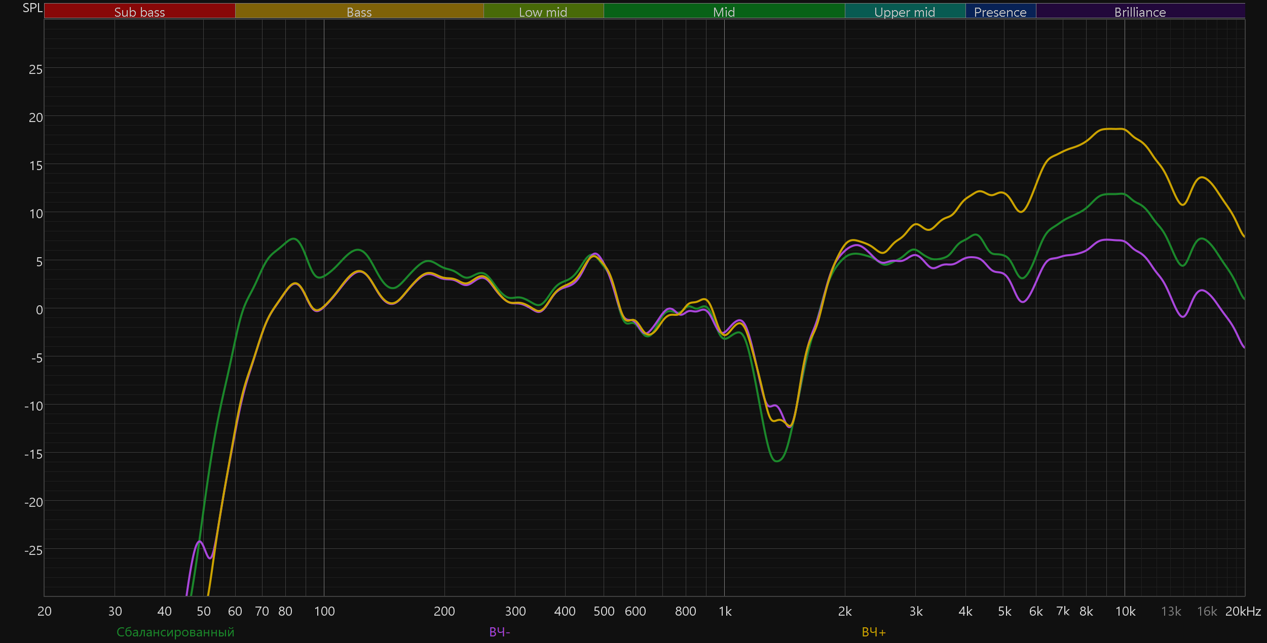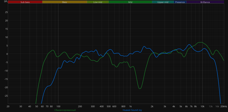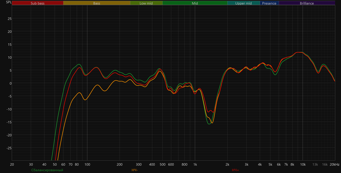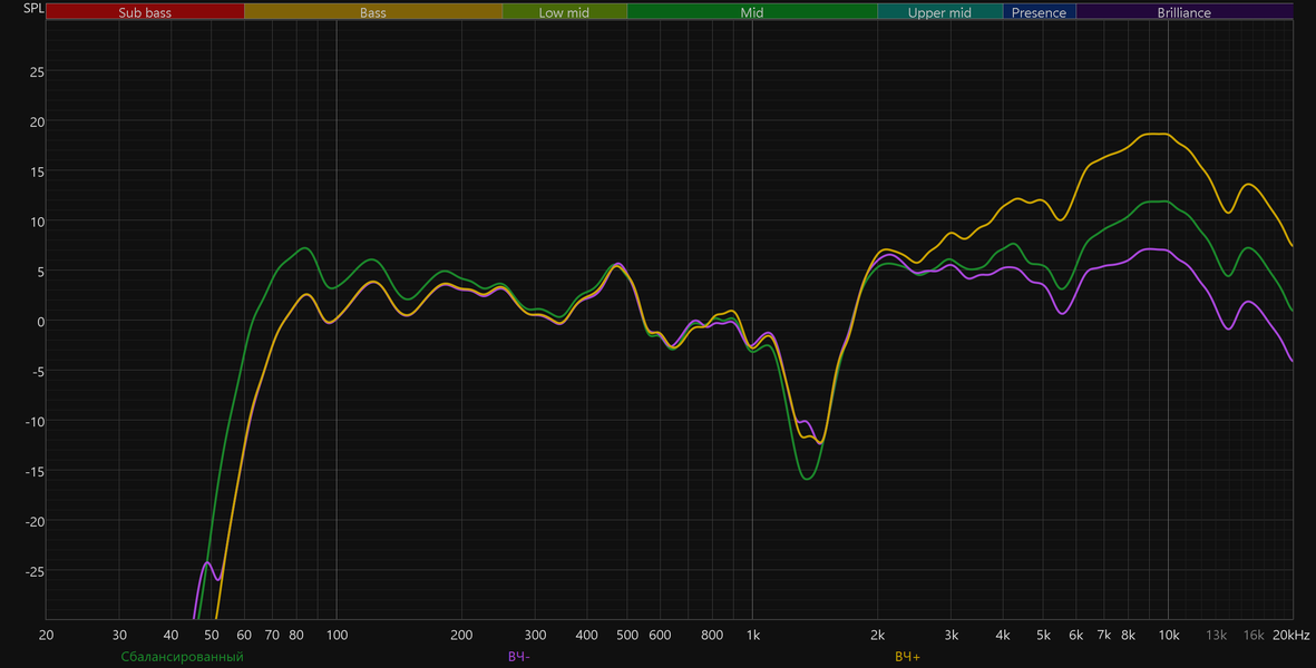 Высокие частоты постепенно восстанавливаются после провала, а в диапазоне 5—10 кГц заметен подъем. Потенциально он добавляет субъективной детализации и частично компенсирует провал в середине. Но на практике это чаще приводит к резкой и утомительной «верхастой» подаче, особенно заметной на громкости выше средней.