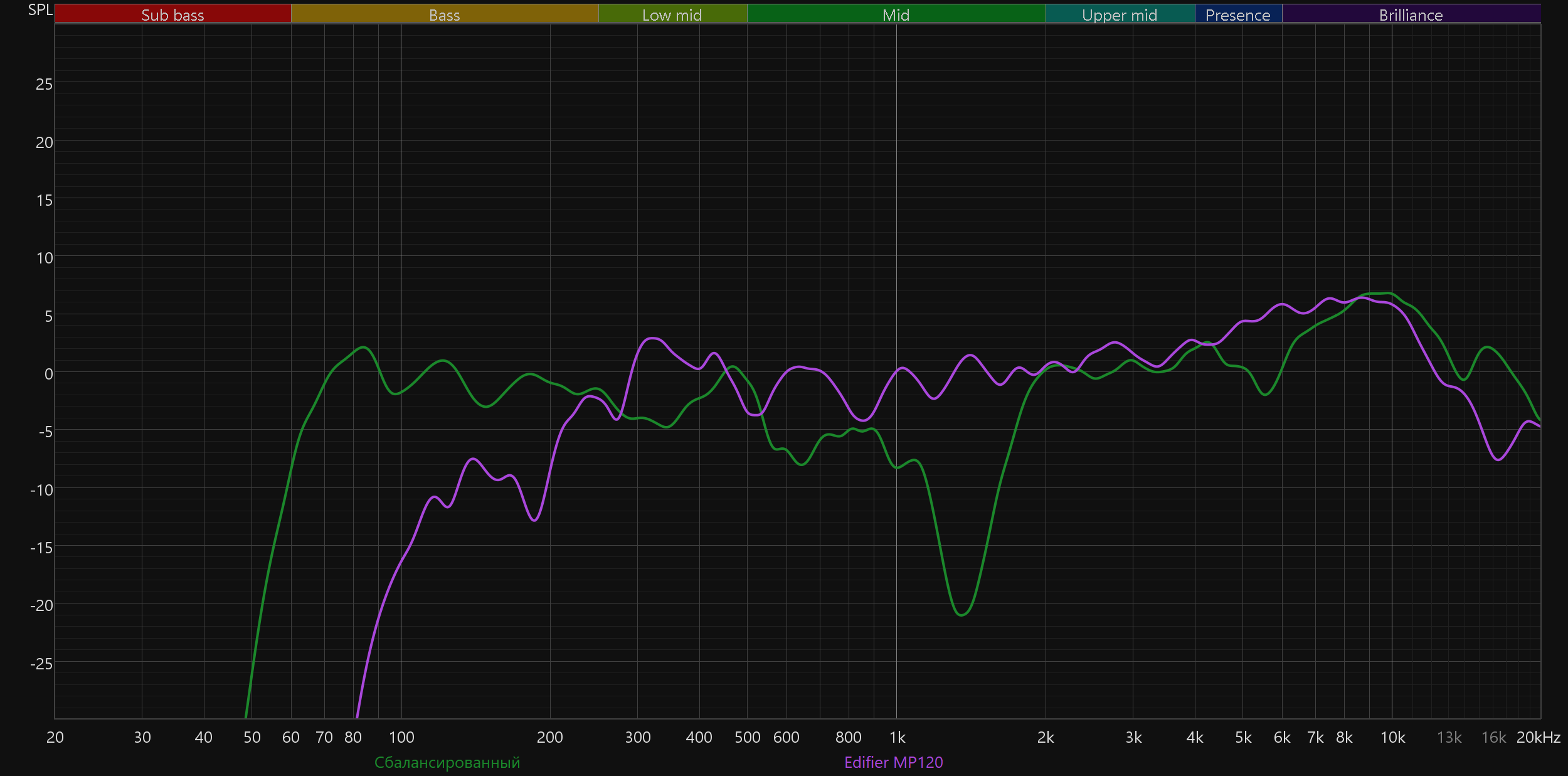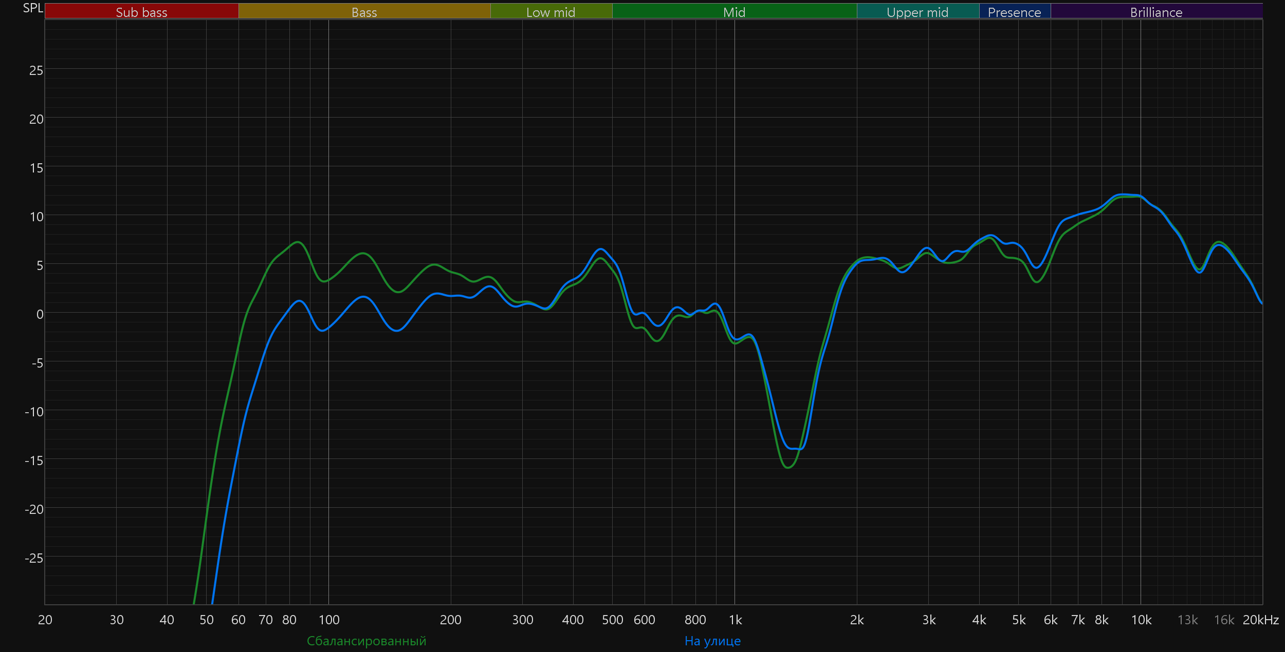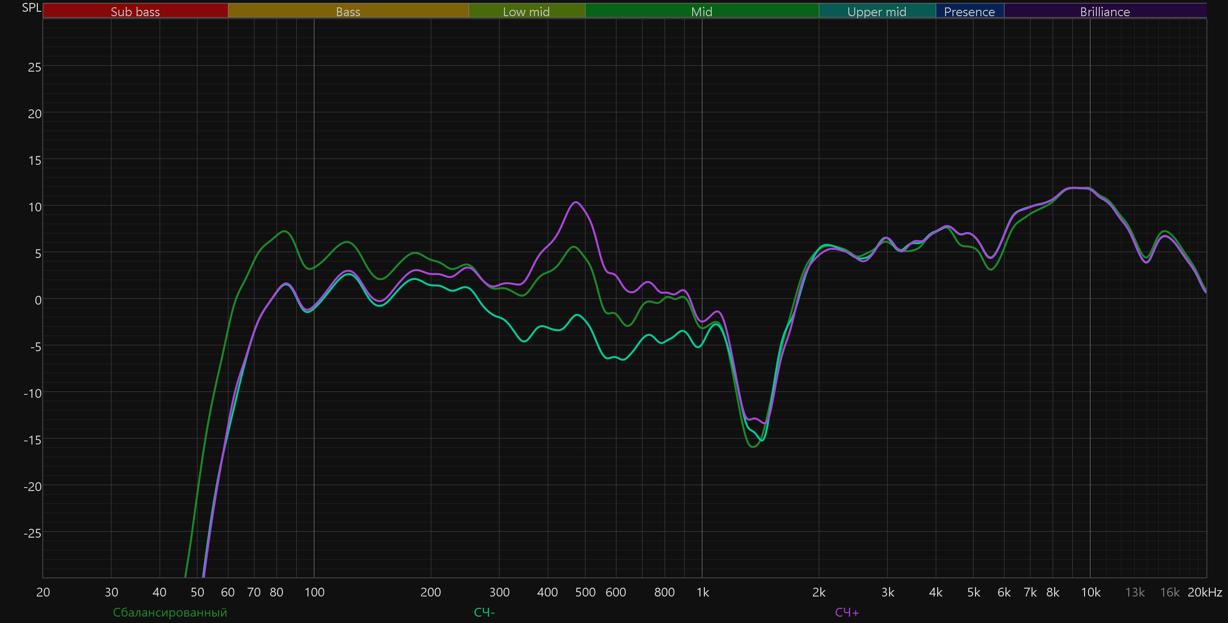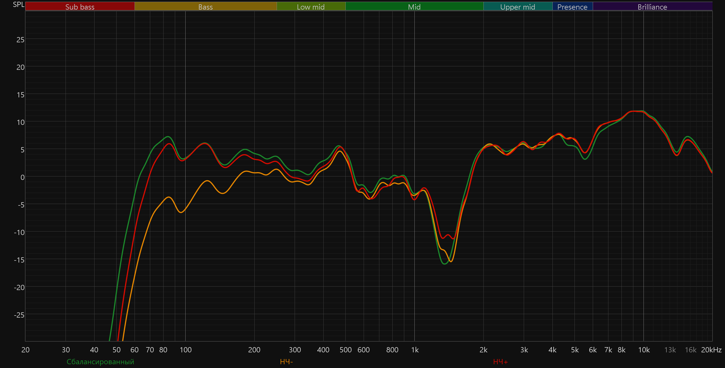 Высокие частоты постепенно восстанавливаются после провала, а в диапазоне 5—10 кГц заметен подъем. Потенциально он добавляет субъективной детализации и частично компенсирует провал в середине. Но на практике это чаще приводит к резкой и утомительной «верхастой» подаче, особенно заметной на громкости выше средней.