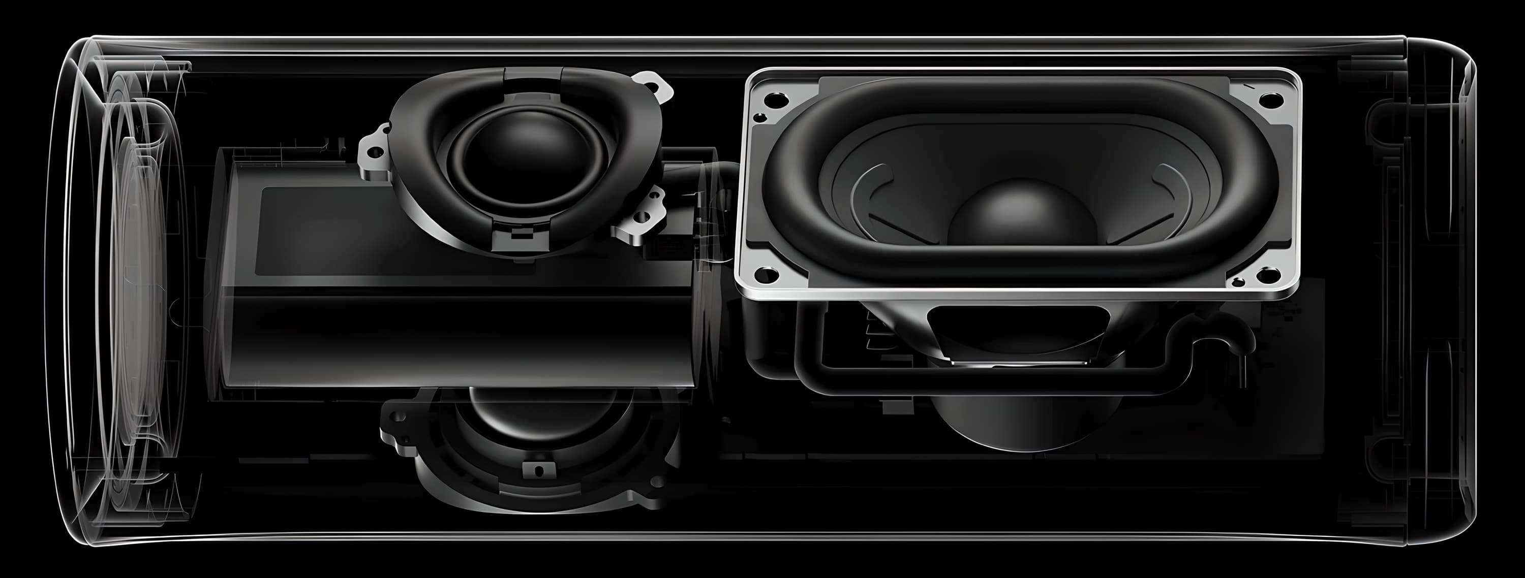 Звучание колонки обеспечивается двумя твитерами, средне-низкочастотным динамиком формата racetrack (овальной формы с увеличенным ходом диффузора) и парой пассивных излучателей для усиления баса. Твитеры направлены в разные стороны, за счет чего звук распространяется вокруг колонки — производитель называет это «360-градусным всенаправленным звучанием».