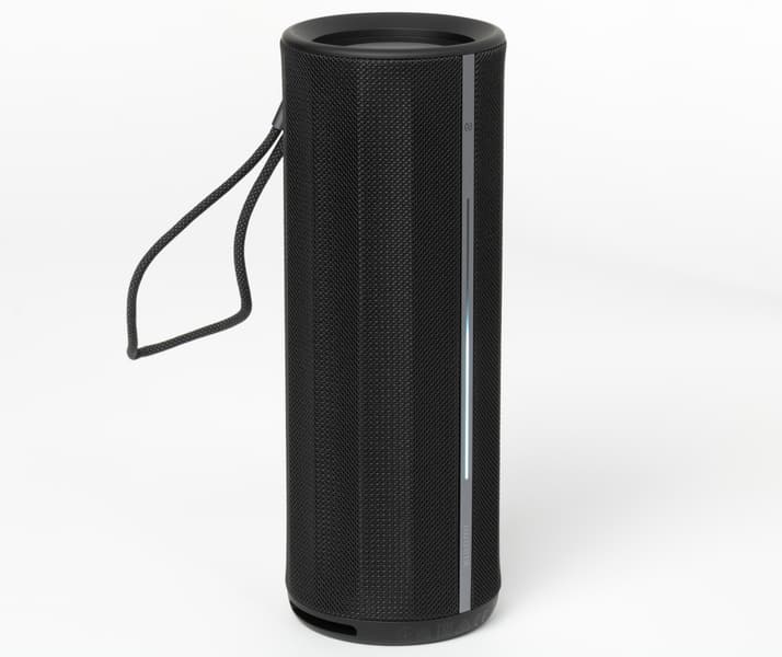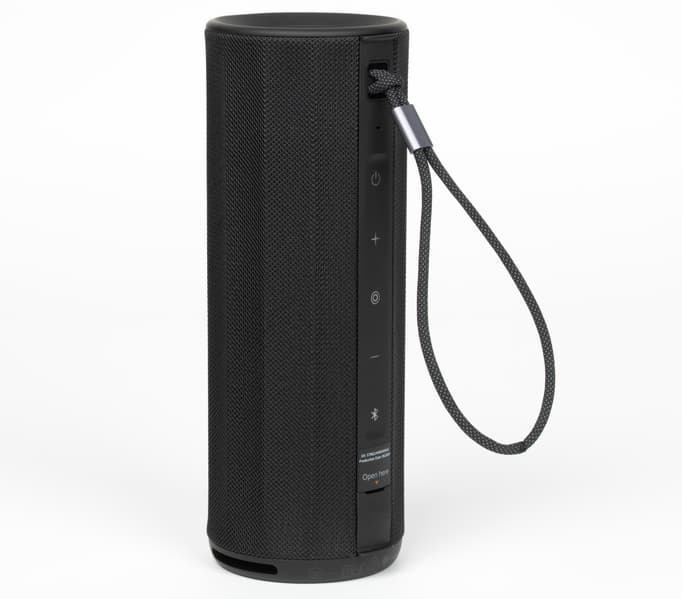 Петля с металлическим бегунком удачно сочетается с основными материалами корпуса по фактуре и цвету и не выглядит чужеродным элементом. Со своей задачей она тоже справляется: благодаря ей колонку удобно нести в руке или подвешивать куда-нибудь — на ветку дерева, например.