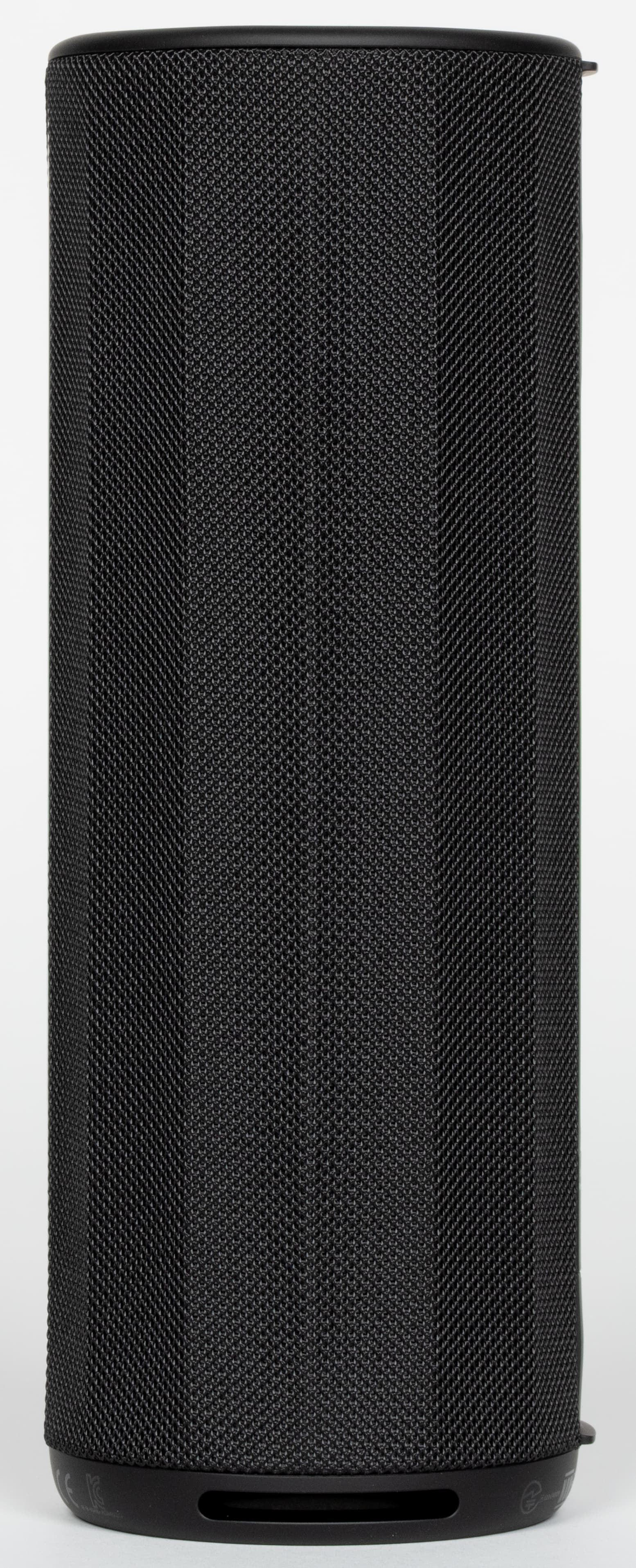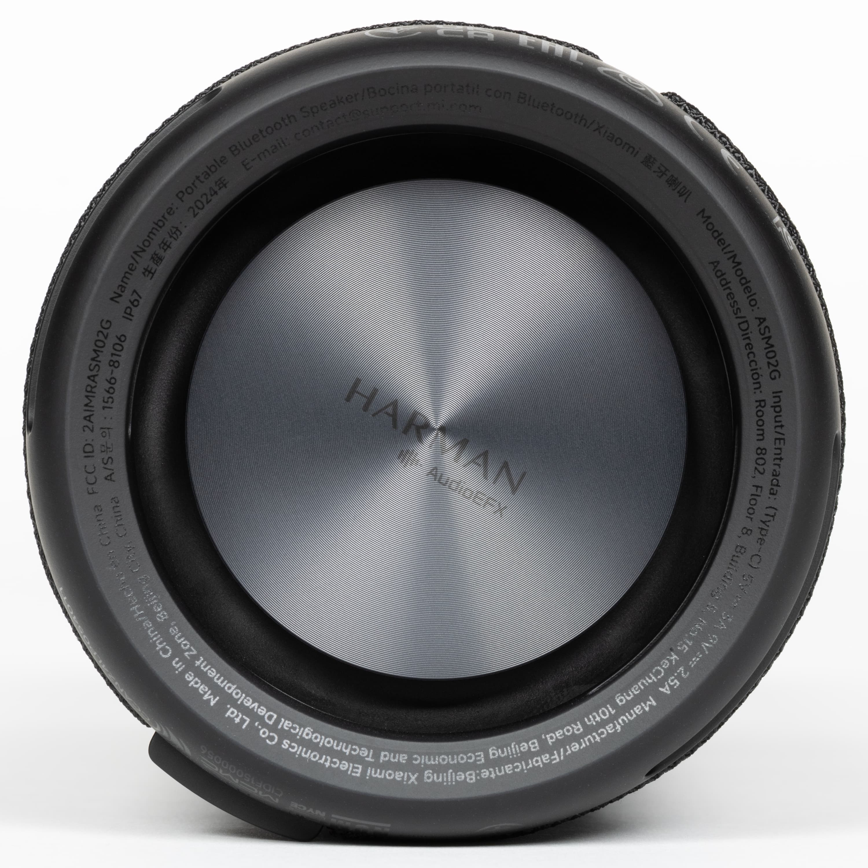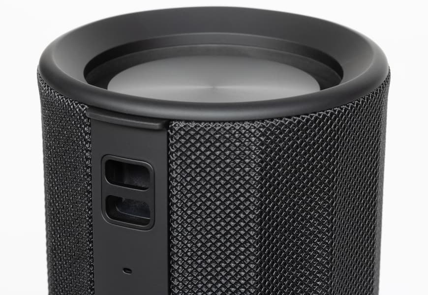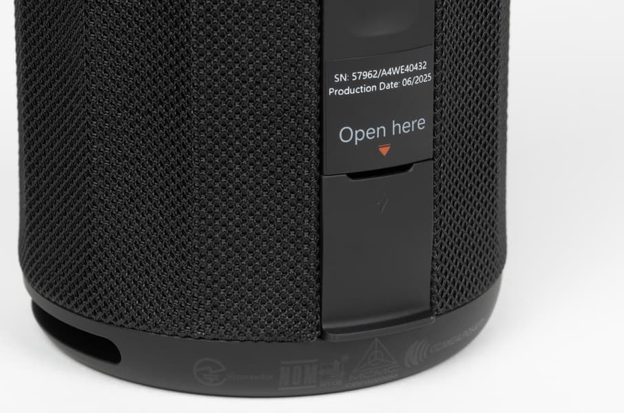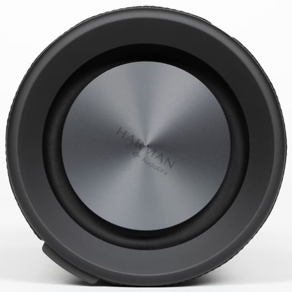 На торцах цилиндрического корпуса находятся пассивные излучатели, на которых нанесен логотип Harman AudioEFX. Под этим названием Harman объединяет комплекс решений по акустической настройке: оптимизацию формы корпуса, алгоритмы цифровой обработки и регулировку работы излучателей. На нижнем защитном элементе по периметру есть служебная маркировка. Выполнена она черным по черному и заметна только под углом, поэтому особо не бросается в глаза.