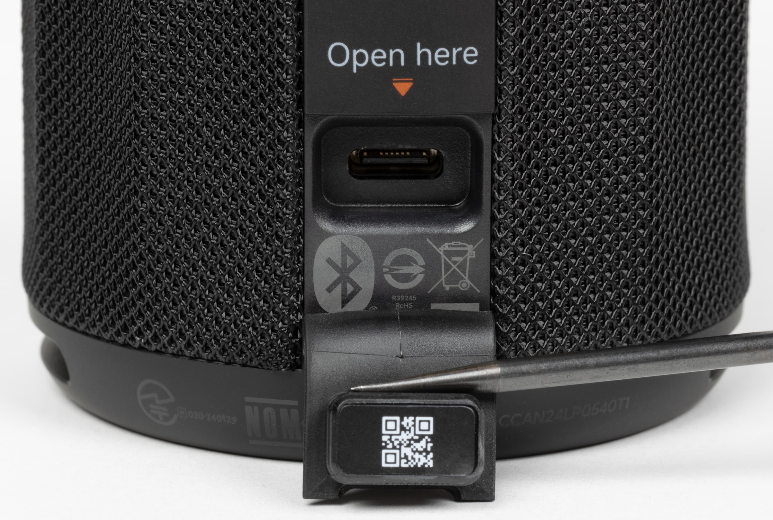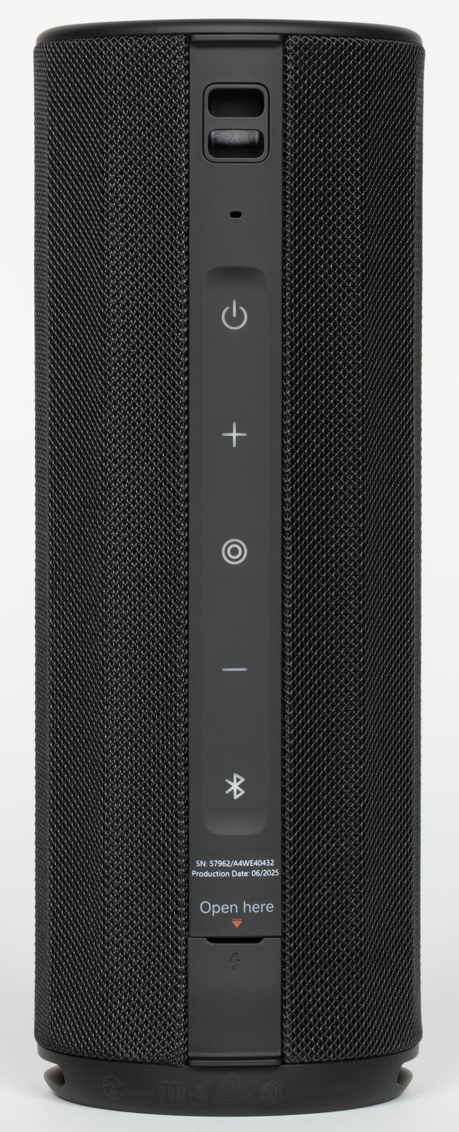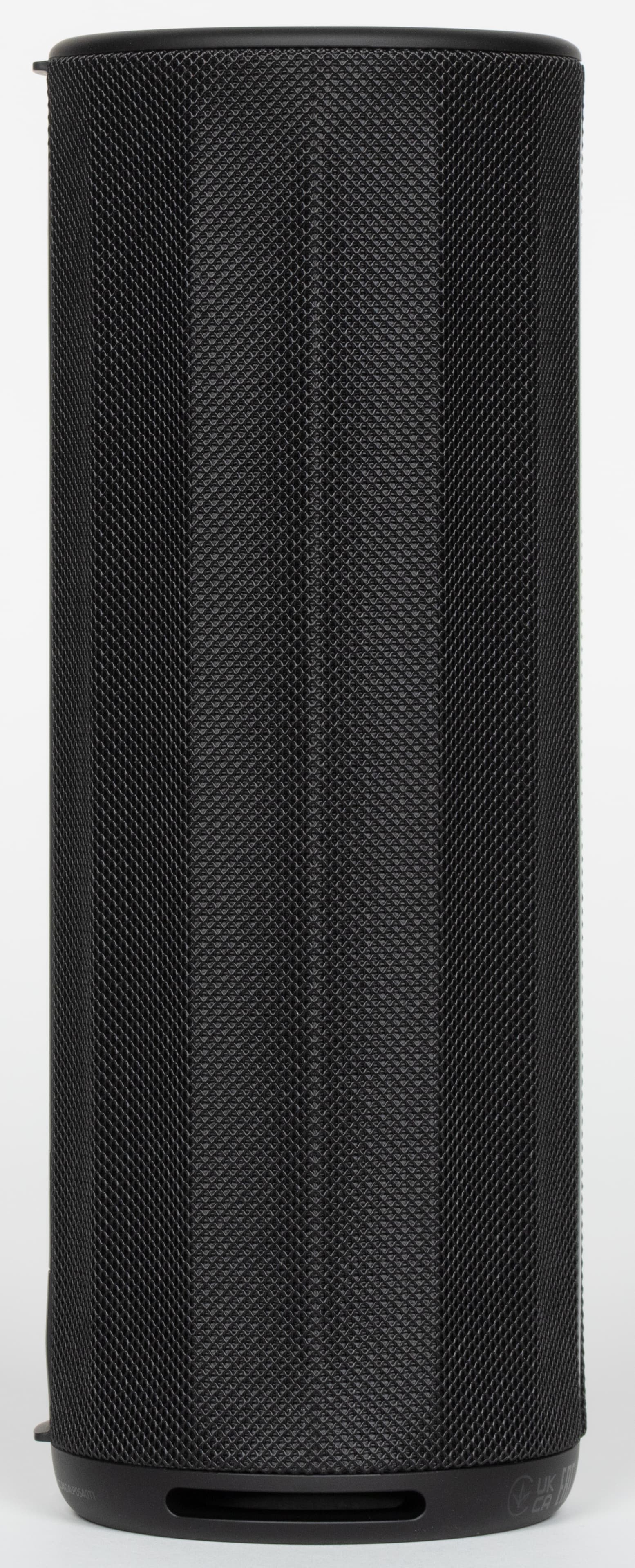 На торцах цилиндрического корпуса находятся пассивные излучатели, на которых нанесен логотип Harman AudioEFX. Под этим названием Harman объединяет комплекс решений по акустической настройке: оптимизацию формы корпуса, алгоритмы цифровой обработки и регулировку работы излучателей. На нижнем защитном элементе по периметру есть служебная маркировка. Выполнена она черным по черному и заметна только под углом, поэтому особо не бросается в глаза.