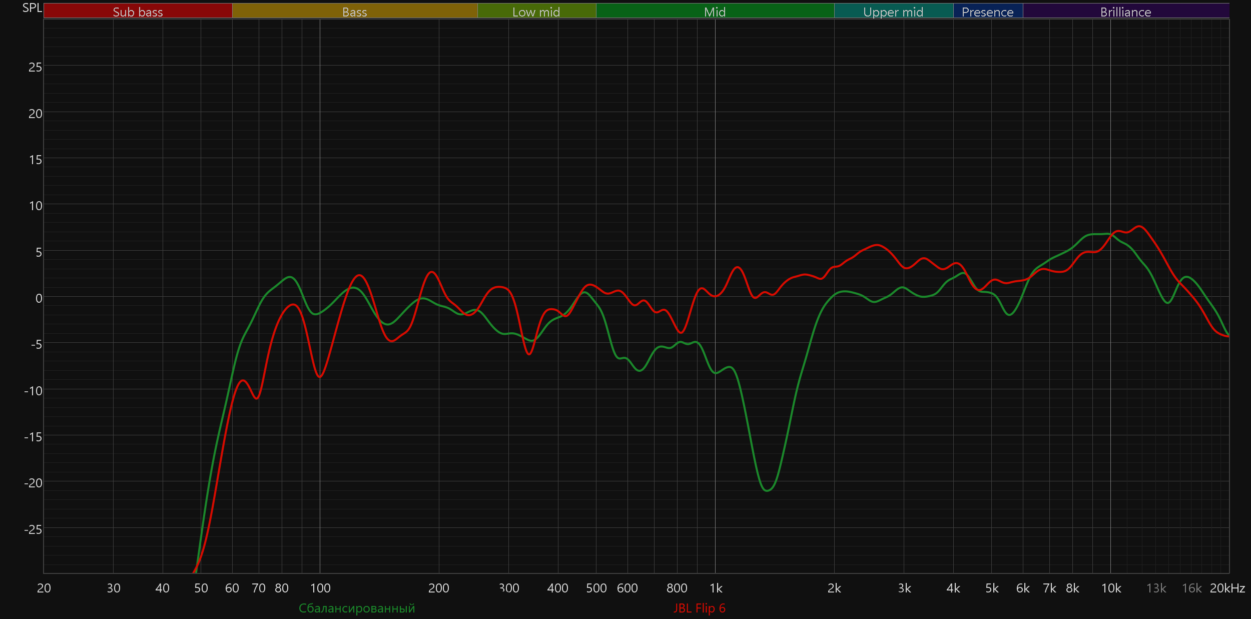 Что касается реального качества звучания, то оно заметно расходится с ожиданиями, которые формируют заявления о «профессиональной настройке Harman AudioEFX и вычислительном алгоритме обработки». С басом все относительно неплохо: колонка уверенно стартует примерно с 60 Гц, в диапазоне 60—100 Гц наблюдается сдержанный подъем — типичное решение для портативной акустики, создающее ощущение массивного баса при компактном корпусе.