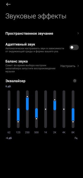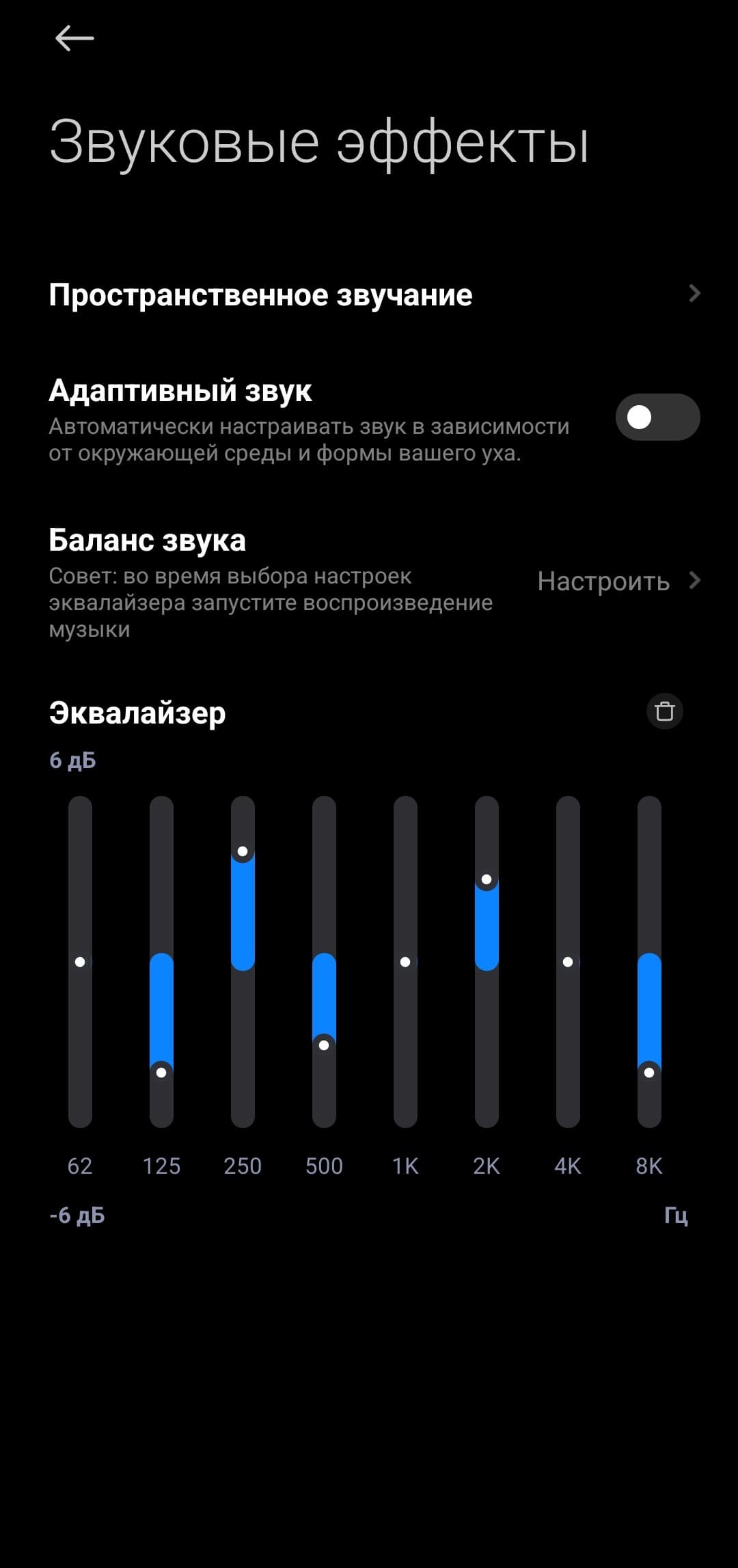 Одна из главных «фишек» Xiaomi Buds 5 — крайне обширные возможности эквализации. Посмотрим, что могут сделать предлагаемые производителем пресеты. Видно, что эквалайзер работает эффективно — настроить можно многое. Особое внимание стоит уделить уже упомянутой выше предустановке «Уменьшение НЧ», позволяющей быстро избавиться от акцента на басе.