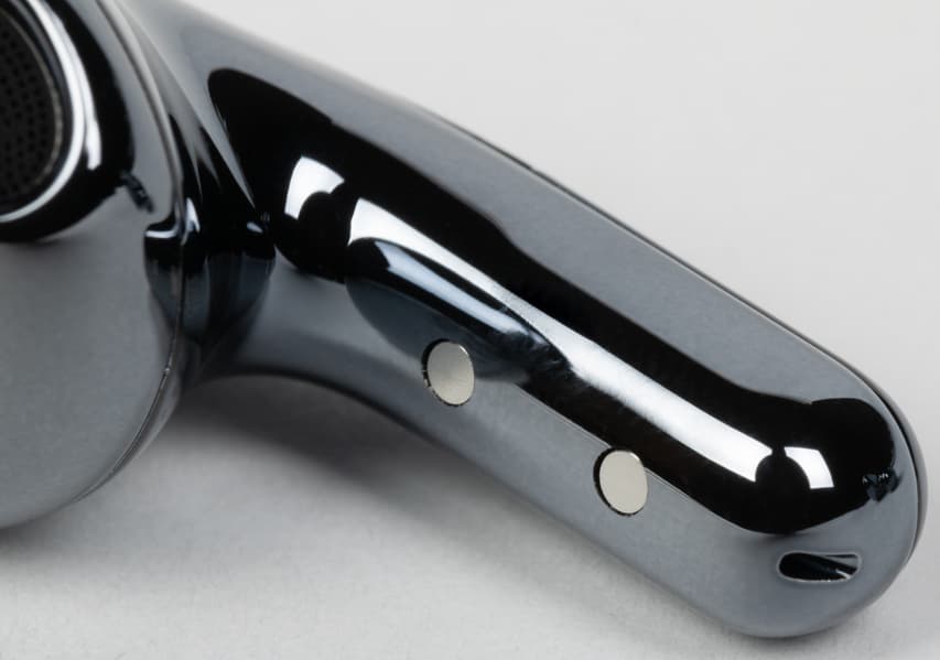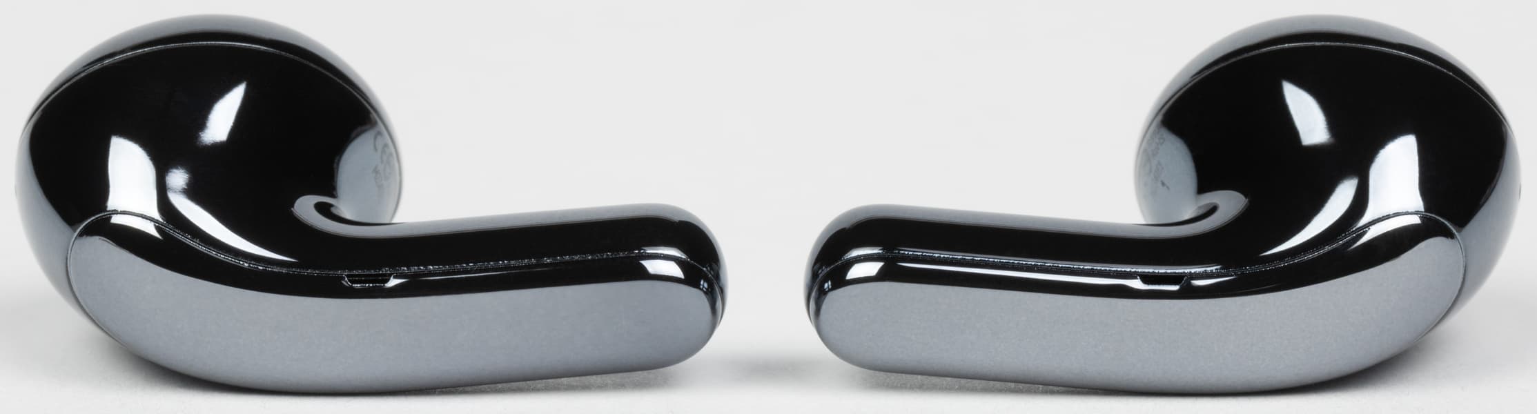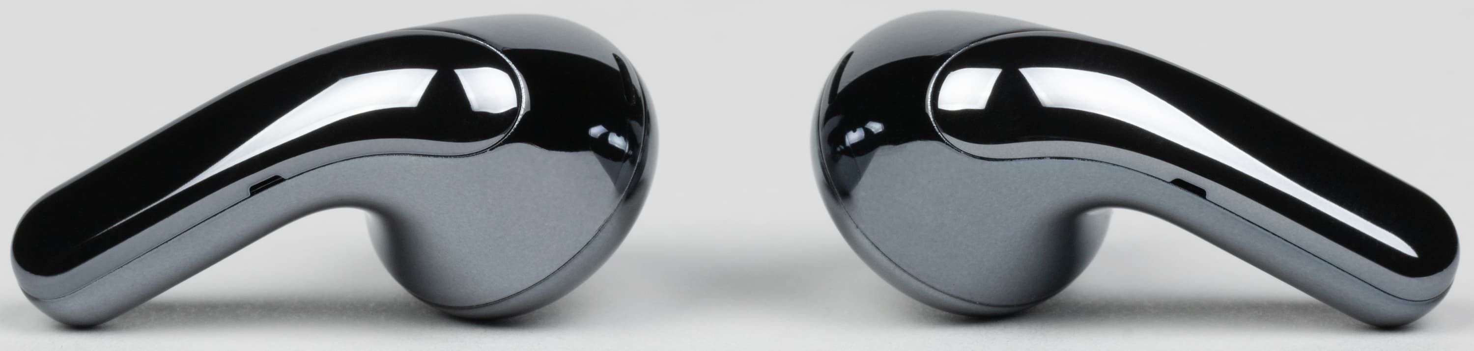 Внешняя боковая поверхность является сенсорной и для более комфортного поиска на ощупь сделана плоской, что внешне практически незаметно. Также на боковой части «палочек» видно небольшое отверстие, за которым скрывается один из микрофонов системы активного шумоподавления.