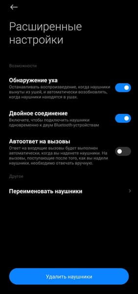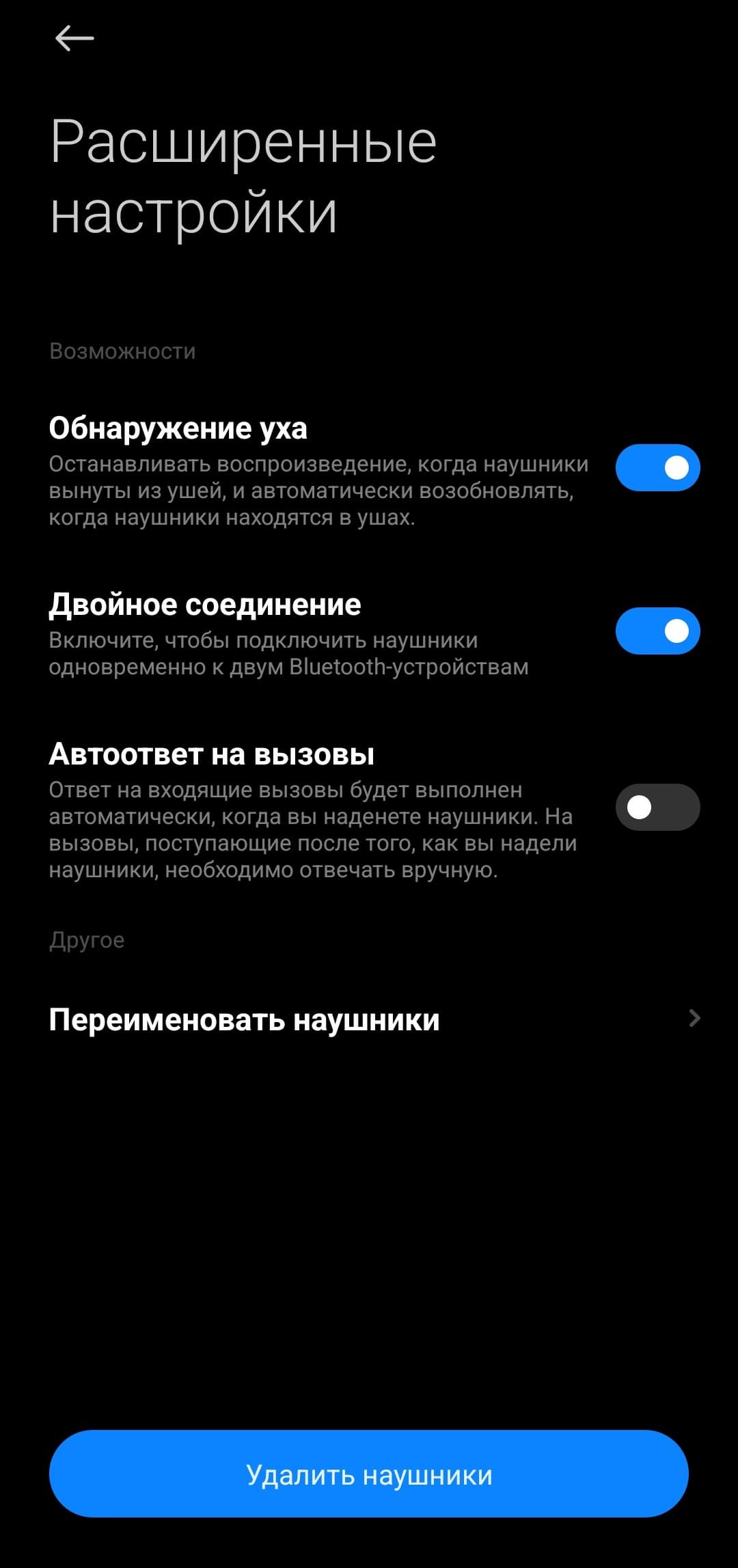 На вкладке «Звуковые эффекты» можно активировать пресет эквалайзера Harman AudioEFX, а также выбрать один из четырех других предустановленных звуковых профилей. Там же включается функция «Адаптивный звук», при задействовании которой система пытается настраивать его самостоятельно «в зависимости от окружающей среды и формы вашего уха». Ну и для тех, кто привык полагаться на свой слух и навыки, есть полноценный 10-полосный эквалайзер. Давненько мы не видели у TWS-гарнитур столько полос эквалайзера, да еще и в сочетании с массой других опций — вот еще один повод искренне похвалить Xiaomi Buds 5.