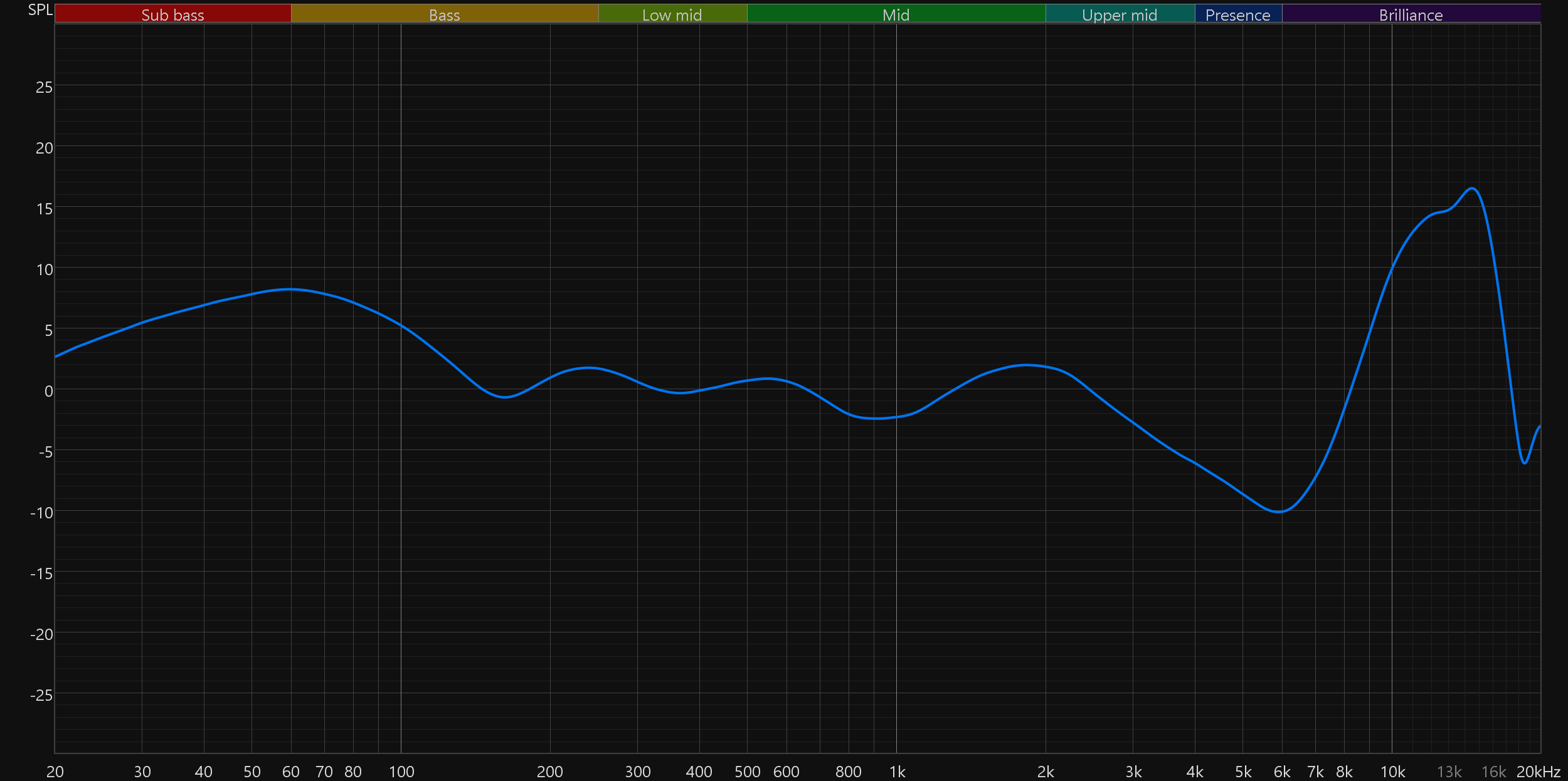 График АЧХ показан на фоне кривой IDF (IEM diffuse field compensation), предоставленной производителем используемого стенда. Ее задача — помочь скомпенсировать резонансные явления в имитированном слуховом канале и особенности оборудования, создав «звуковой профиль», максимально корректно иллюстрирующий то, как звучание наушников воспринимается слушателем. Ее можно рассматривать как адаптированный под конкретное устройство аналог так называемой «кривой Хармана», созданной командой Harman International под руководством доктора Шона Олива. Скомпенсируем полученный график АЧХ в соответствии с кривой IDF — в таком виде он наиболее полно иллюстрирует субъективные впечатления от прослушивания.