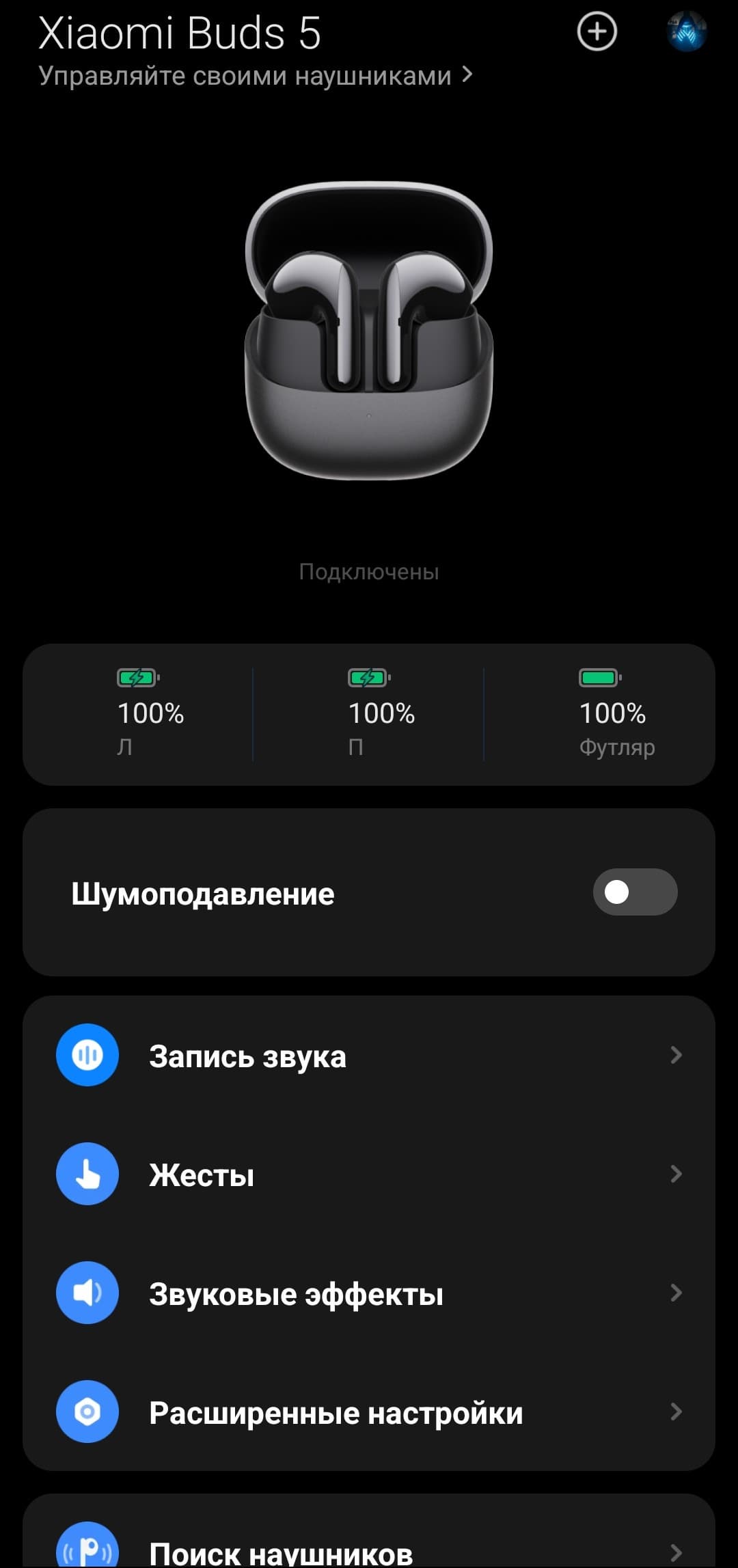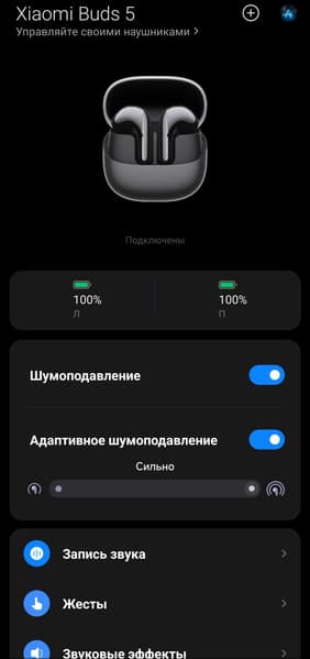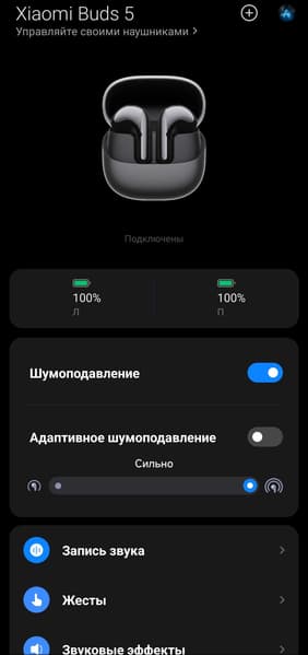 На главной странице приложения можно посмотреть уровень зарядки каждого из наушников, а также кейса, если он открыт, и наушники находятся в нем. Ниже размещен модуль управления «шумодавом». Пользователь может вручную выбрать два варианта агрессивности его работы: «Сбалансированно» или «Сильно». Либо довериться автоматике и активировать адаптивное шумоподавление.