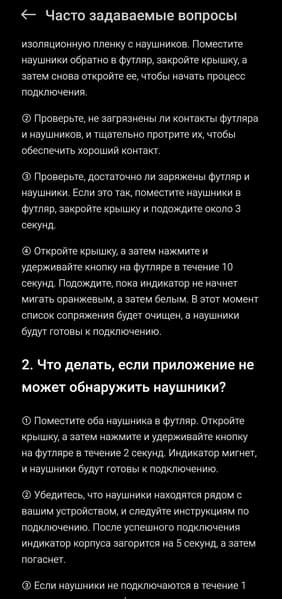 В наушники встроен датчики ношения, управляющие автопаузой. Работают они полностью корректно, причин отключать их нет. Но если вдруг всё же захочется — такая возможность предусмотрена. Есть и функция поиска: затерявшиеся наушники могут начать издавать высокочастотный сигнал, благодаря которому их удастся найти где-нибудь в тихой комнате. Также в приложении можно найти инструкцию и ответы на вопросы, причем корректно переведенные на русский язык, что очень приятно.