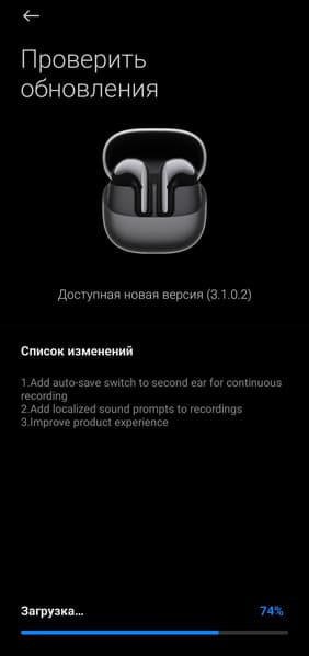 Мы заранее установили приложение Xiaomi Earbuds, так как без него полноценное использование гарнитуры невозможно. После подключения система сразу предложила перейти в него, чтобы продолжить настройку. Как только это было сделано, появилось уведомление о том, что доступно обновление прошивки. На его установку ушла пара минут.