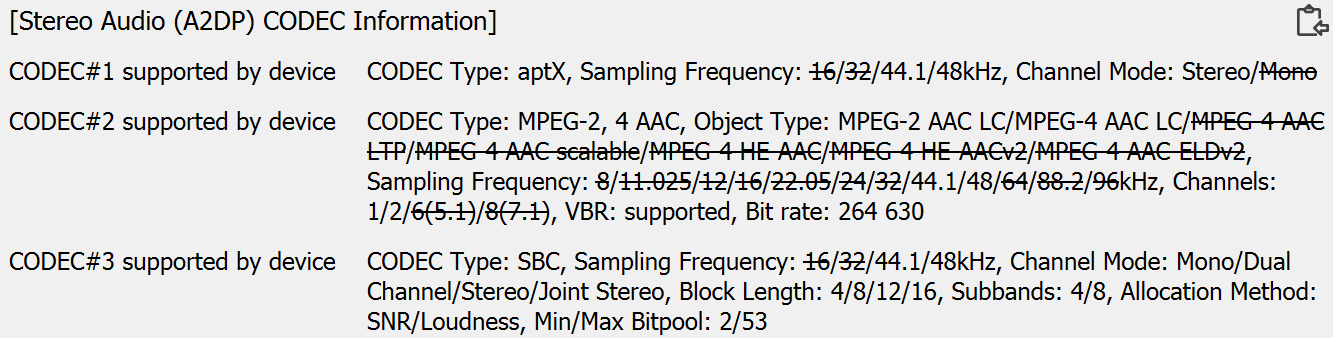 Полный список поддерживаемых кодеков и их режимов мы традиционно получили с помощью утилиты Bluetooth Tweaker. Всего их три: два базовых — SBC и AAC, плюс aptX Adaptive. В описании гарнитуры есть упоминание Qualcomm aptX Lossless audio encoding. Видимо, имеется в виду умение aptX Adaptive поднимать битрейт до до 420 Кбит/с, о котором мы говорили в посвященном кодекам обзоре.
