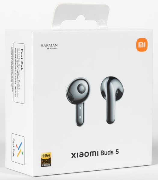 Поставляется Xiaomi Buds 5 в коробке из плотного картона, на крышку которой нанесены изображение и название устройства, лого производителя и значки использованных технологий: Harman AudioEFX и Google Fast Pair. Ну и знак сертификации Hi-Res Audio — куда в наше время без него.