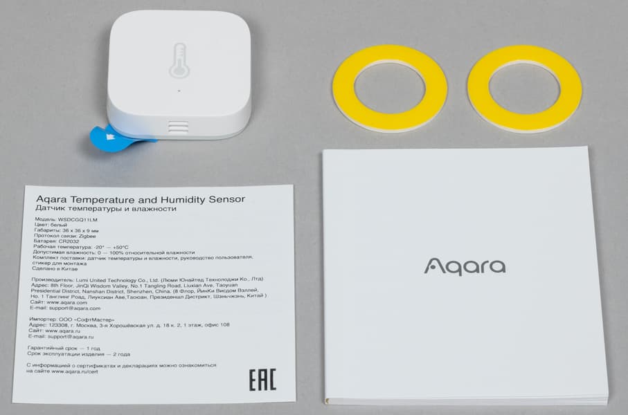 У датчика температуры и влажности кусочка скотча оказалось целых два — видимо с расчетом на то, что рано или поздно мы захотим его куда-нибудь перевесить. Документация вновь присутствует.