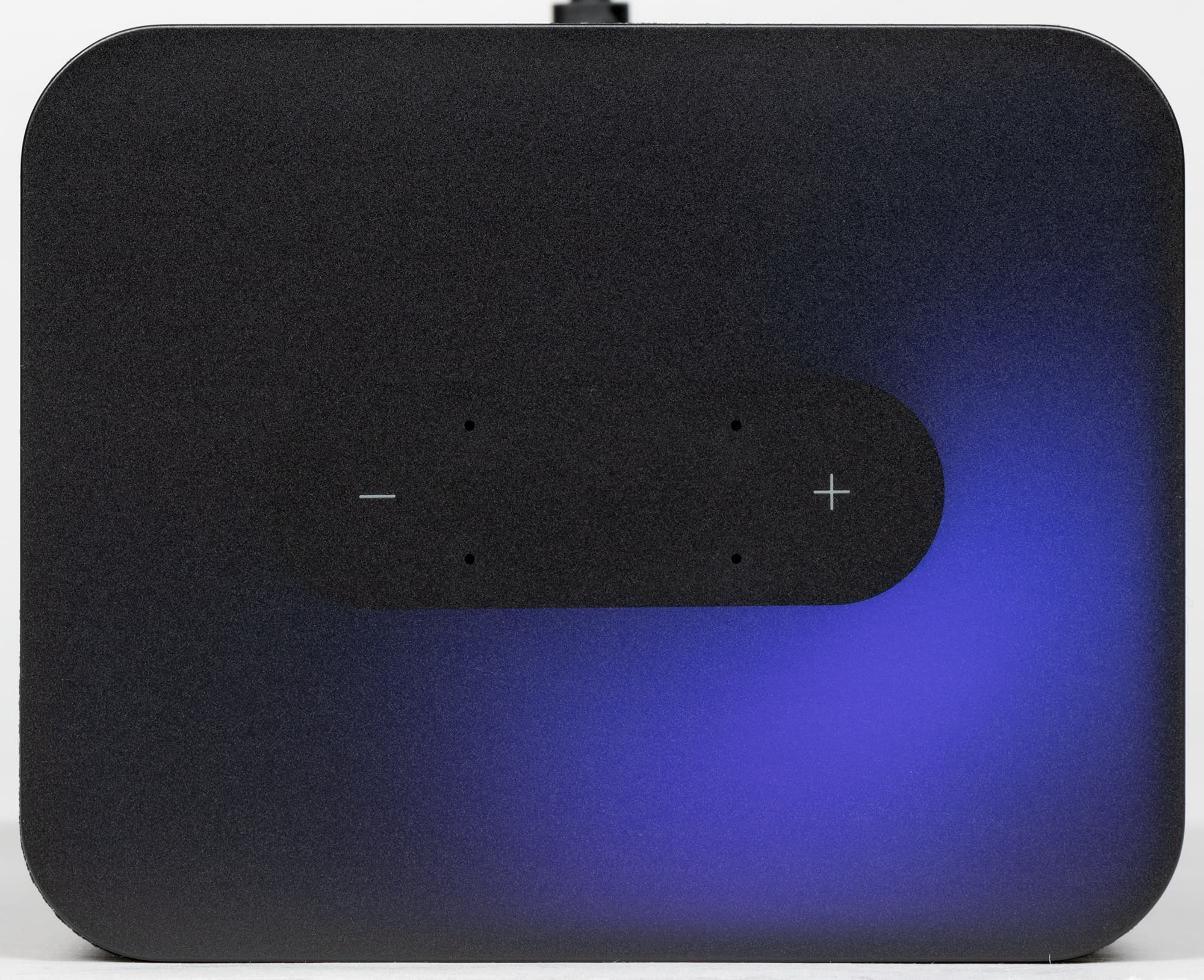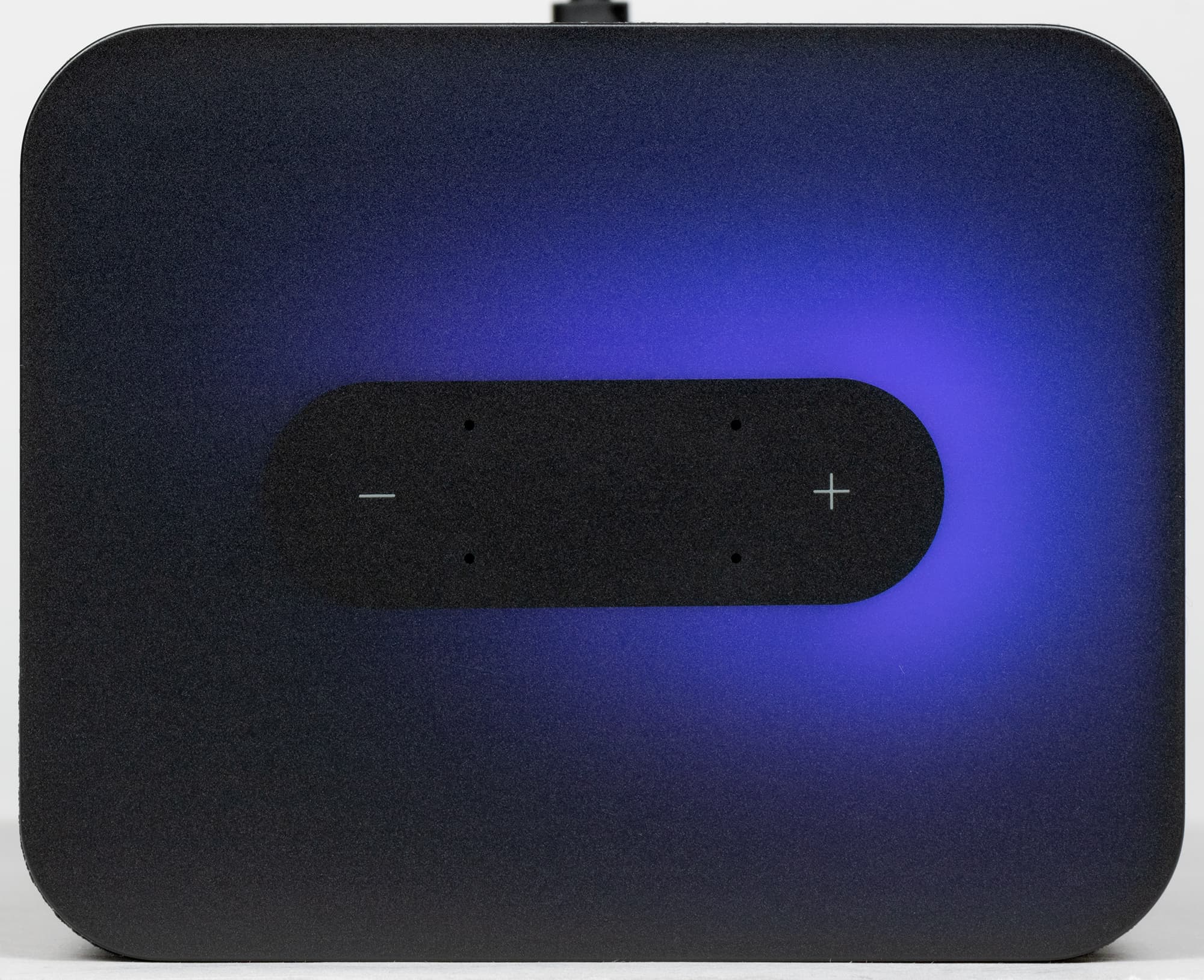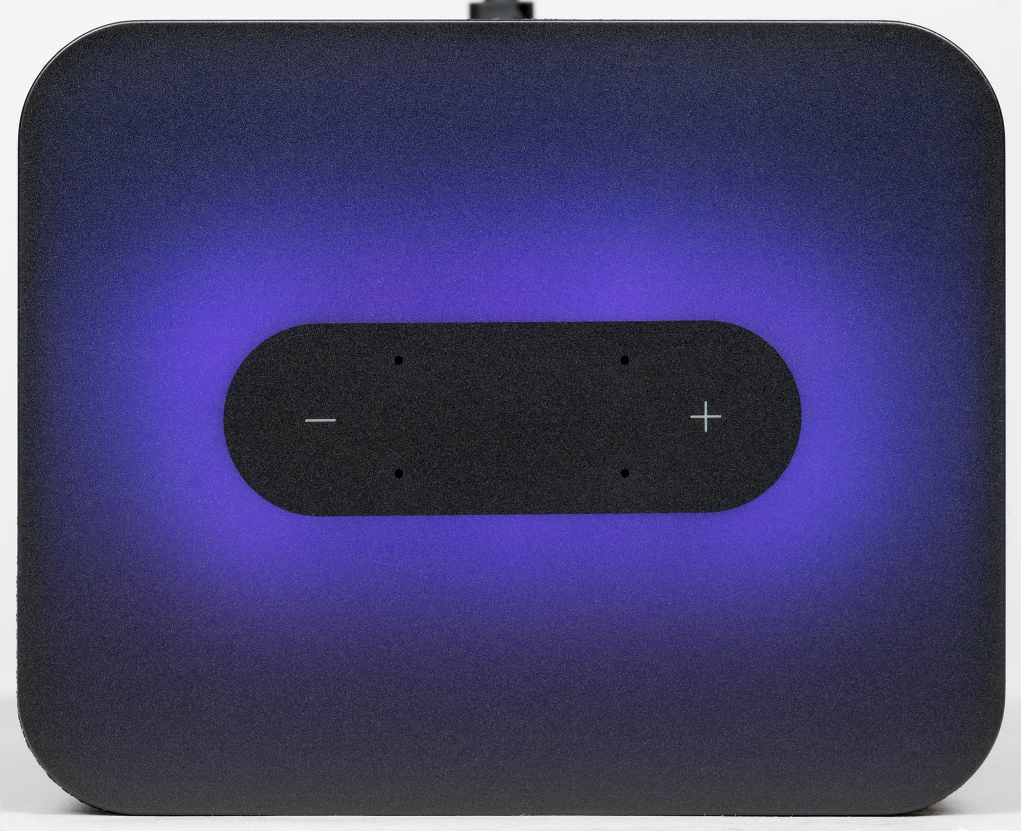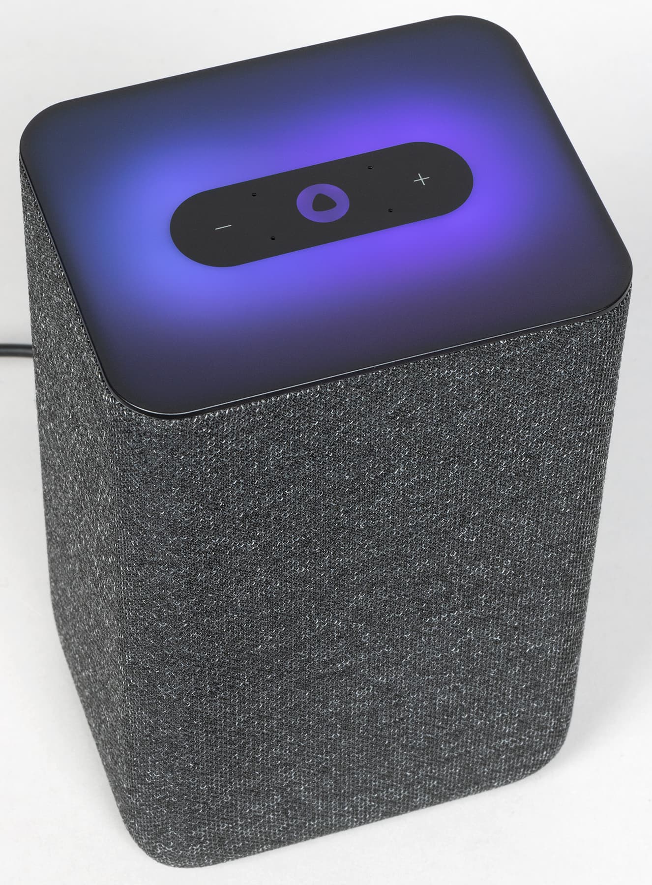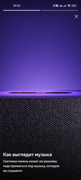 Но это только на первый взгляд. Стоит подключить колонку, как верхняя панель загорается яркой динамической подсветкой, которая выглядит просто крайне эффектно. Основные цвета — фиолетовый и оттенки синего, именно они используются для анимации «общения» с Алисой. При регулировке громкости цвет меняется от зеленого до красного. Но самое красивое — это, конечно, световые эффекты при воспроизведении музыки. Вот уж где верхняя панель показывает себя во всей красе.