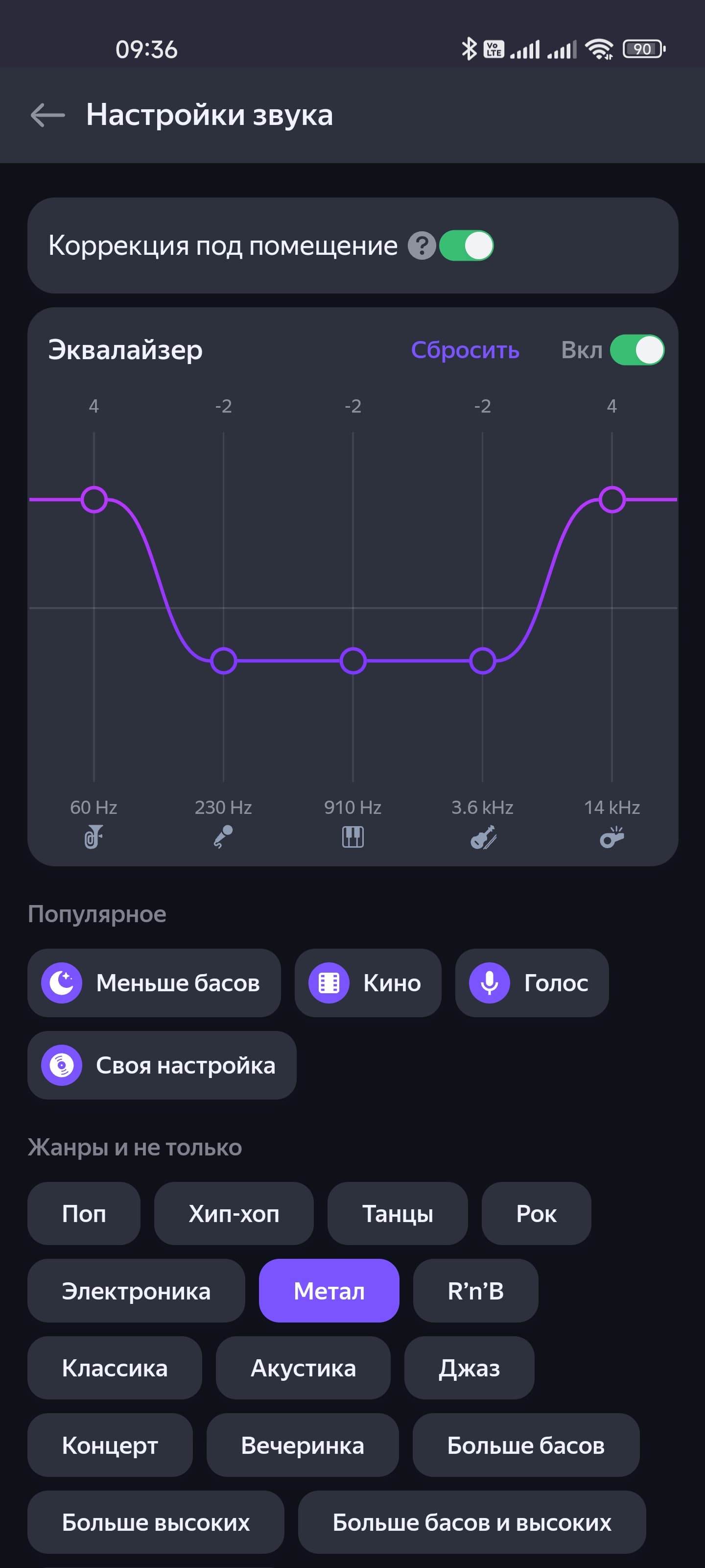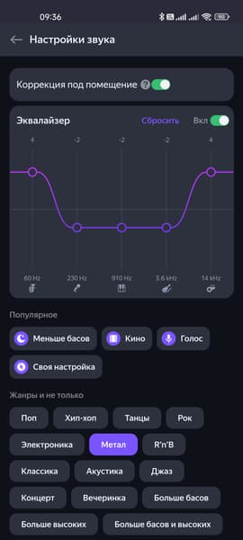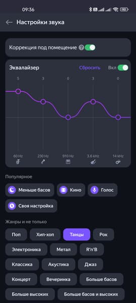 Ура, эквалайзер. Всего пять полос, но все равно очень здорово. Куча пресетов, возможность создавать свои — все как полагается. А еще есть функция автоматической коррекции звука под размеры и форму помещения, что вообще замечательно. Вот только при подключении посредством Bluetooth вся эта красота не работает — немного жаль, но колонка для рассчитанной на воспроизведение контента из собственного стримингового сервиса производителя, это вполне нормально.