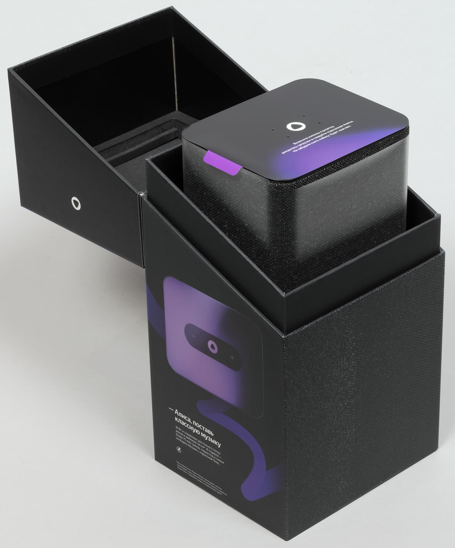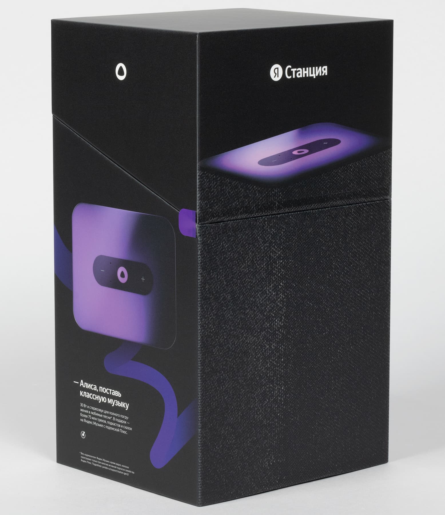 Упаковка новой «Станции» достойна отдельной похвалы. На коробку черного цвета нанесено изображение устройства и его краткие характеристики. При этом поверхности, на которых изображены боковые стенки колонки, выделены фактурой, напоминающей обтягивающую их ткань. Смотрится и ощущается очень оригинально. Да и в целом внешний вид у коробки, конечно, впечатляющий.