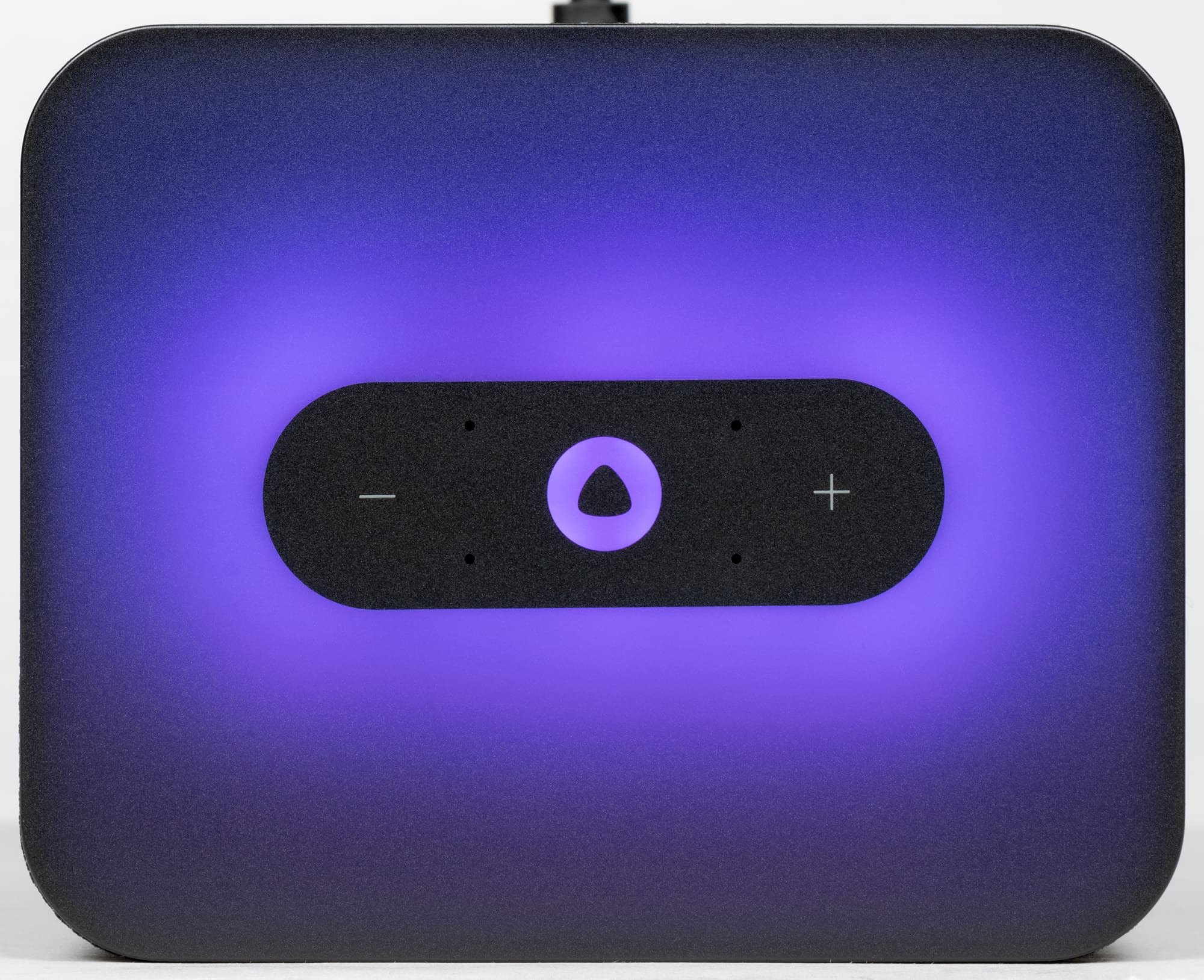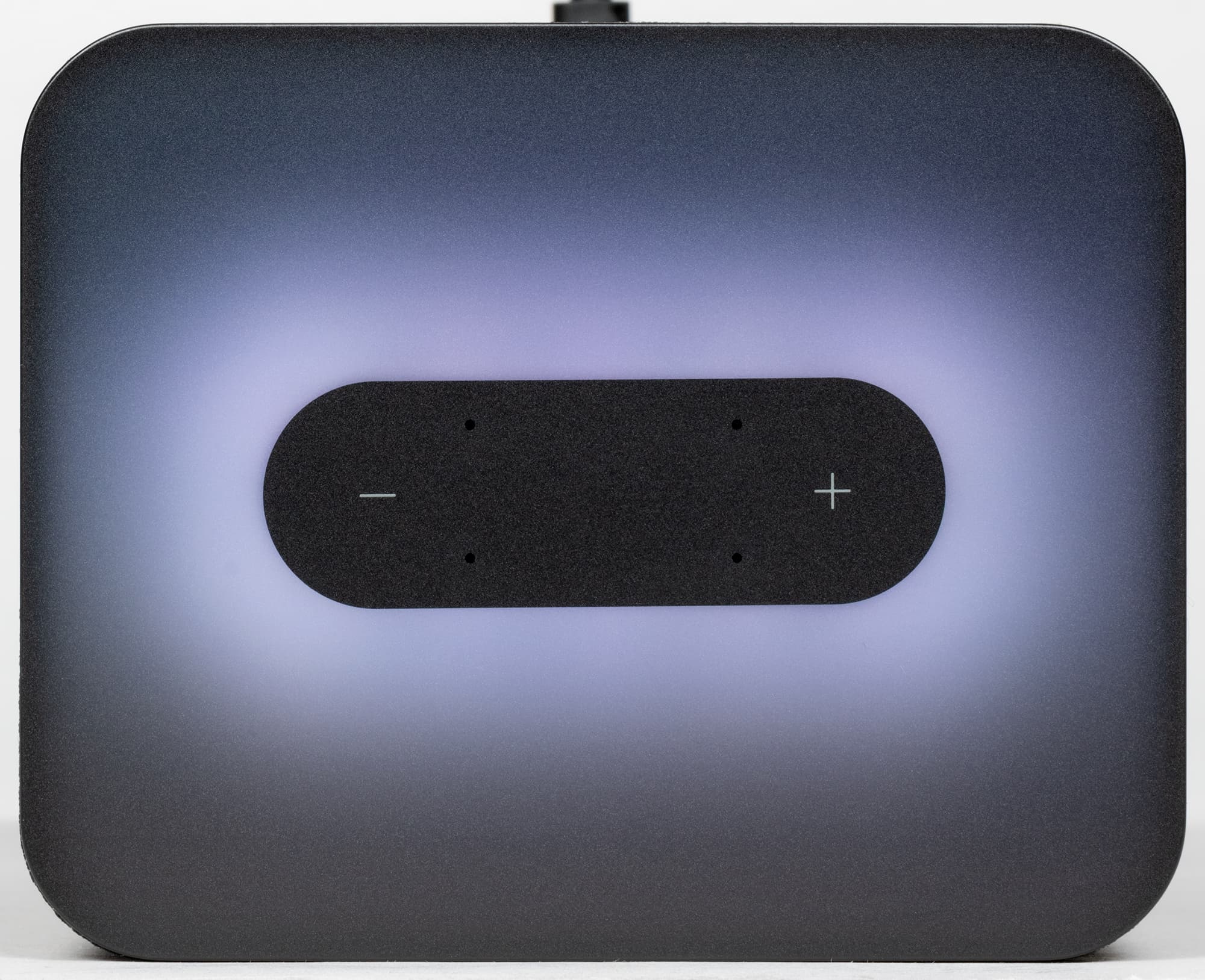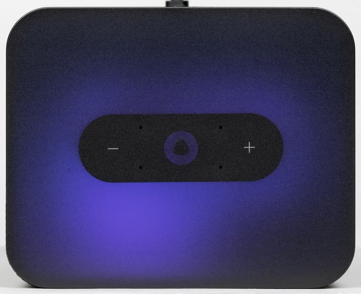 Возле кнопок видны отверстия четырех микрофонов, служащих для «общения» с голосовым ассистентом. Без подсветки панель выглядит очень минималистично и строго — просто черная матовая поверхность. Устойчивая, кстати, к появлению пятен от прикосновений.