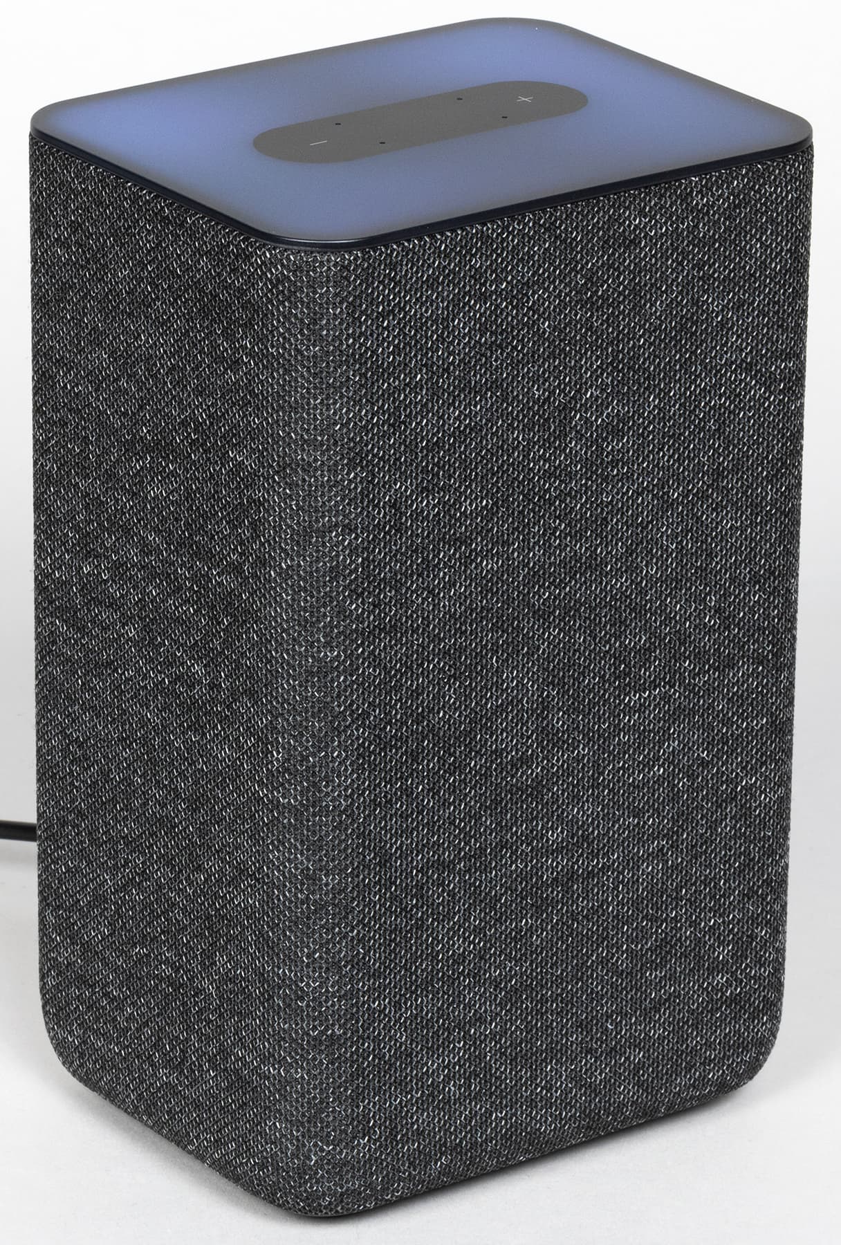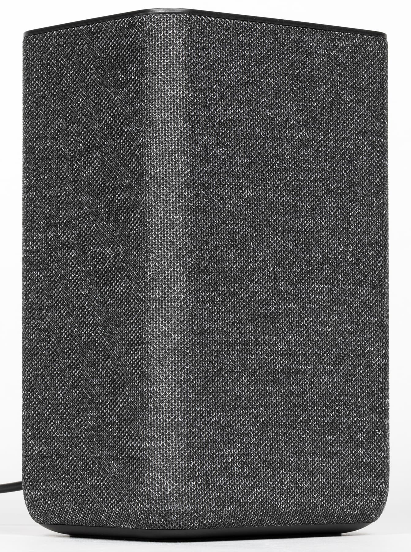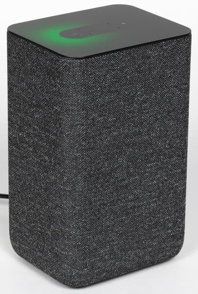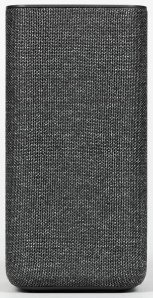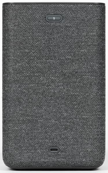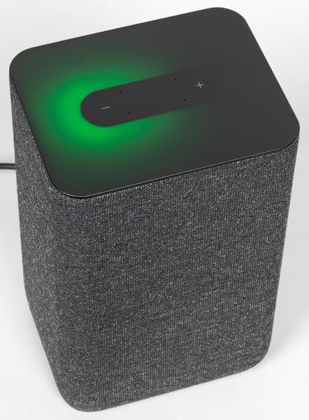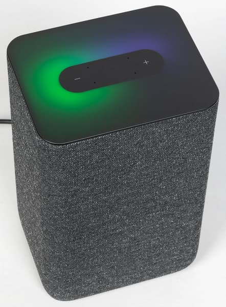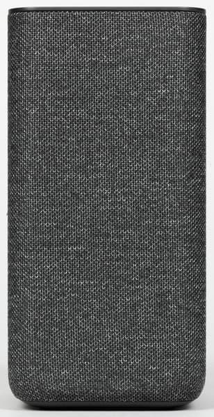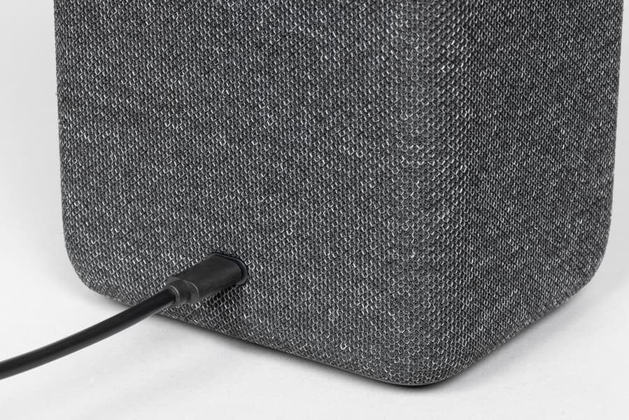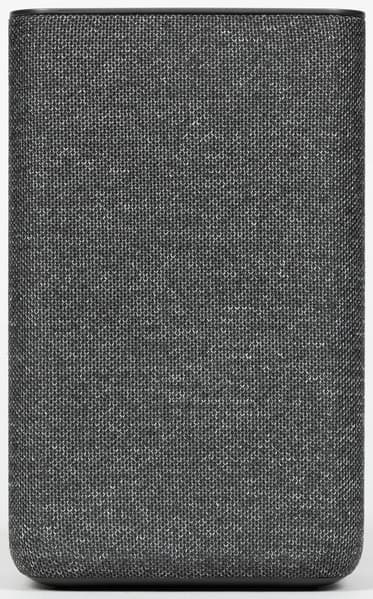 Колонка будет поставляться в четырех цветах: антрацит, кобальт, песочный и медный. Нам на тестирование достался первый — самый строгий и универсальный с точки зрения размещения в интерьере. Внешность у колонки на первый взгляд максимально лаконичная: просто обтянутый тканью прямоугольный параллелепипед.