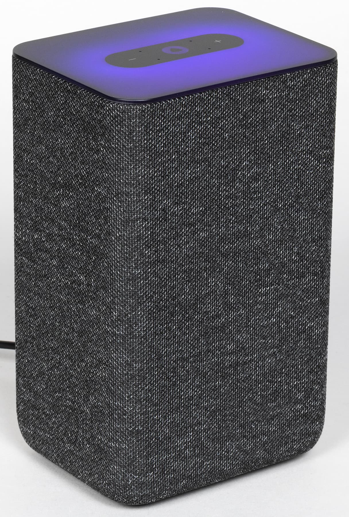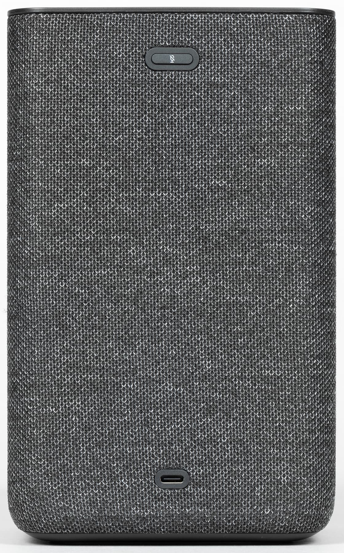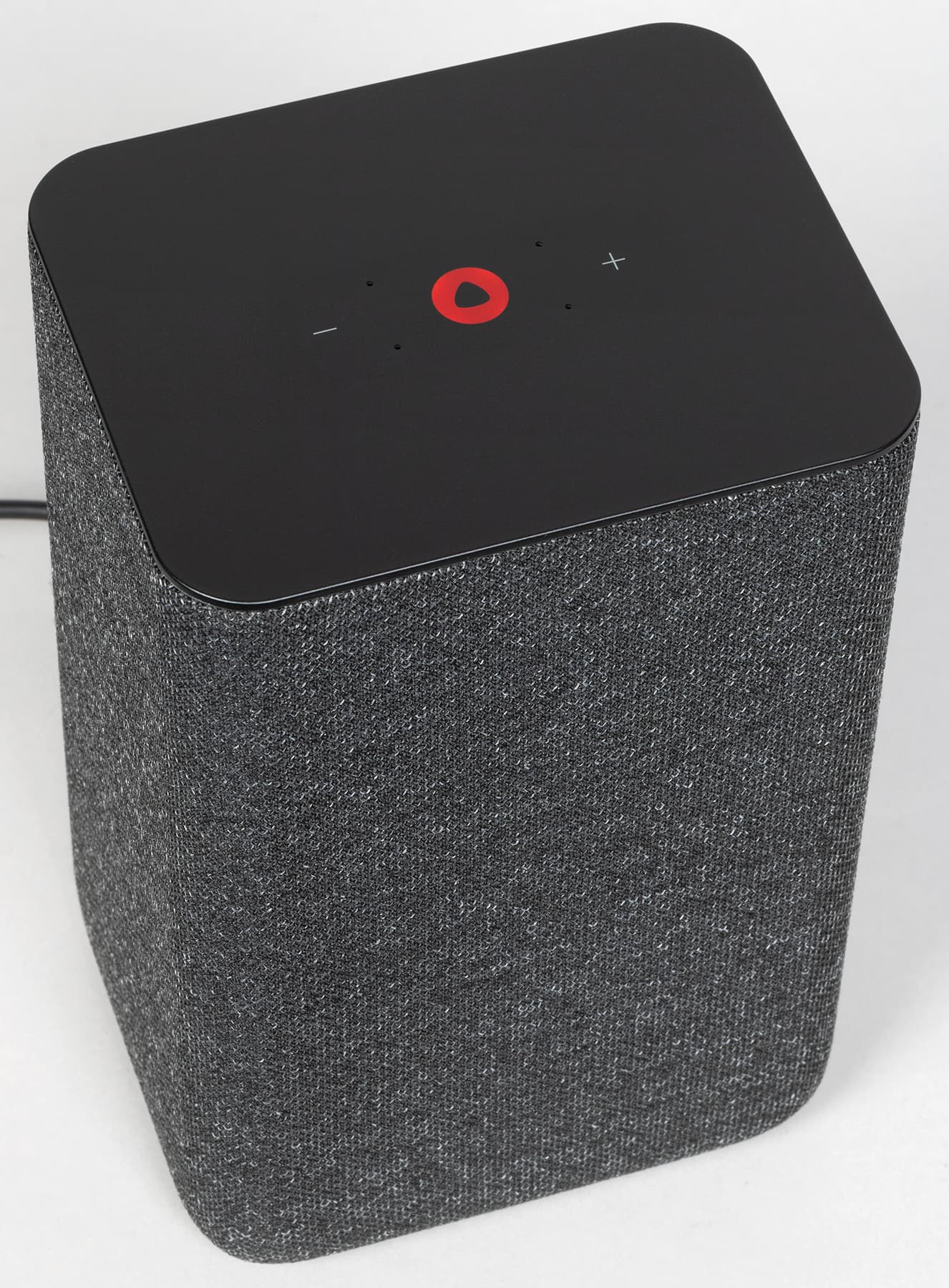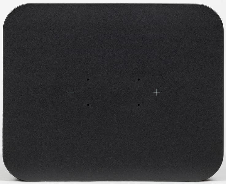 Колонка будет поставляться в четырех цветах: антрацит, кобальт, песочный и медный. Нам на тестирование достался первый — самый строгий и универсальный с точки зрения размещения в интерьере. Внешность у колонки на первый взгляд максимально лаконичная: просто обтянутый тканью прямоугольный параллелепипед.