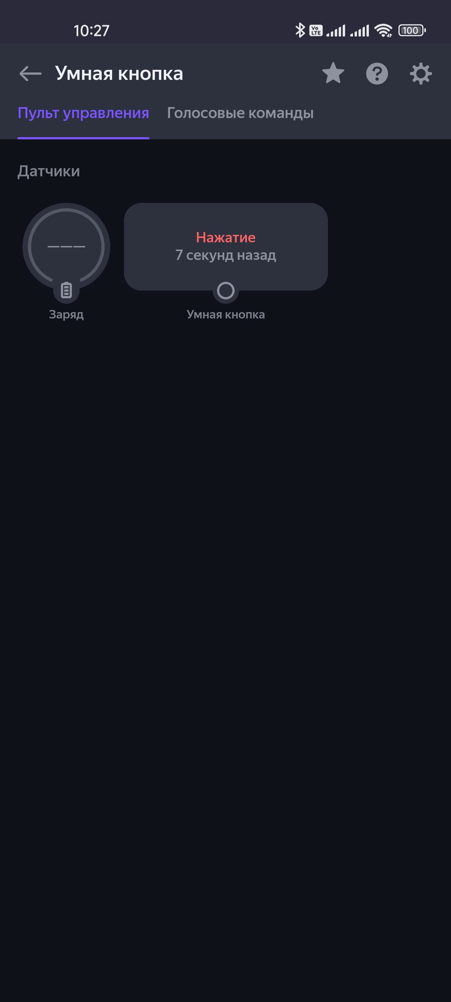 Про «умную» кнопку многого не скажешь. Это просто кнопка. На ее странице можно увидеть уровень заряда и время последнего срабатывания. А далее вновь добавляем сценарий.