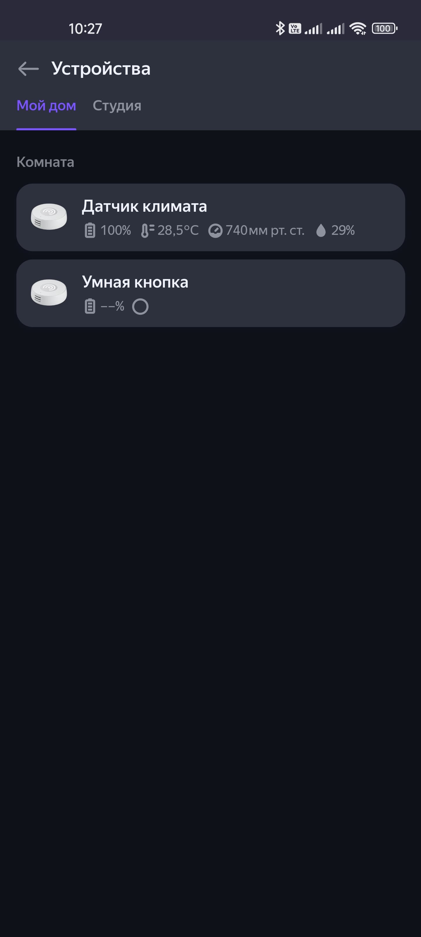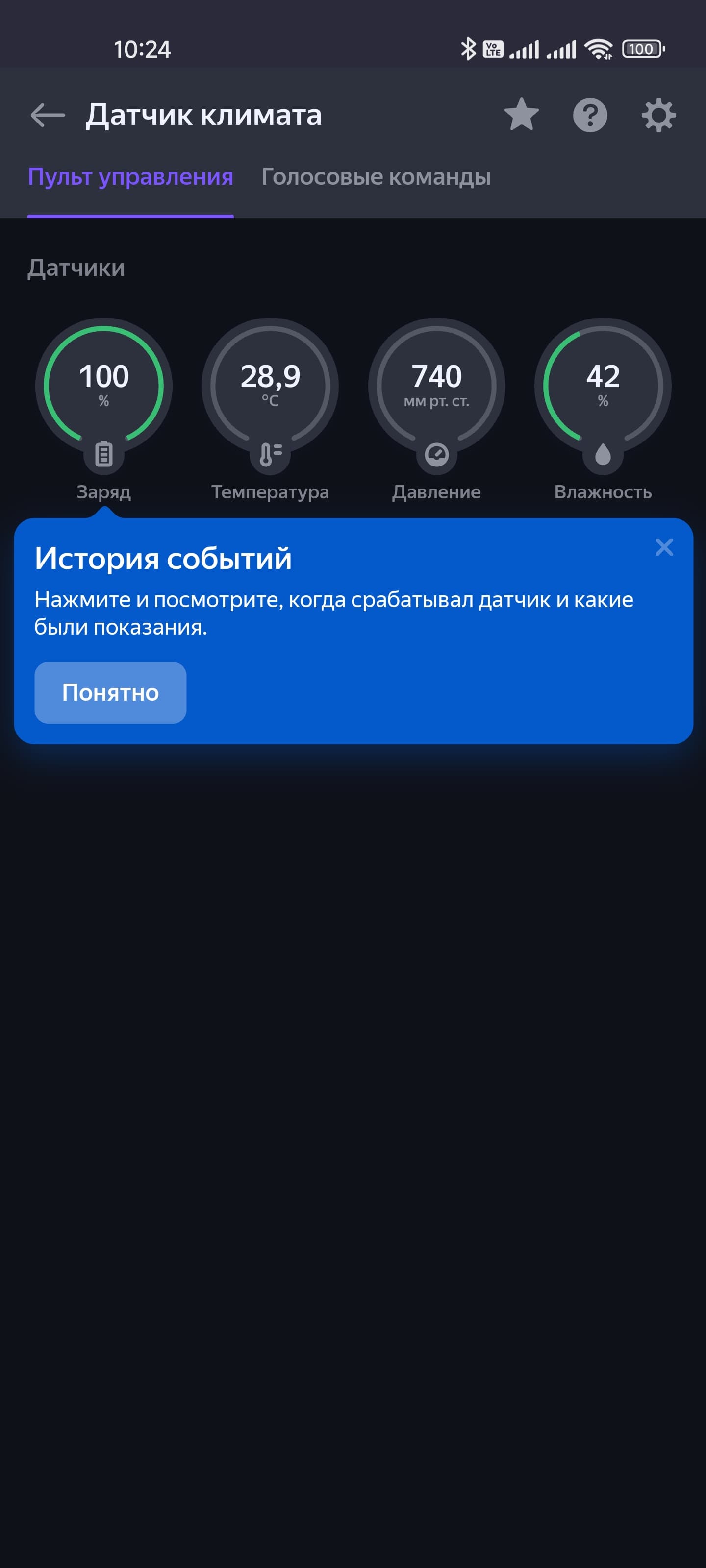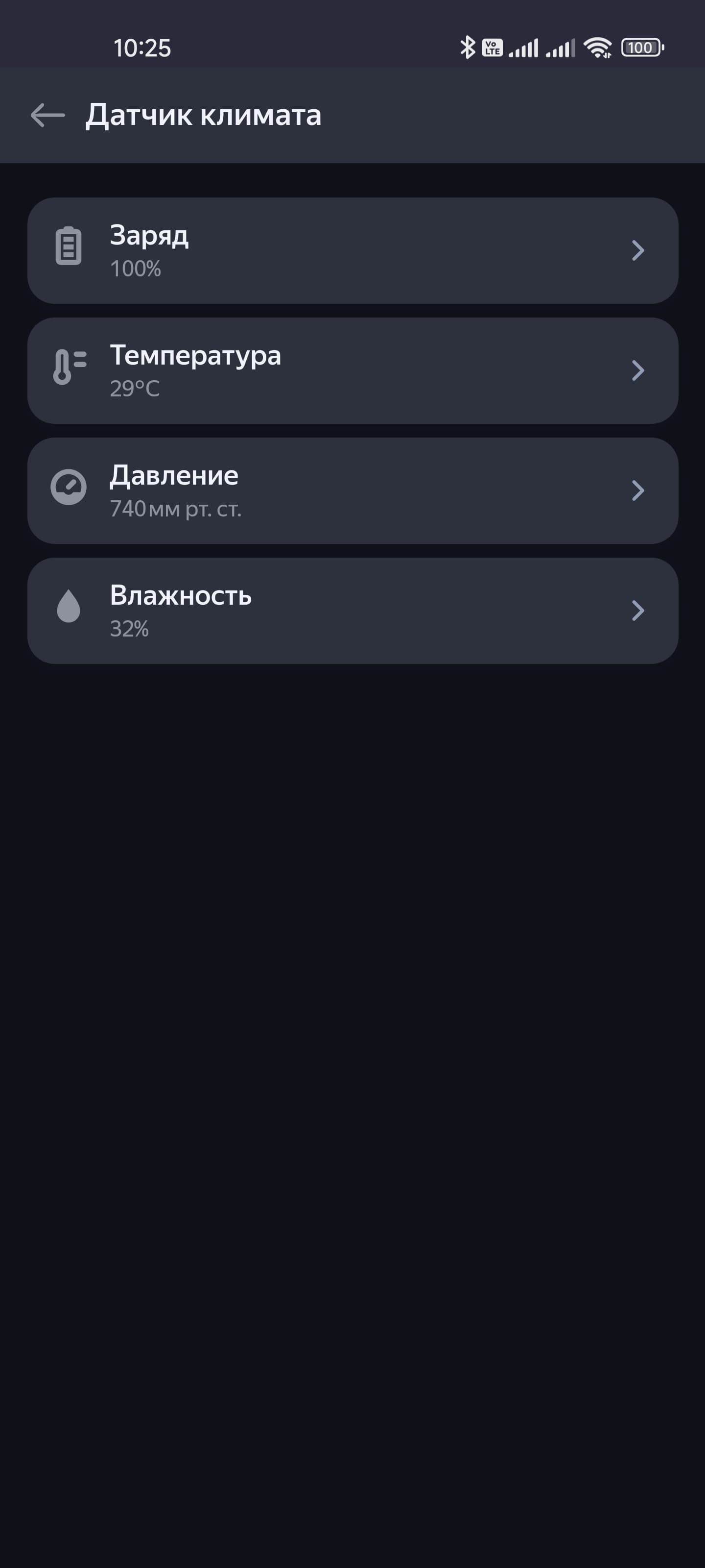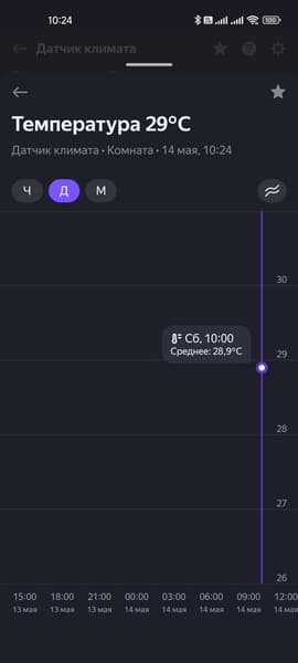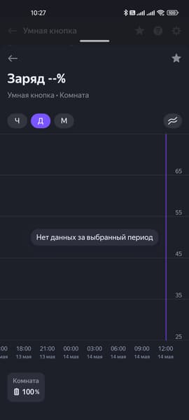 На странице подключенного датчика климата отображаются уровень его заряда, температура в комнате, а также влажность и давление. Все параметры сохраняются, их историю их изменения можно посмотреть на графике. Настройки все те же: имя, расположение и так далее…