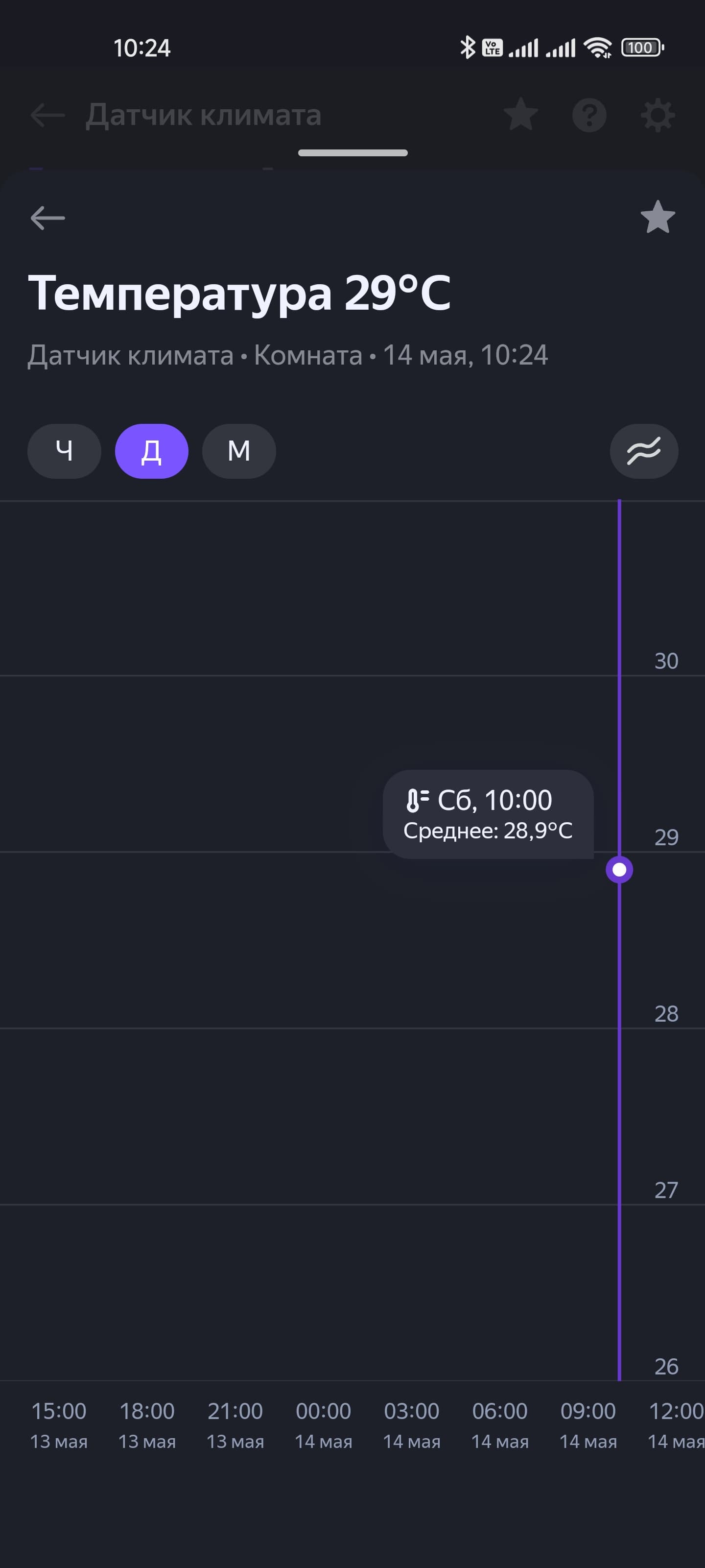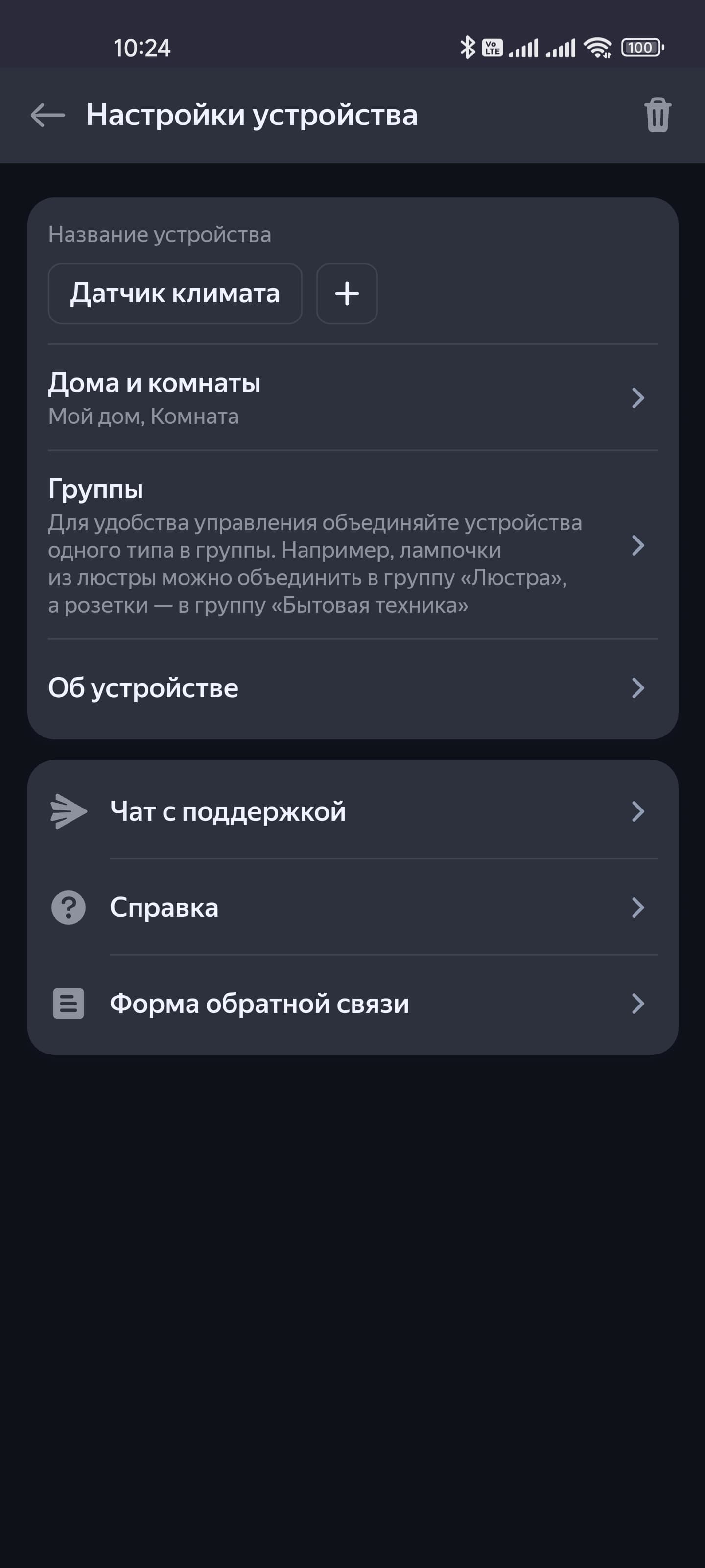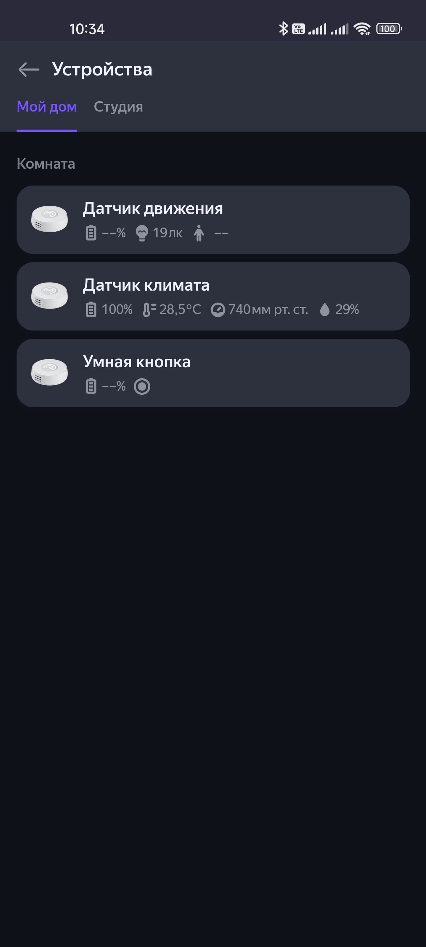 На странице подключенного датчика климата отображаются уровень его заряда, температура в комнате, а также влажность и давление. Все параметры сохраняются, их историю их изменения можно посмотреть на графике. Настройки все те же: имя, расположение и так далее…