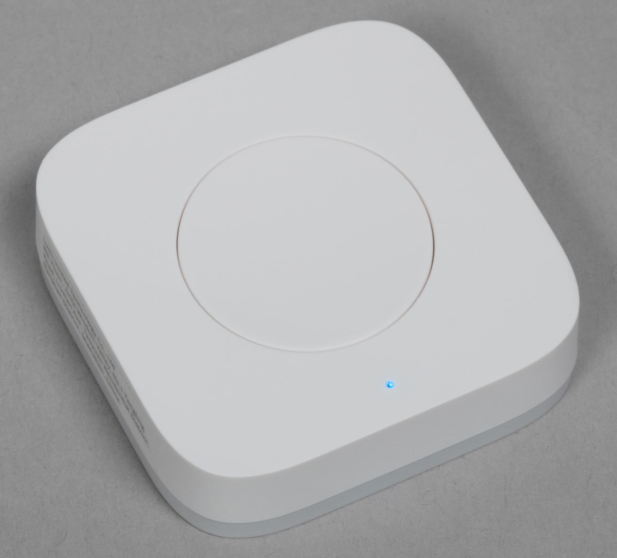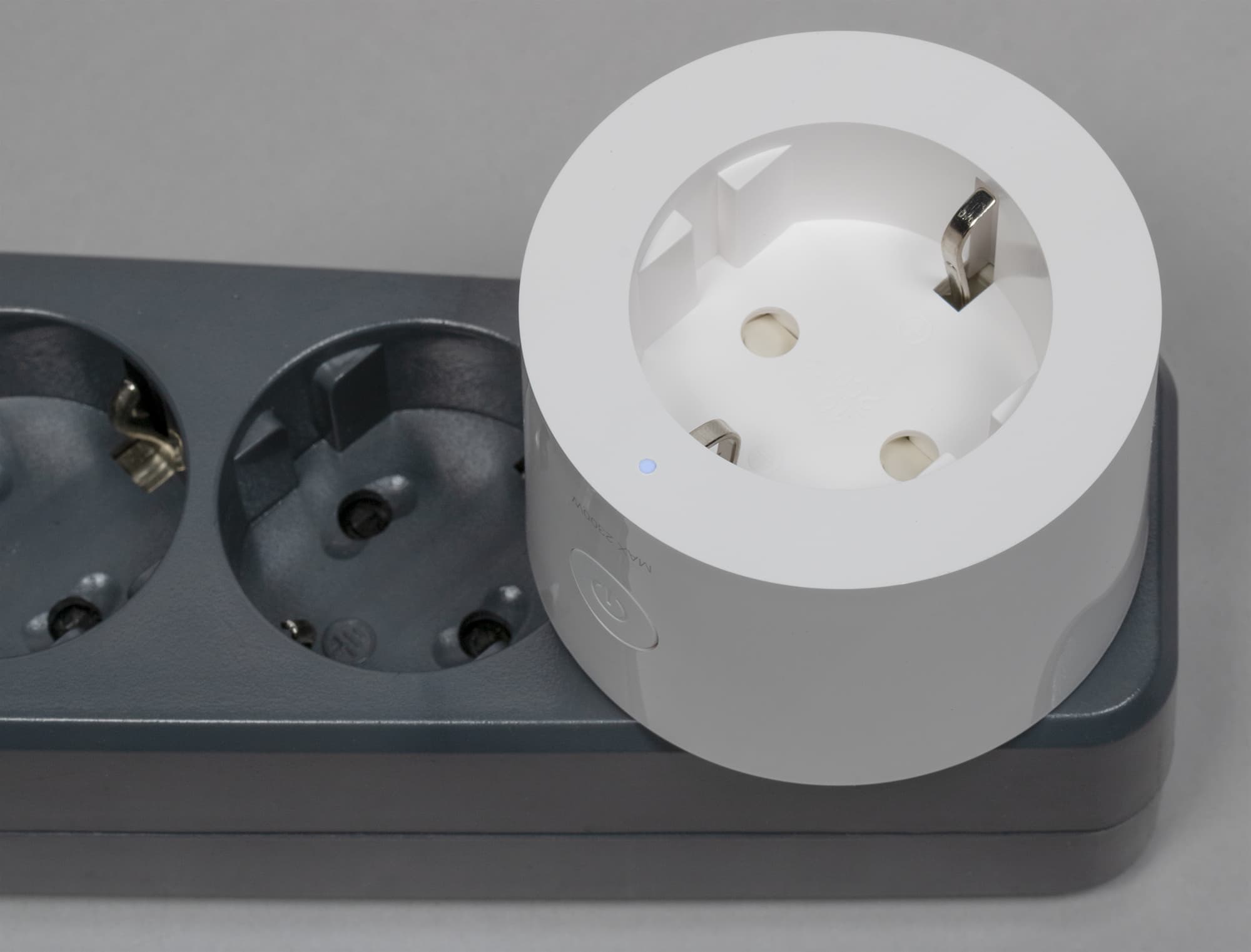 Диаметр у «умной» розетки довольно велик, при размещении в обычных розетках с несколькими гнездами она непременно закроет минимум пару. Но это беда подавляющего большинства таких устройств, тут уж ничего не поделаешь. В верхней части передней панели есть маленький индикатор работы, на боковой поверхности размещена кнопка включения, которая также отвечает за запуск сопряжения с хабом Zigbee.