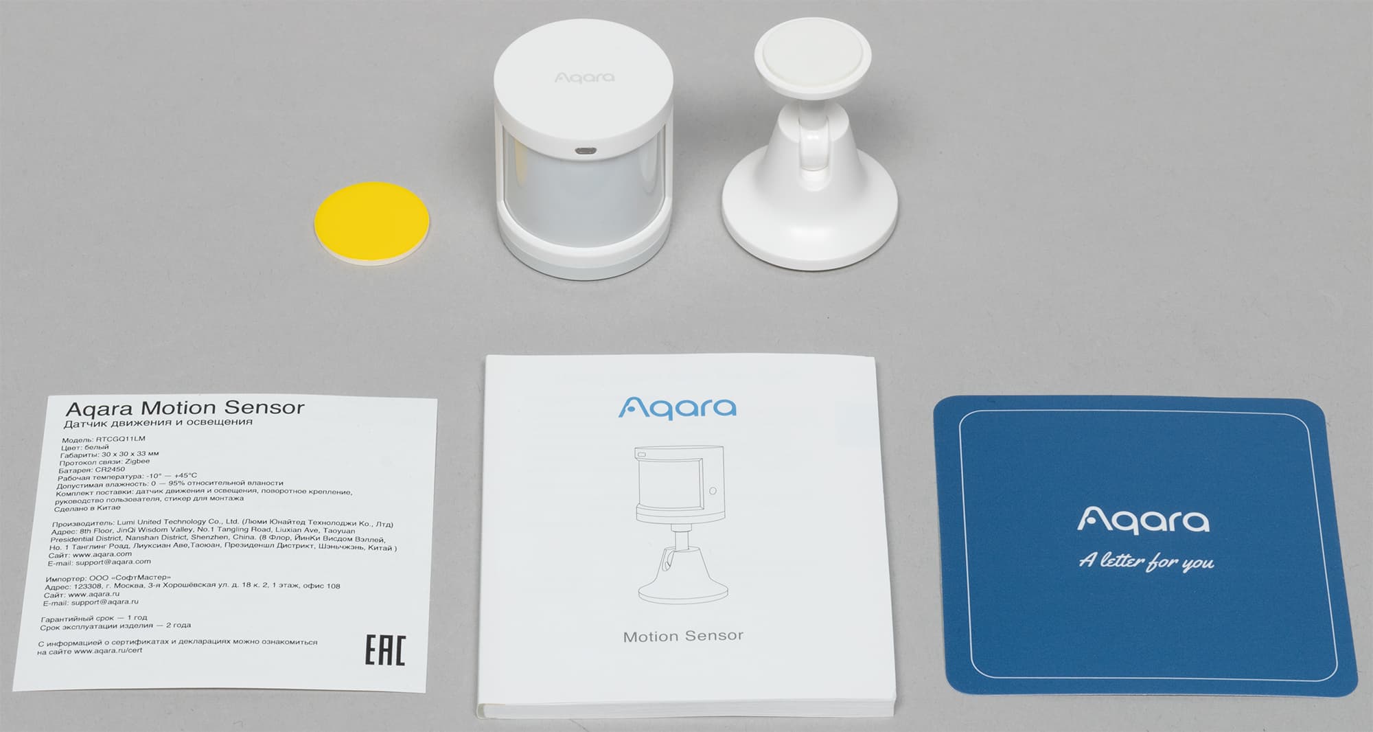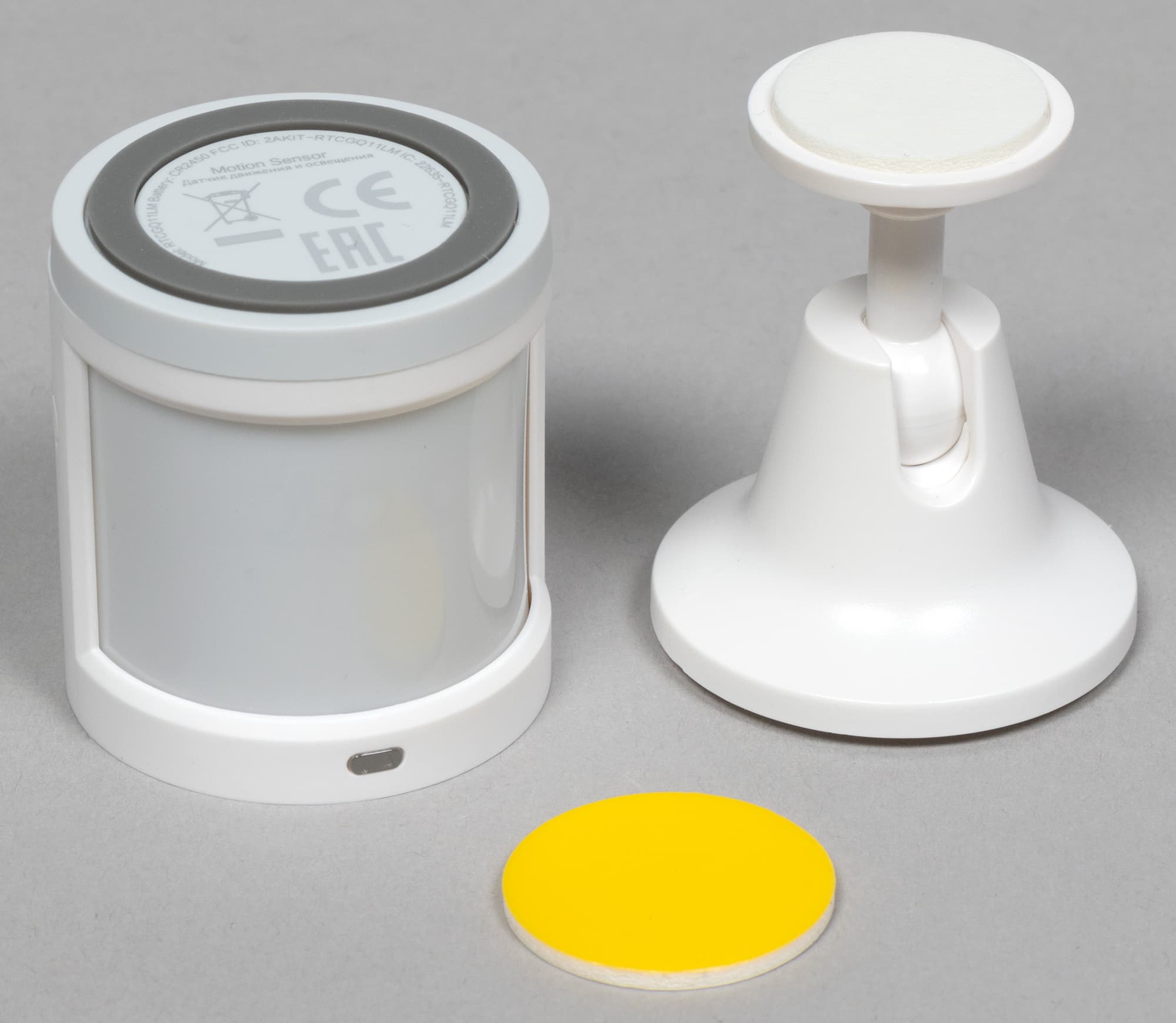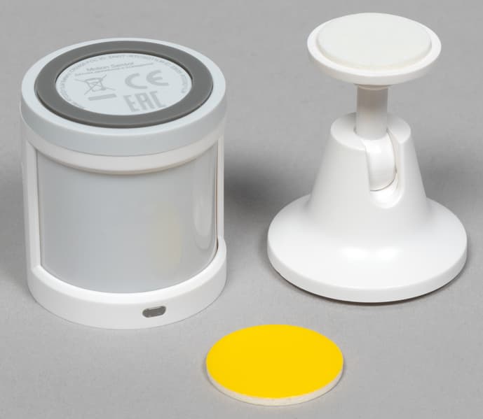 Датчик движения и освещенности также идет в комплекте со стойкой для его установки и круглым кусочком двустороннего скотча, призванным помочь в этом деле. Ну и плюс документация.