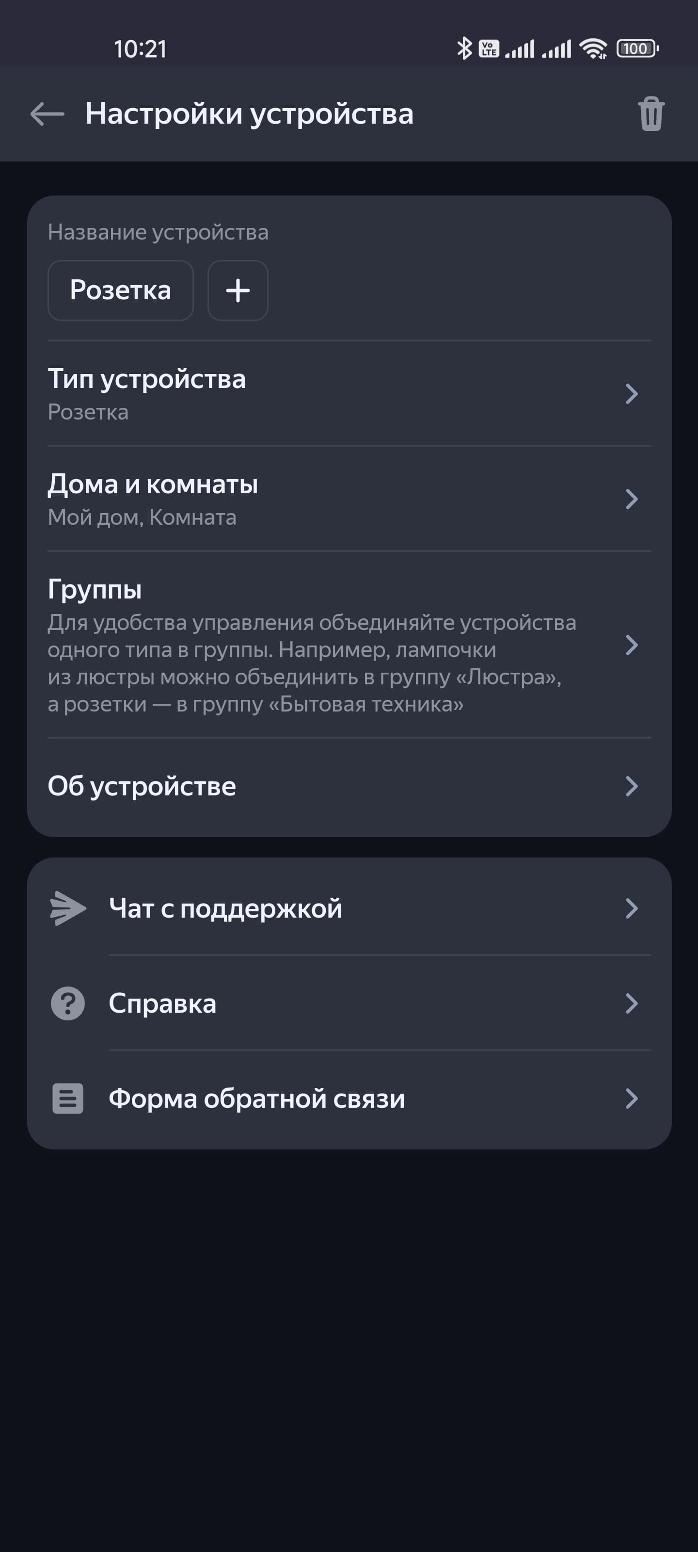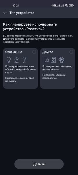В случае с розеткой можно еще выбрать тип использования, если выбрать опцию «Освещение», устройство автоматически будет добавлено в соответствующую группу. Но можно сделать это и позже вручную. Ну а далее — переходим на страницу устройства, где видим единственную кнопку — включения и выключения. На вкладке настроек можно изменить имя или добавить дополнительное, сменить тип, расположение, группу и так далее.