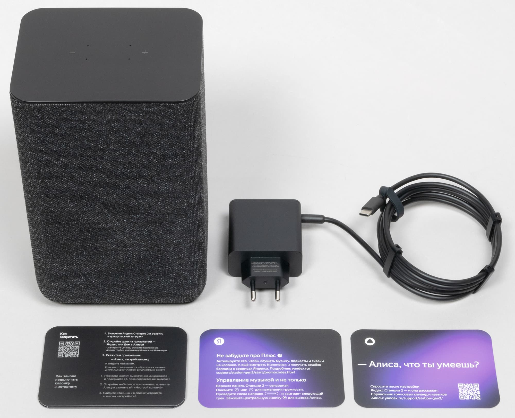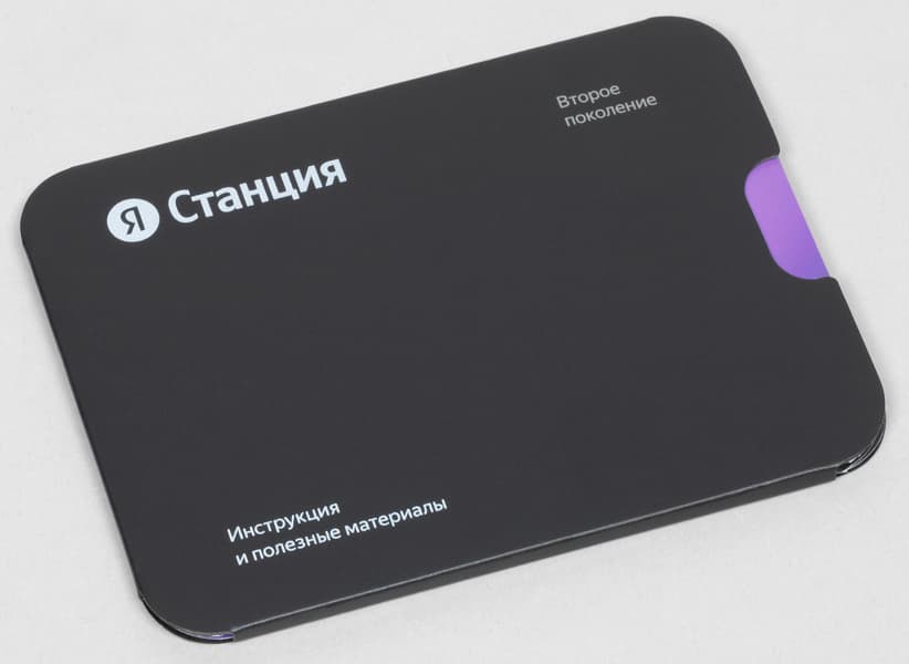 В комплект поставки входят сама «Яндекс Станция 2», блок питания для нее, а также различная документация.